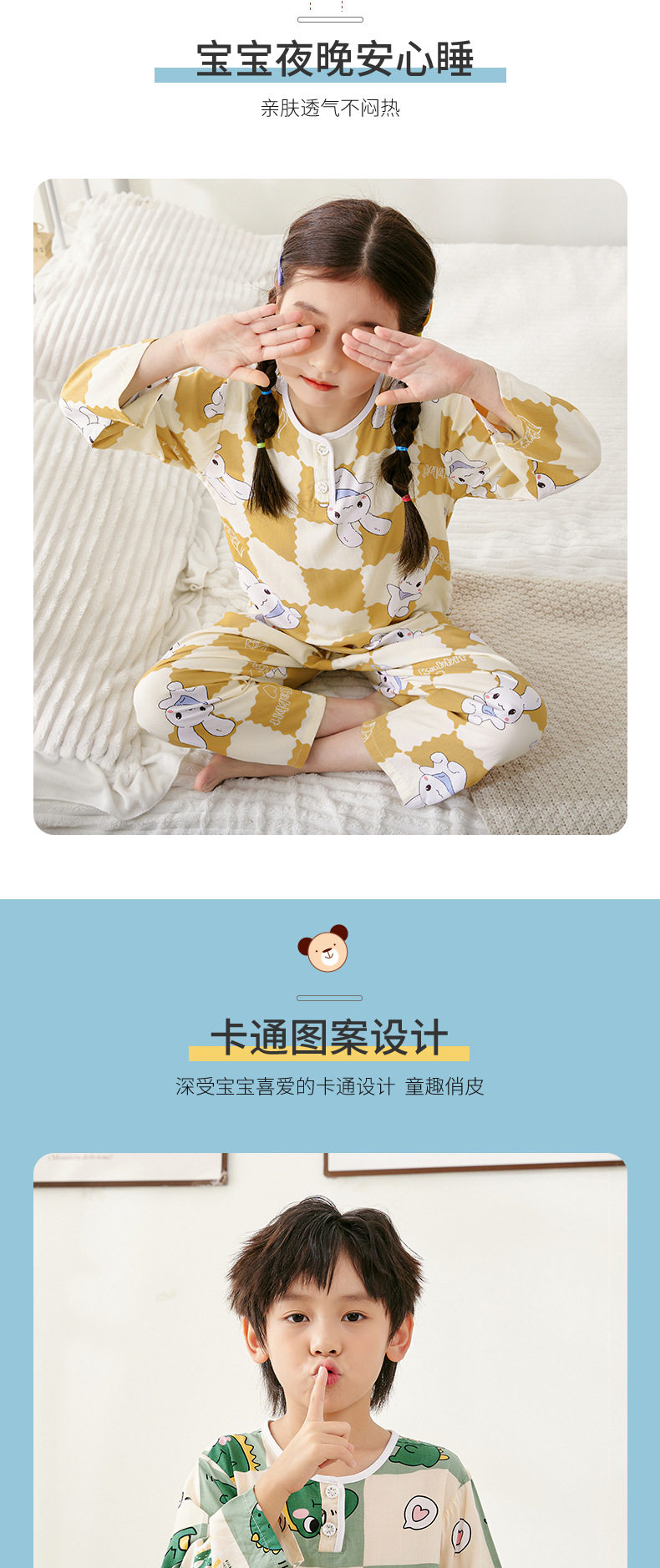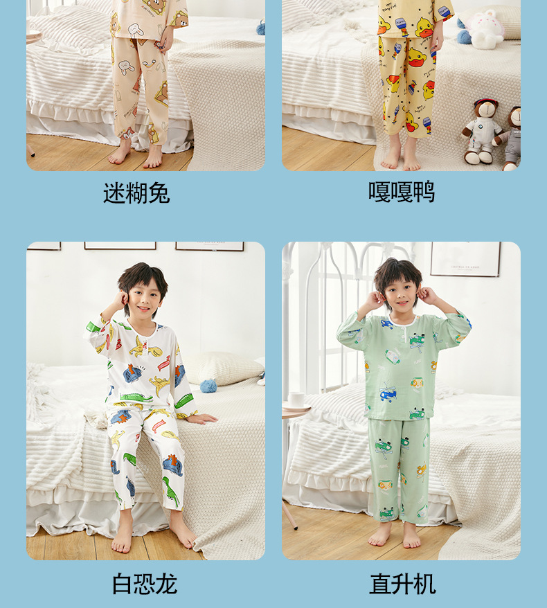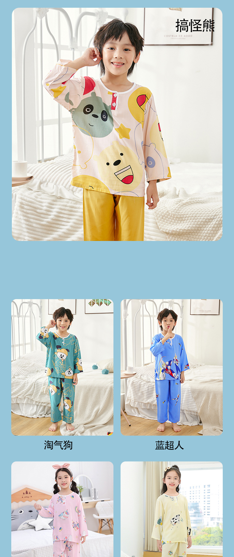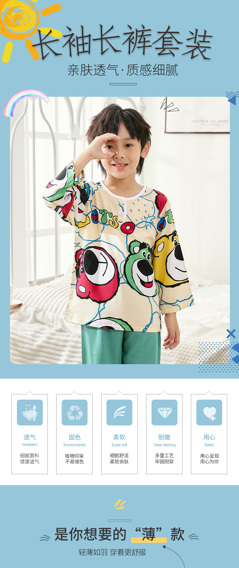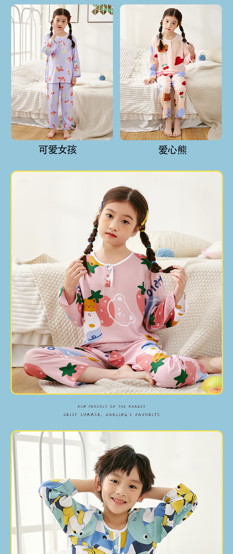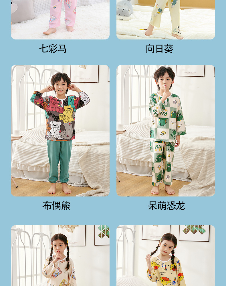 어린이 잠옷, 여름용 남아용 얇은 면 실크 긴팔 세트, 여아용 면 실크 중대형 아동용 인조면 홈웨어스토어 가기
