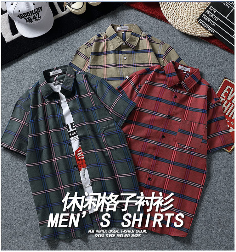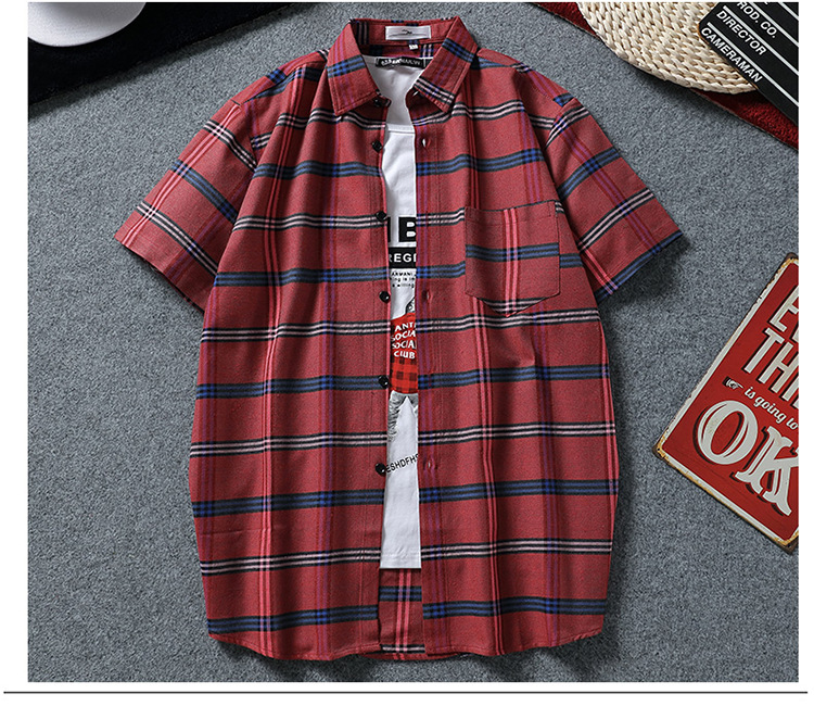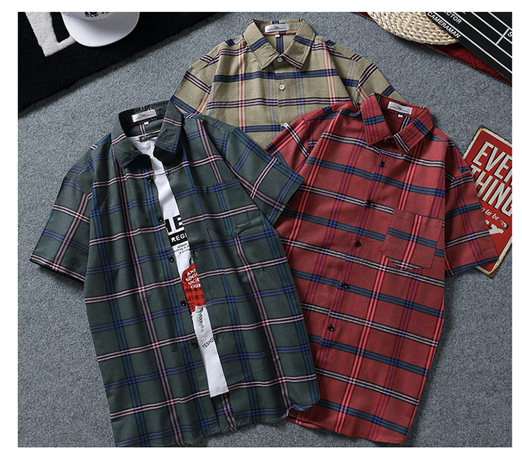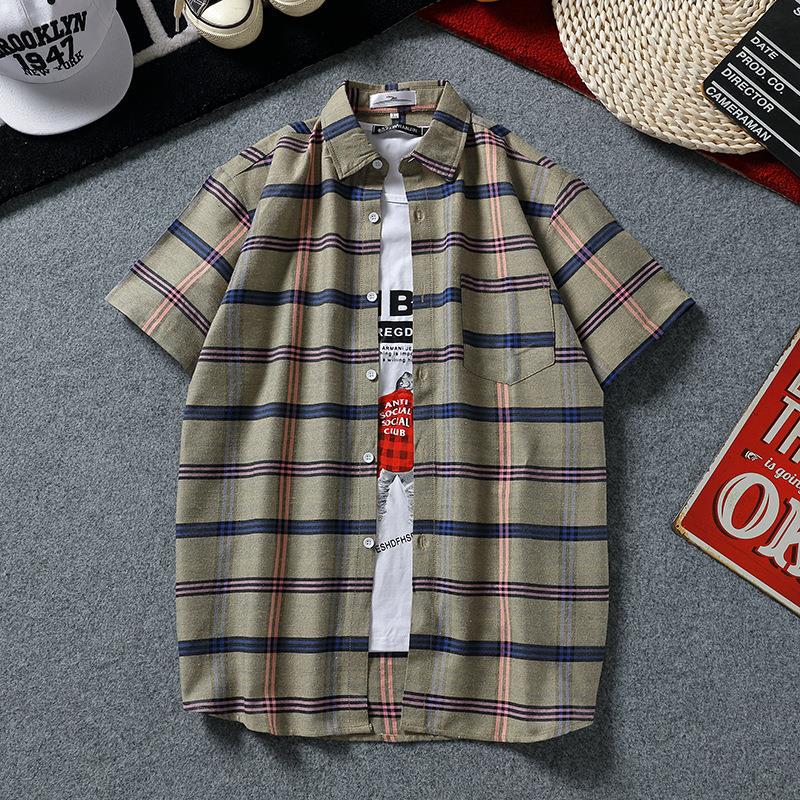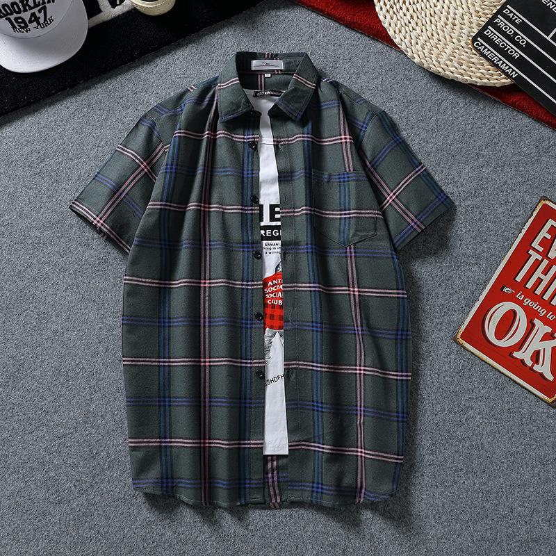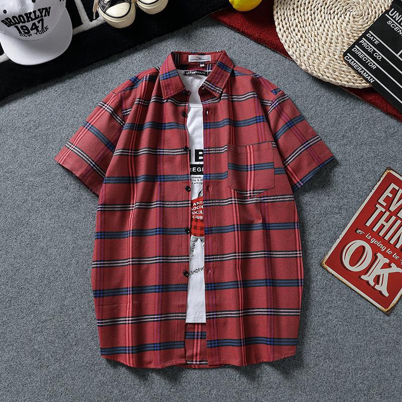 격자 무늬 셔츠 남성과 여성의 반팔 커플은 ulzzang Harajuku 스타일 학생 태양 보호 코트 인 슈퍼 인기 셔츠를 입습니다.스토어 가기