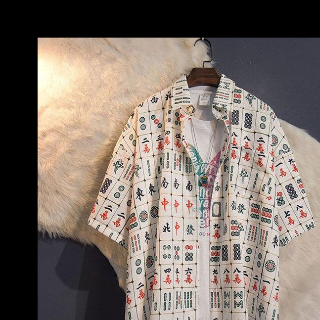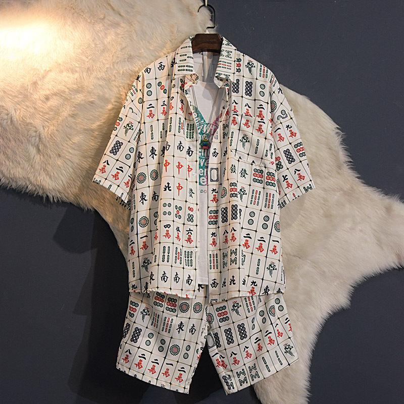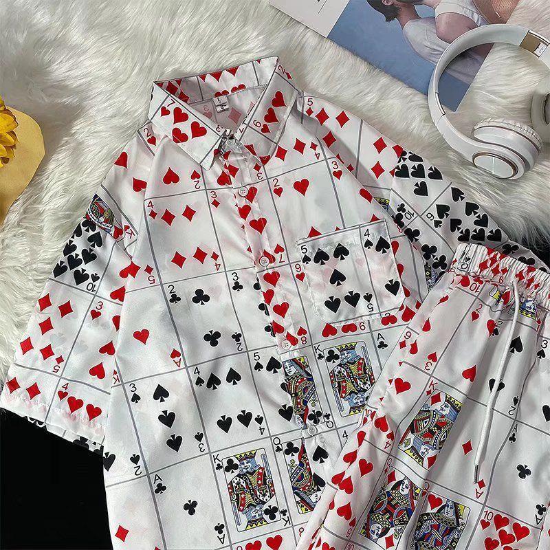 여름 새로운 패션 브랜드 포커 패턴 반팔 셔츠 세트 남성 반바지 셔츠 집주인 재미있는 옷스토어 가기