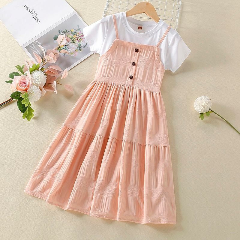 소녀 원피스 2024 새로운 가짜 투피스 서양식 소녀 여름 원피스 어린이 원피스 공주 원피스 어린 소녀
