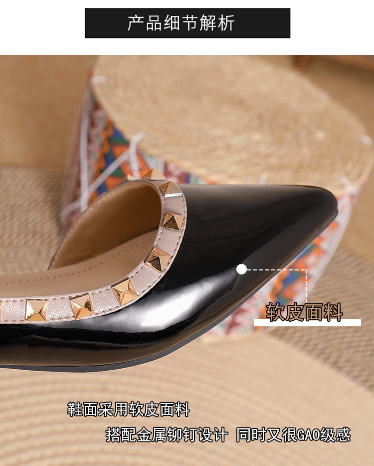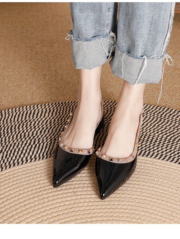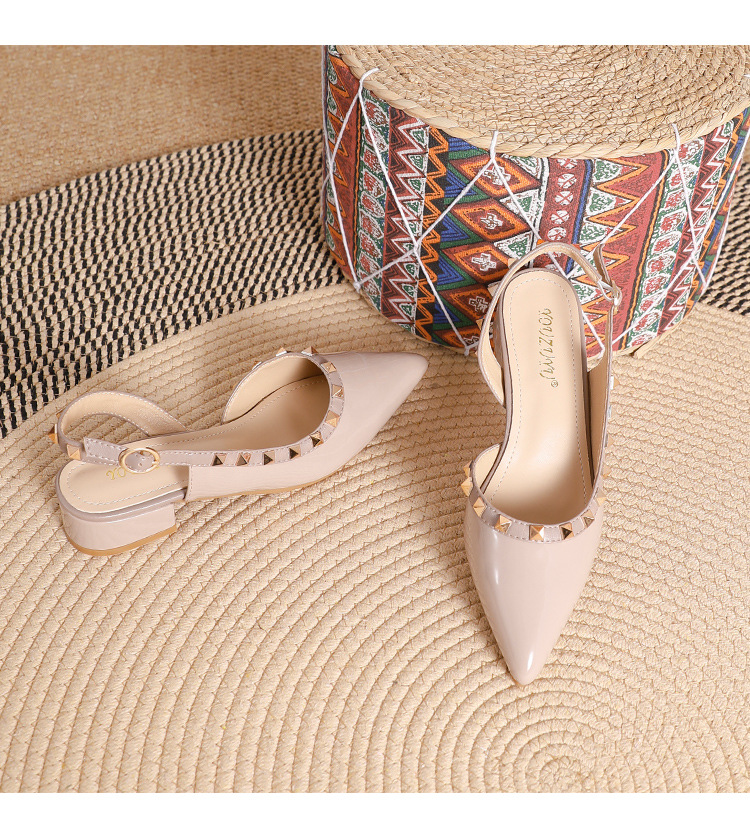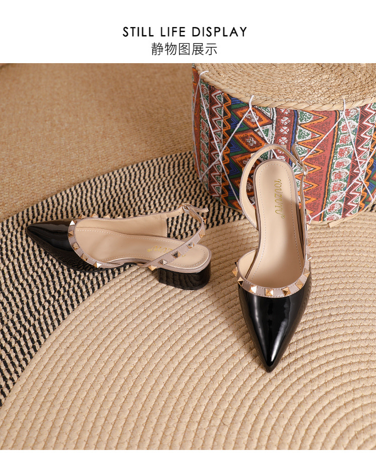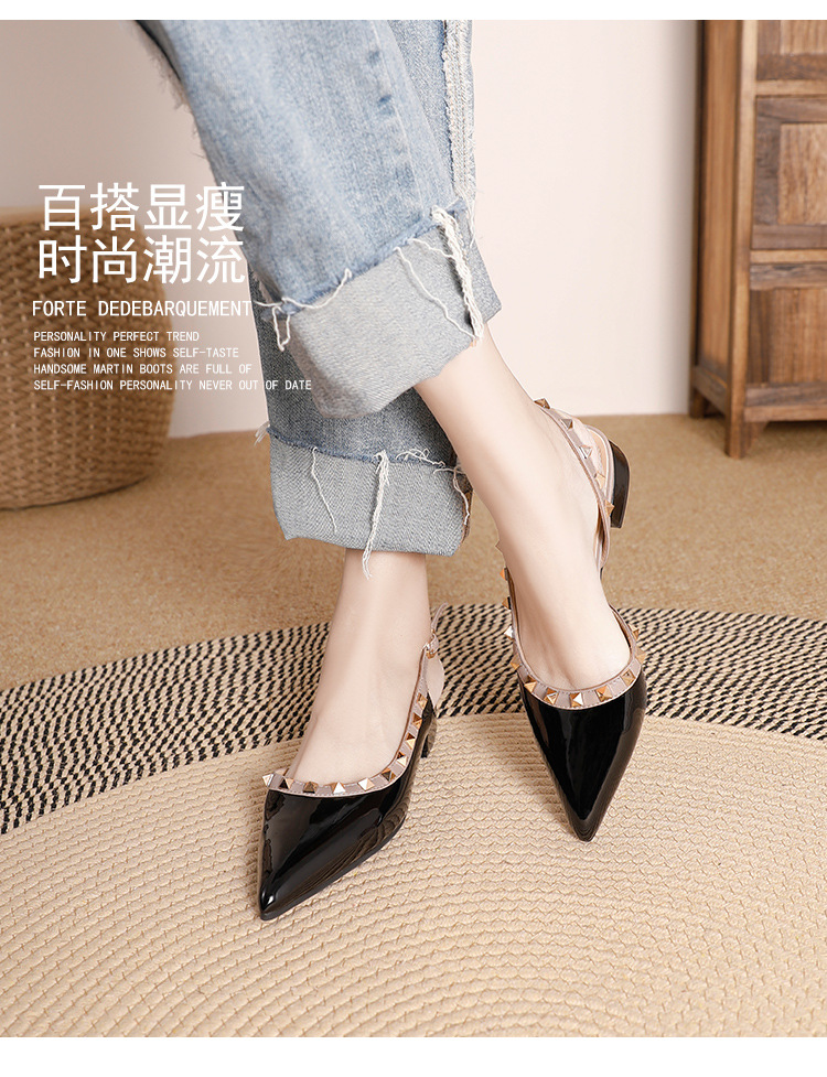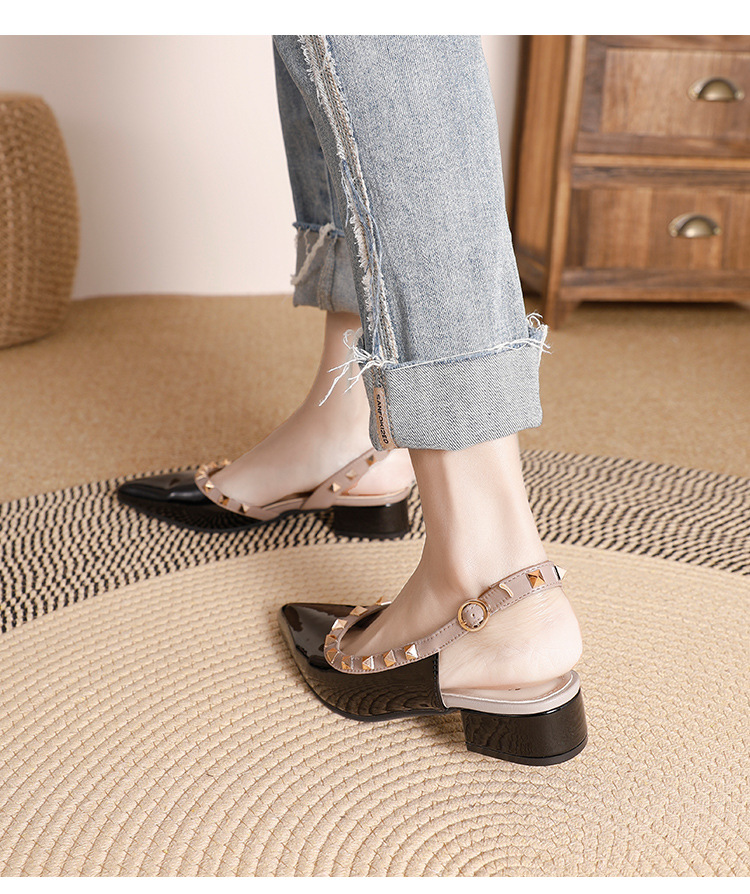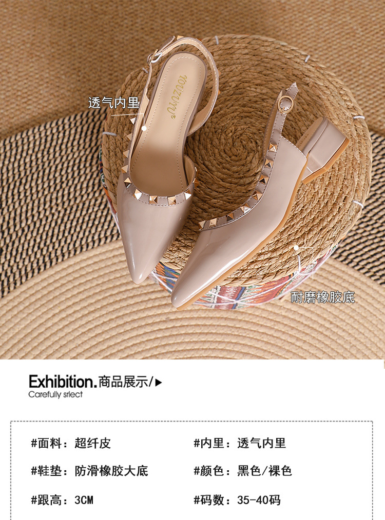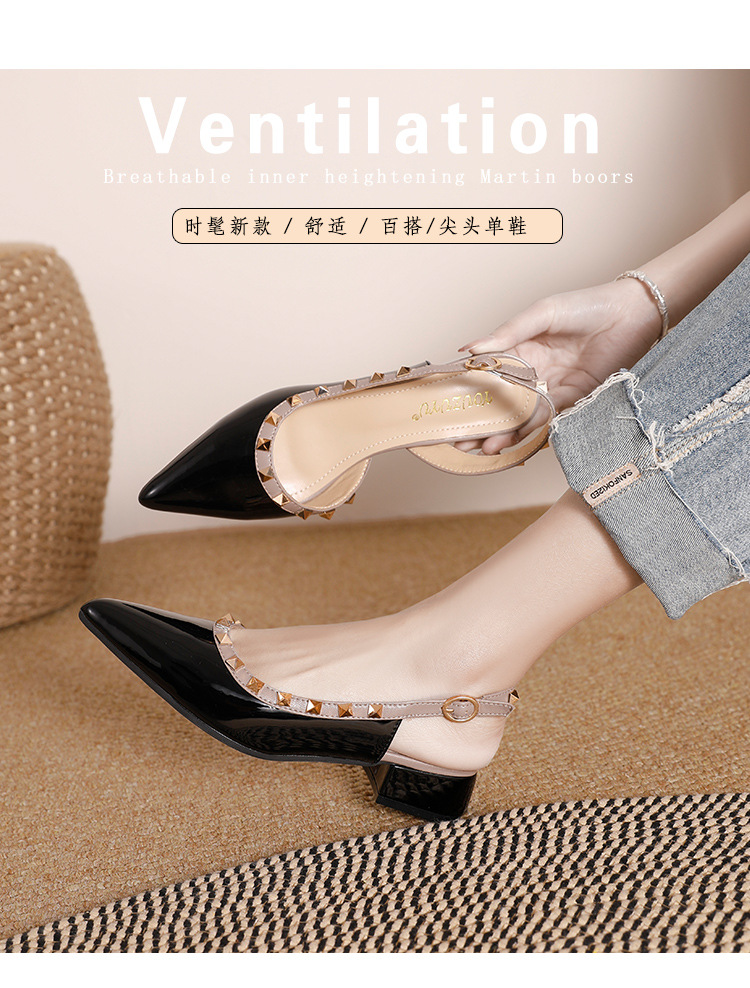 바오터우 샌들 여성용 2024 여름 신상품 다용도 프렌치 스타일 두꺼운 굽 뾰족한 앞코 미드힐 뒤트임 리벳 싱글 슈즈 여성용 하이힐