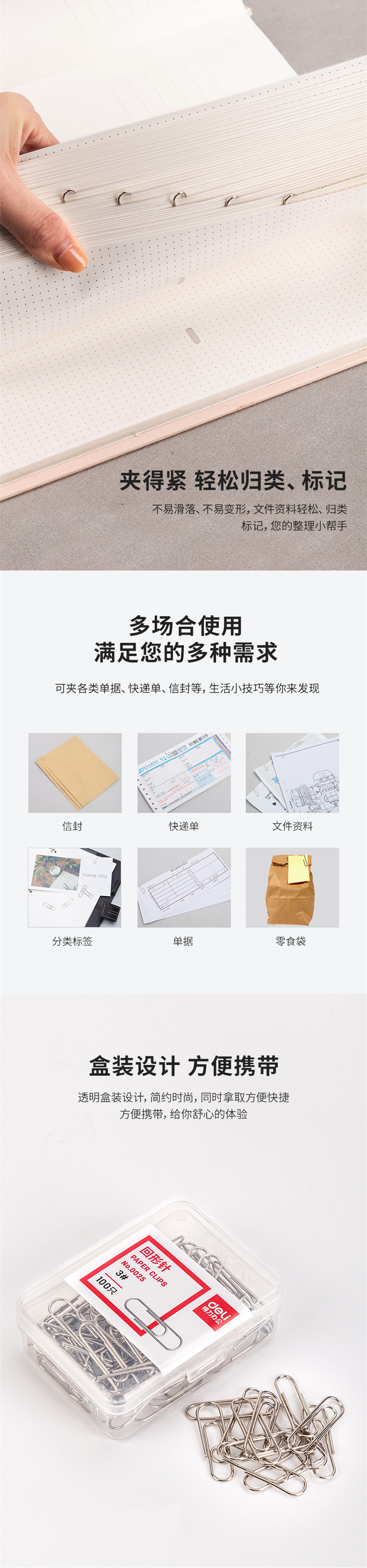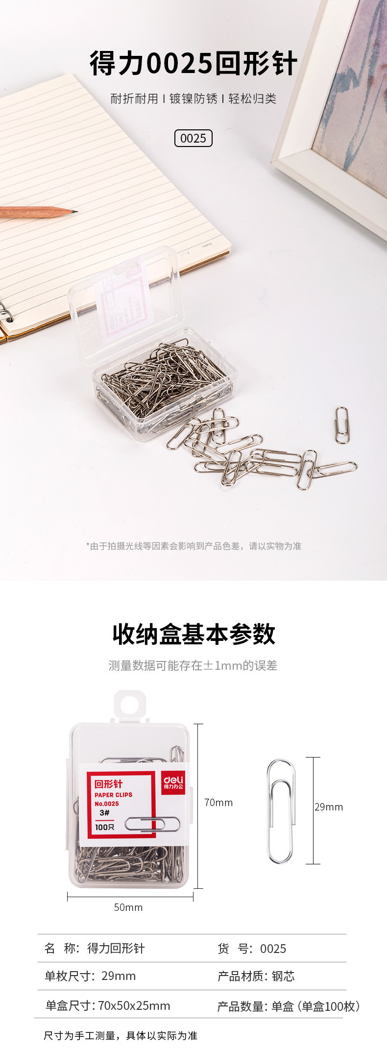 델리 0025 종이 클립 실버 종이 클립 사무실 정보 파일 분류 저장 고정 핀 100 pcs/box