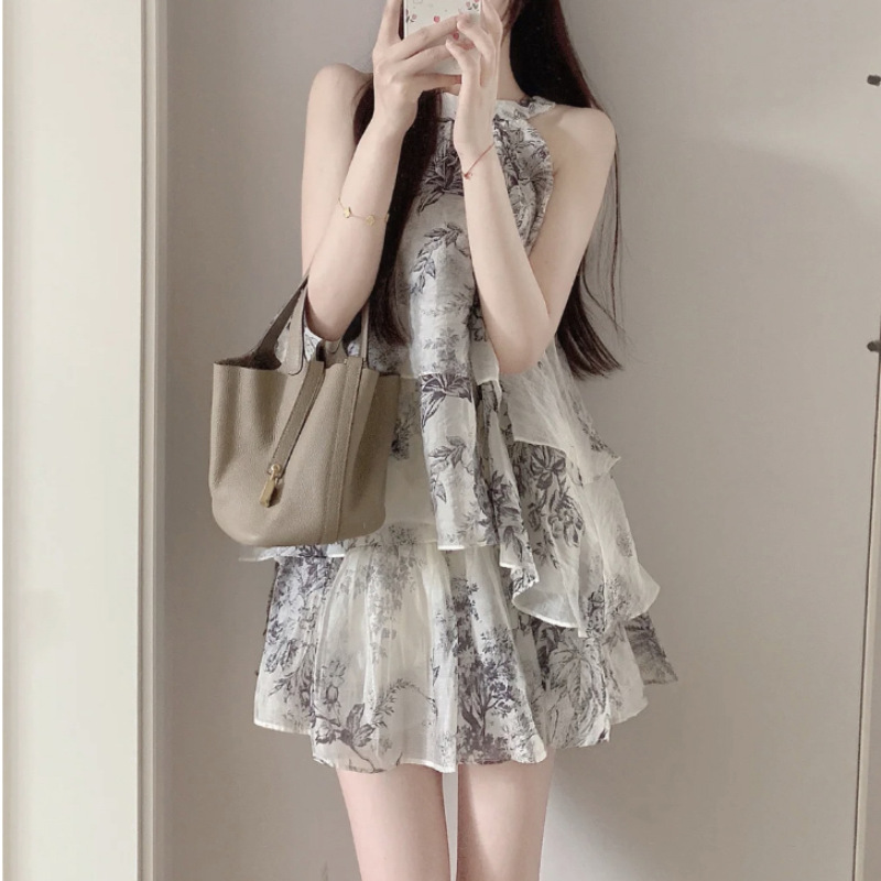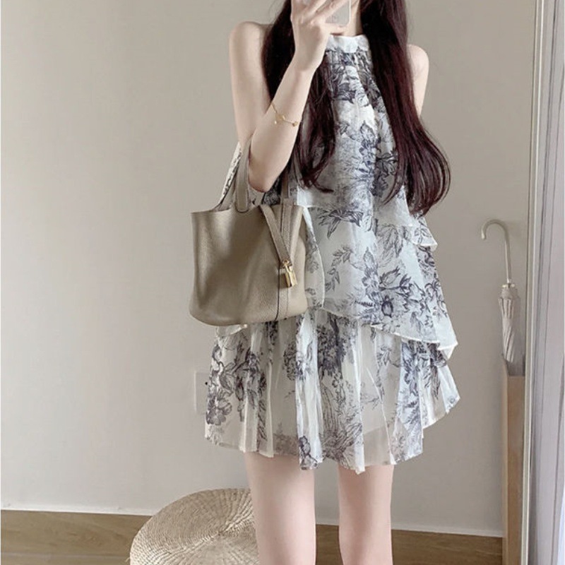 2025 새로운 여름 스타일 잉크 프린트 홀터넥 민소매 탑 + 스커트 투피스 레이디 스타일 슈트 트렌드