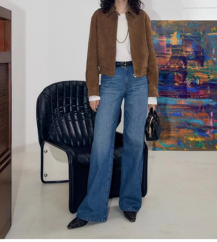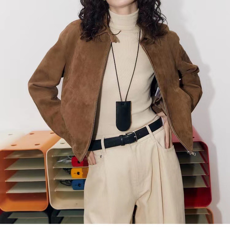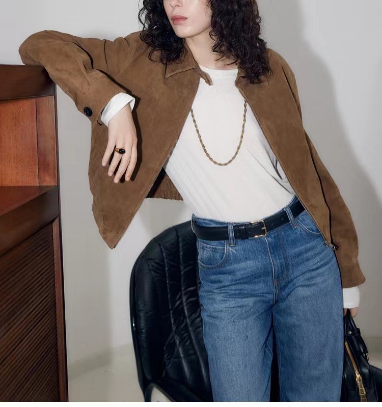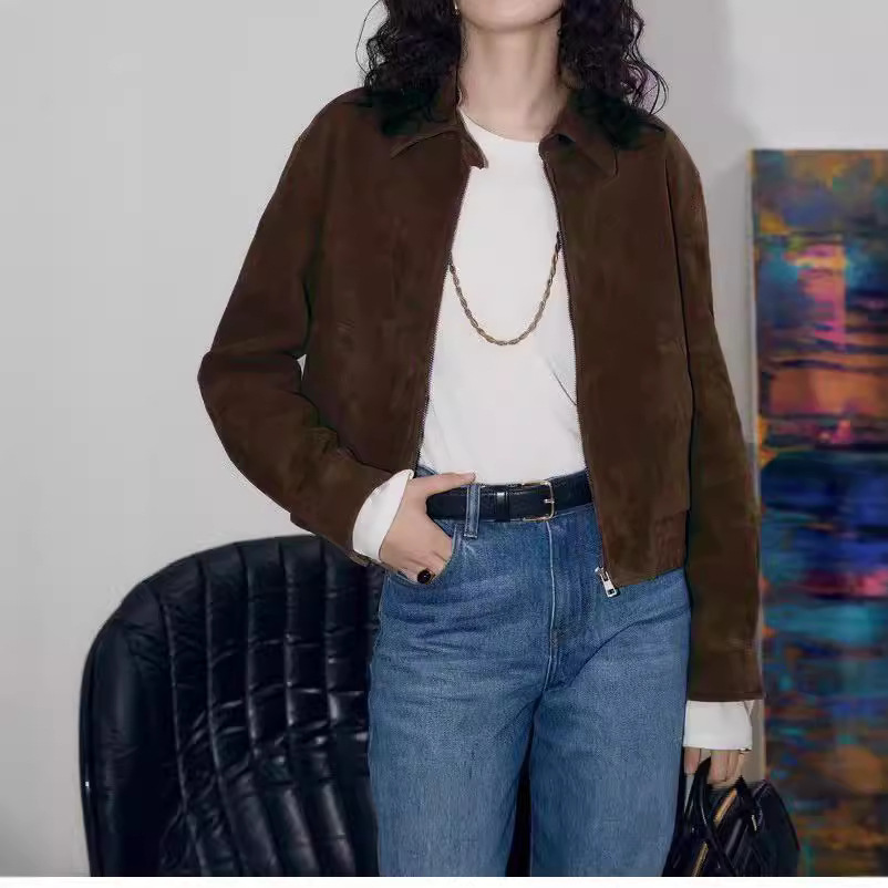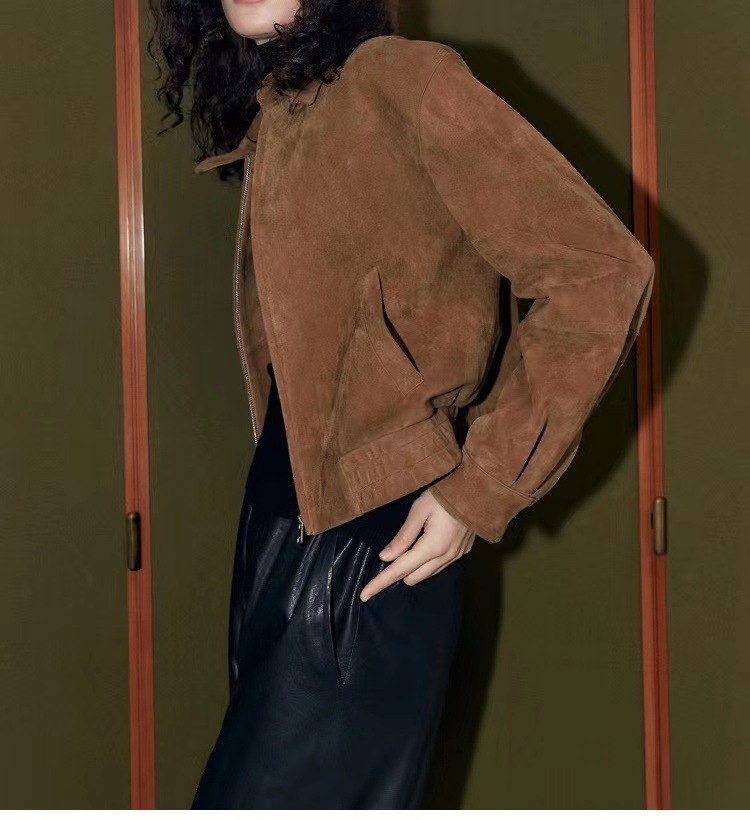 정품 가죽 자켓 HN22382 봄과 가을 메일라드 첫 번째 레이어 염소 스웨이드 올드 머니 스타일 짧은 스웨이드 여성 자켓스토어 가기