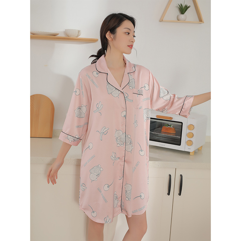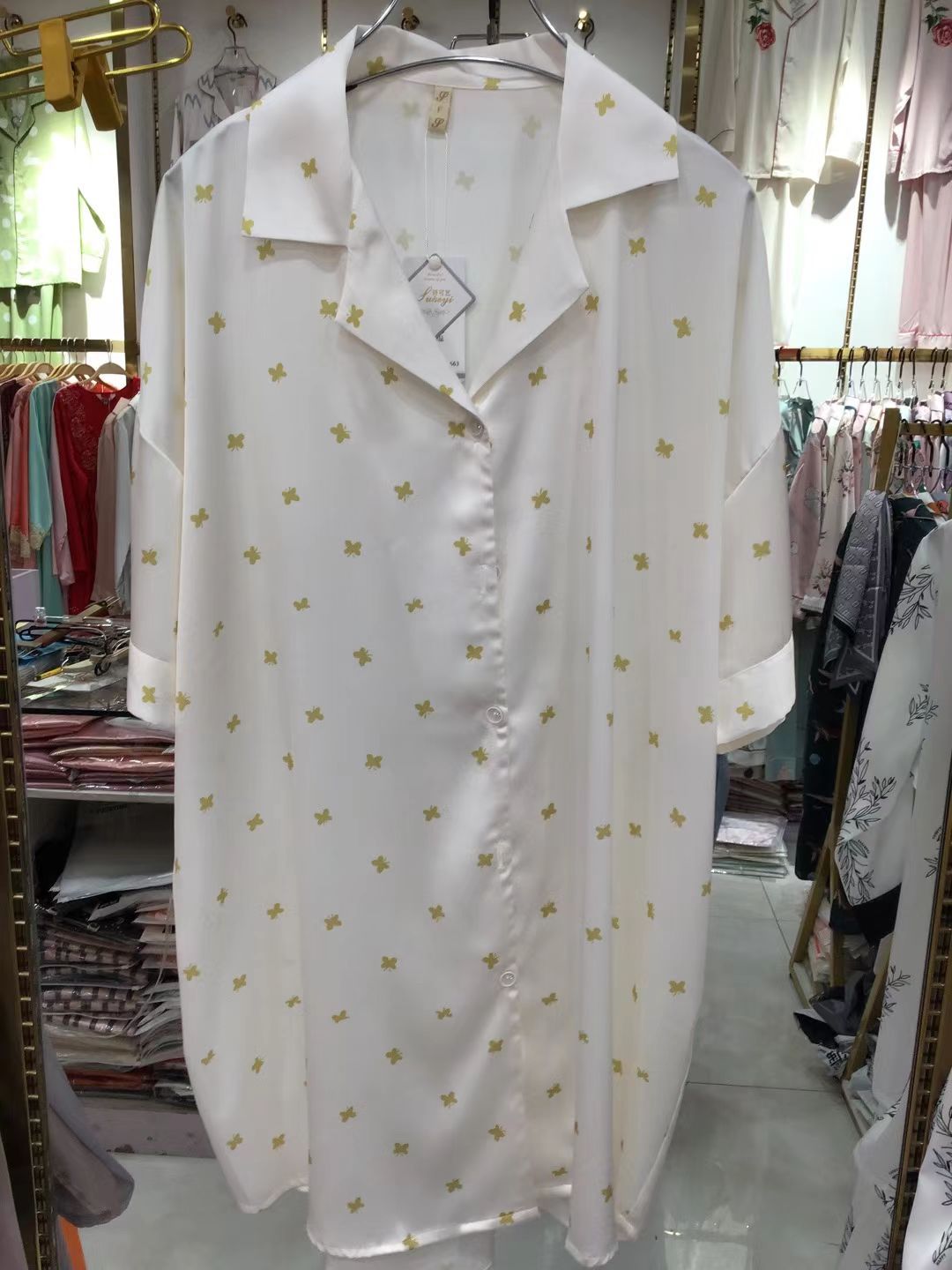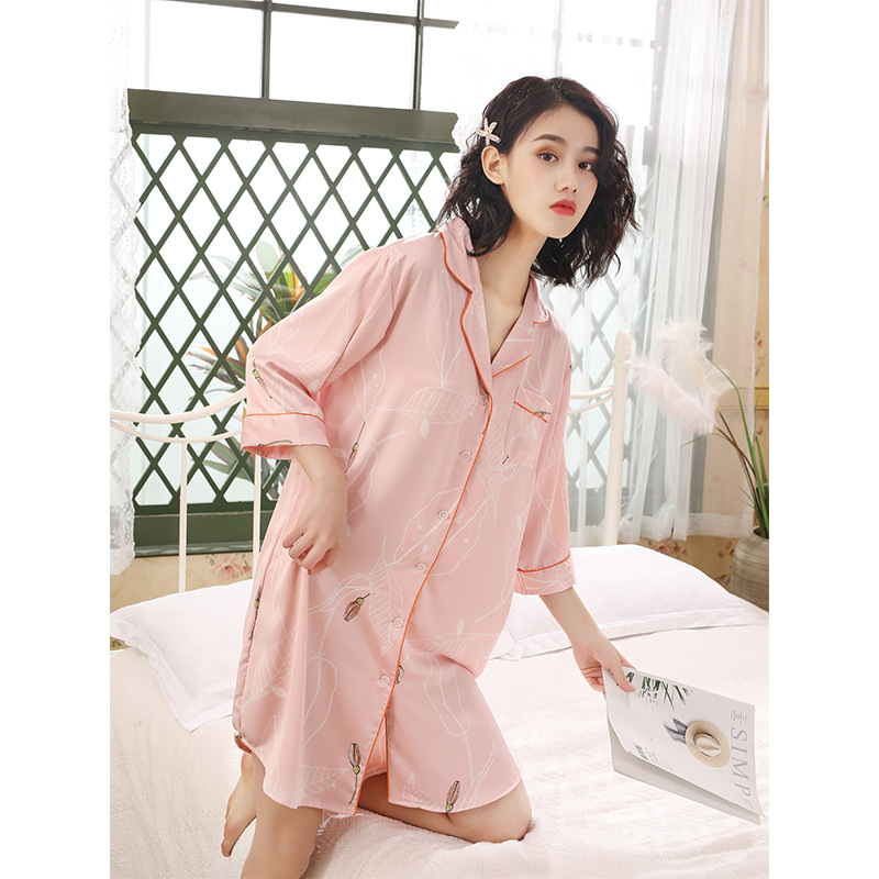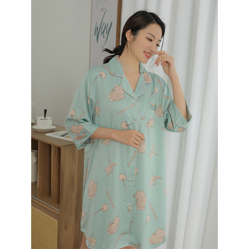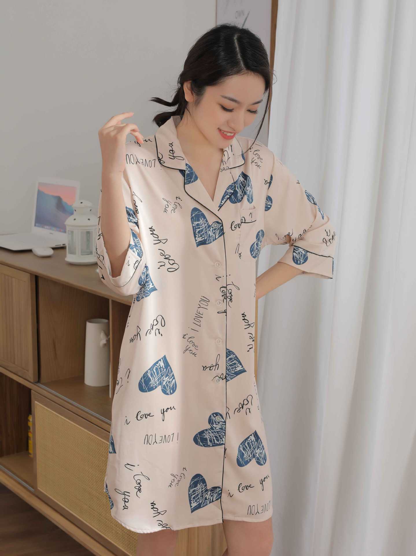 나이트 드레스 여성의 봄과 가을 고급 문자 옷깃 버클 아이스 실크 나이트 드레스 만화 겉옷 얇은 홈웨어스토어 가기
