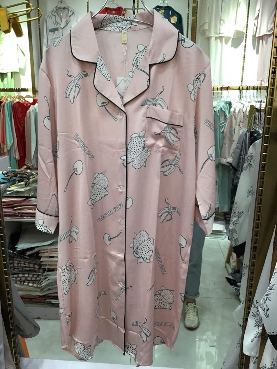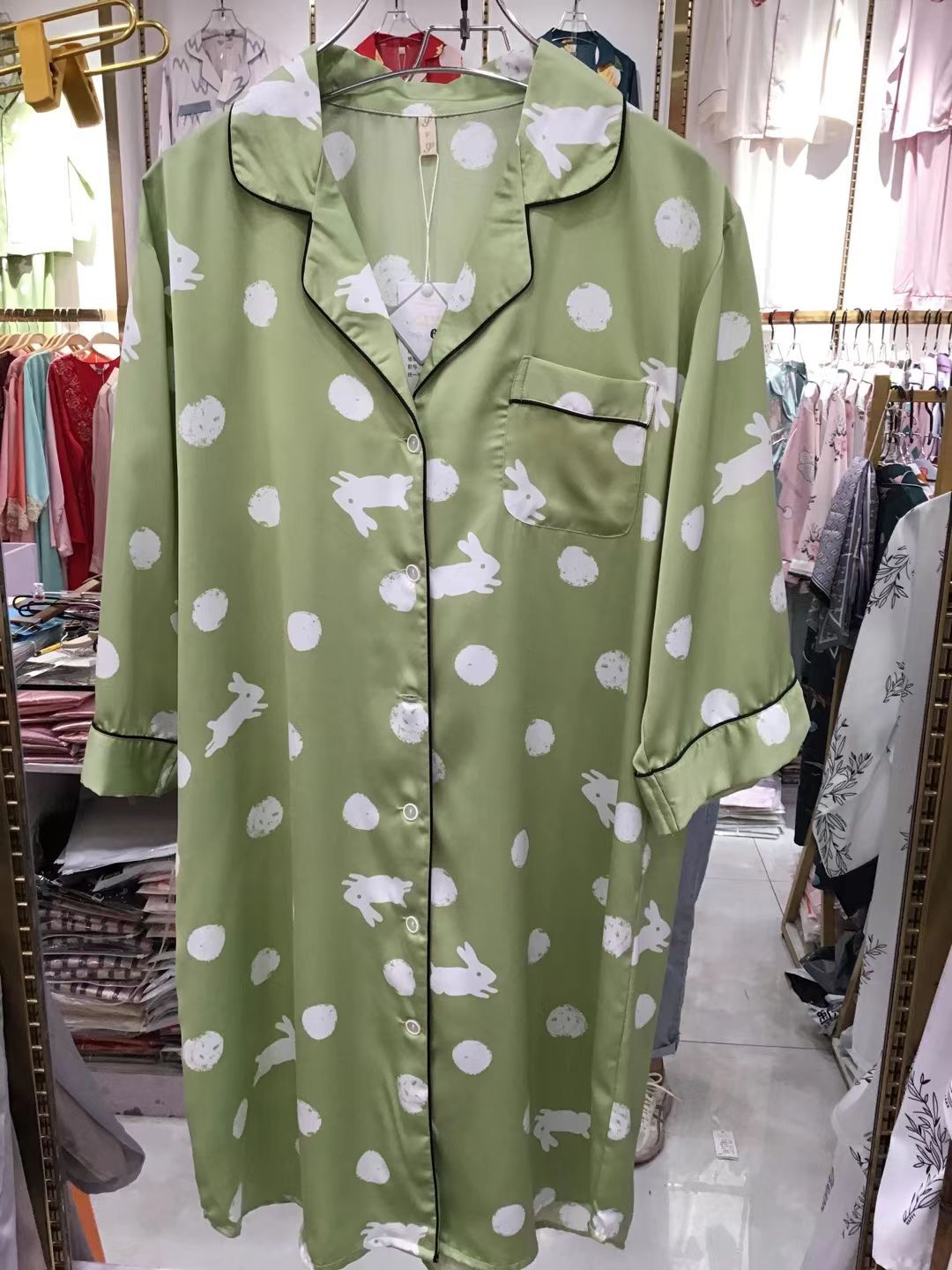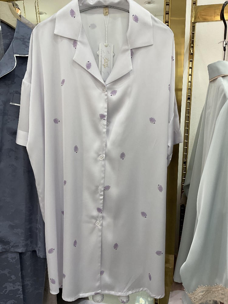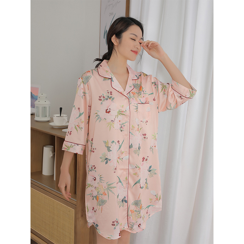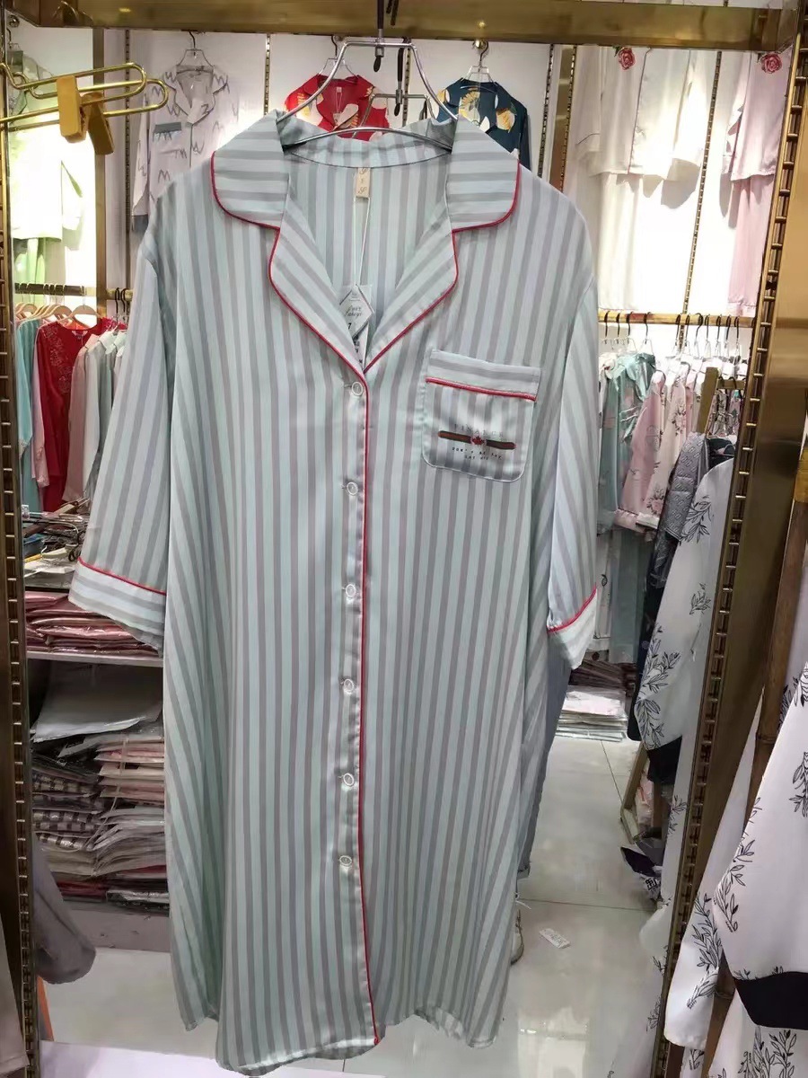 나이트 드레스 여성의 봄과 가을 고급 문자 옷깃 버클 아이스 실크 나이트 드레스 만화 겉옷 얇은 홈웨어스토어 가기