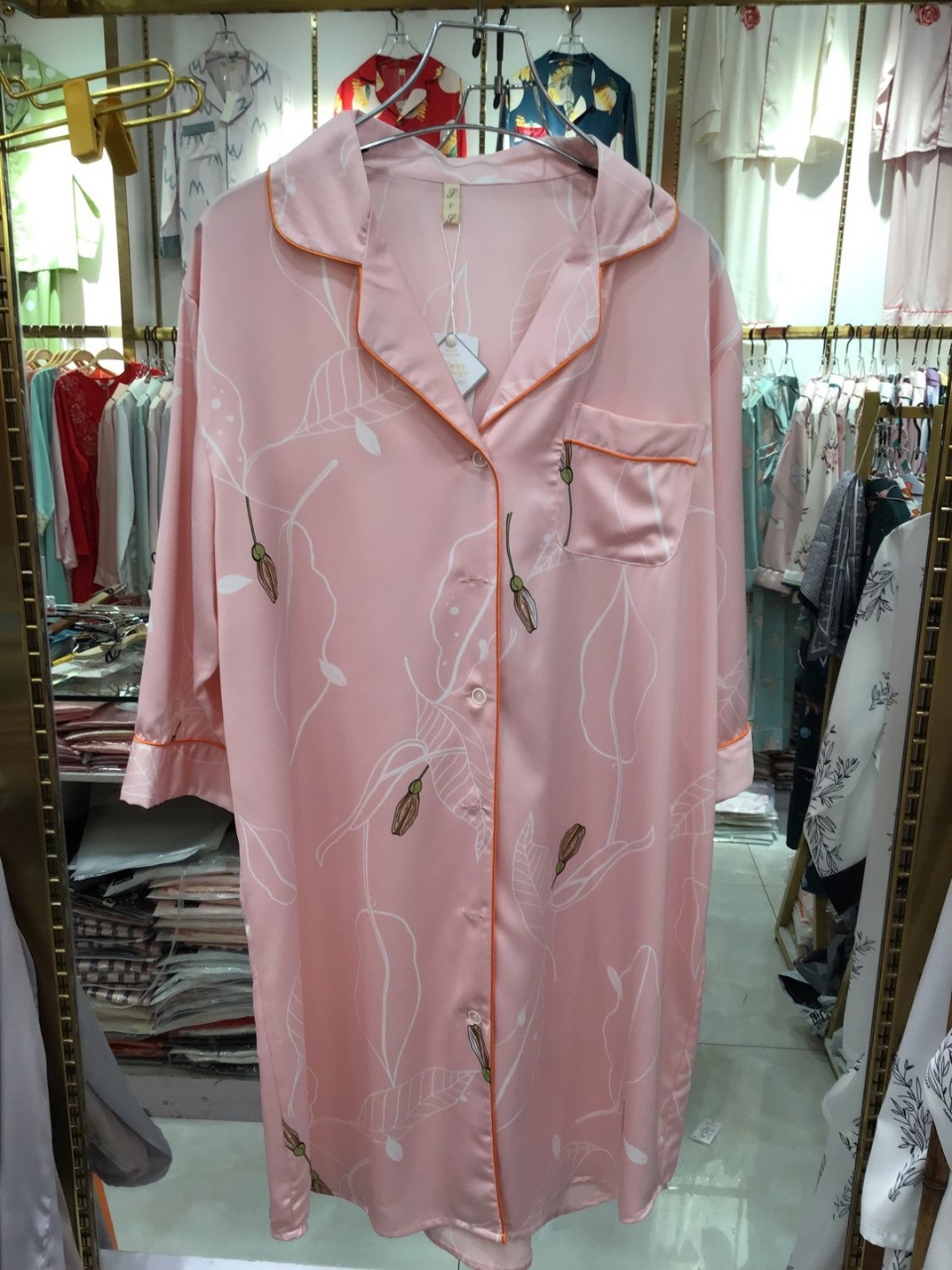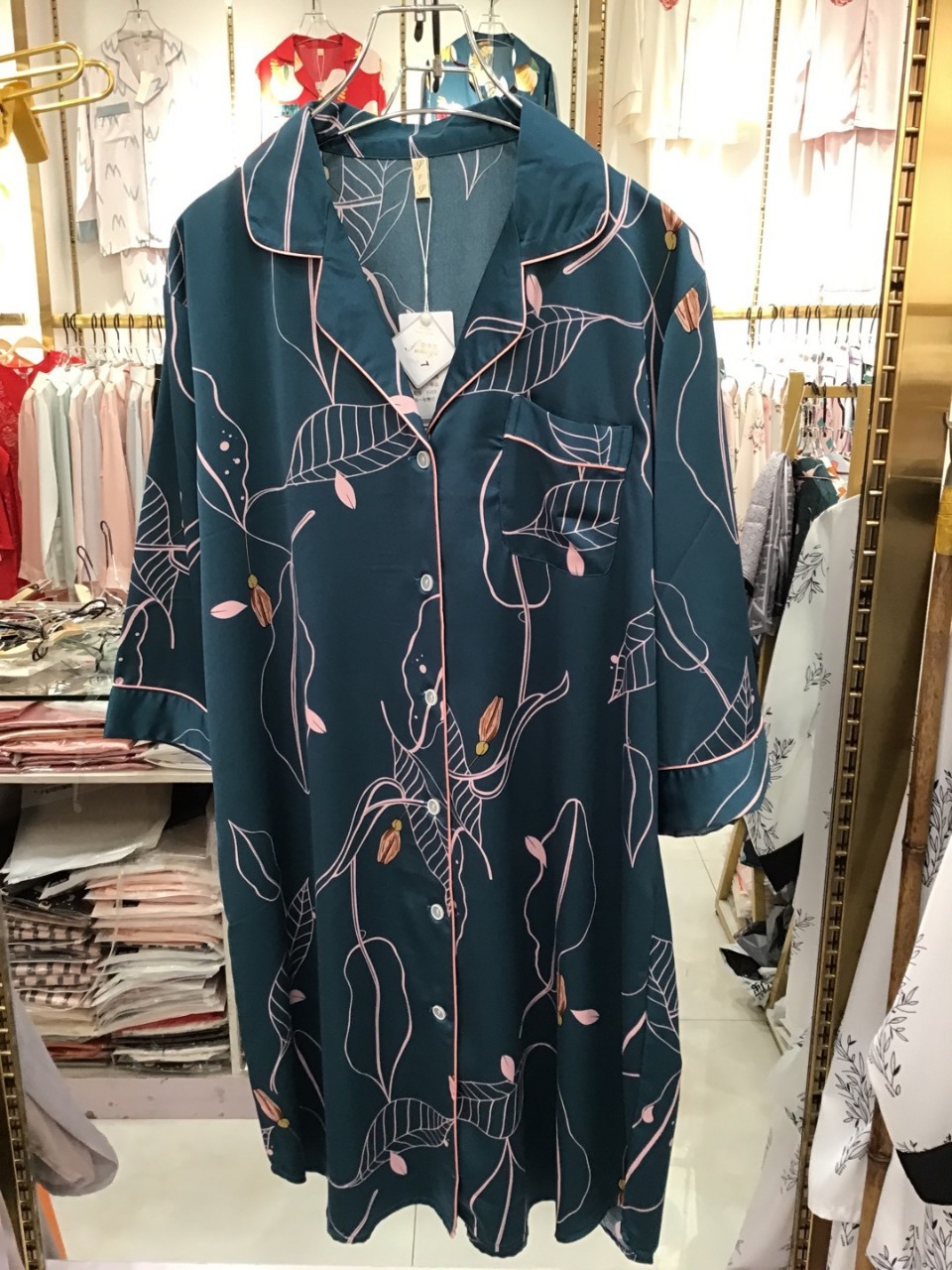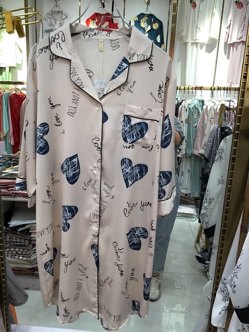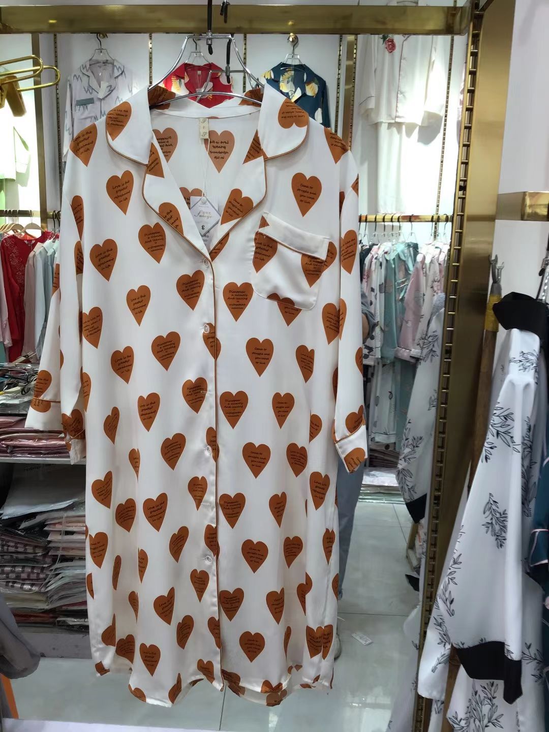 나이트 드레스 여성의 봄과 가을 고급 문자 옷깃 버클 아이스 실크 나이트 드레스 만화 겉옷 얇은 홈웨어스토어 가기