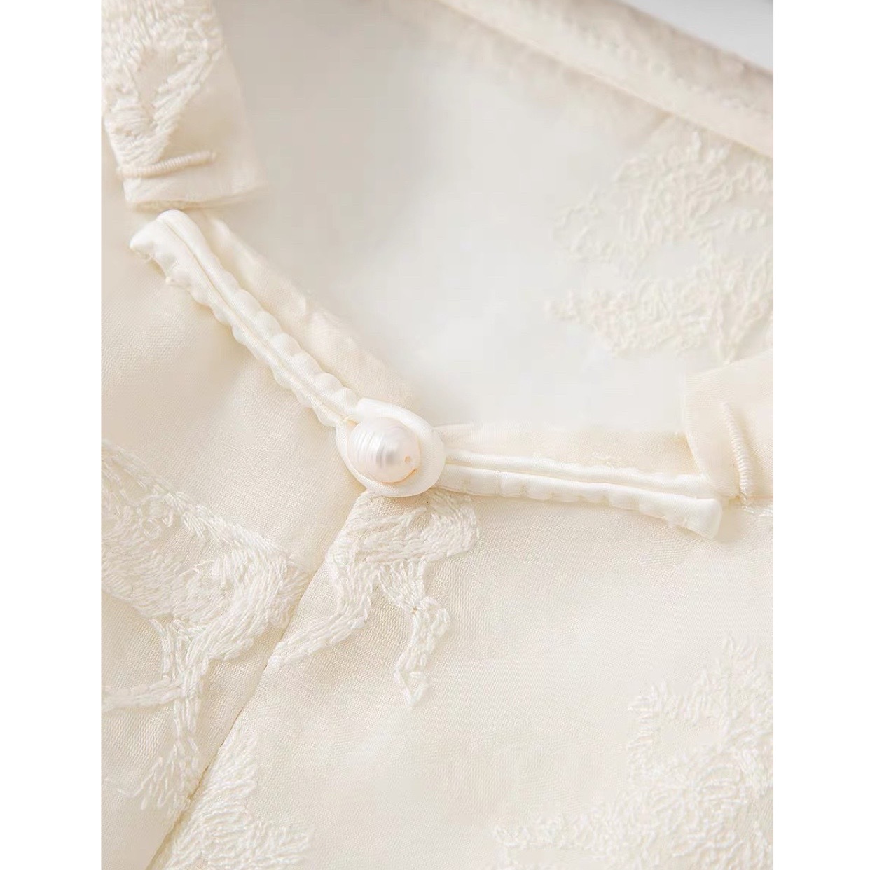 화이트 하이 엔드 실크 같은 오젠 새틴 새로운 중국 스타일 최고의 여성 긴팔 헤비 듀티 자수 국가 스타일 버클 셔츠