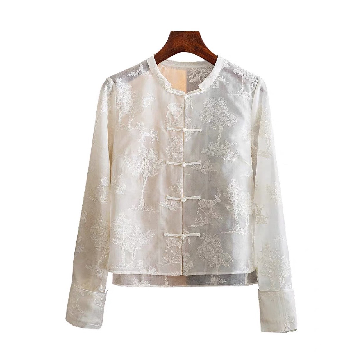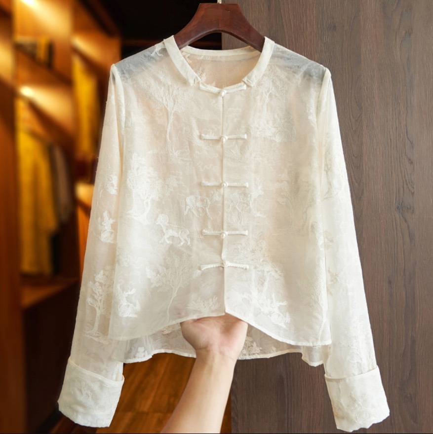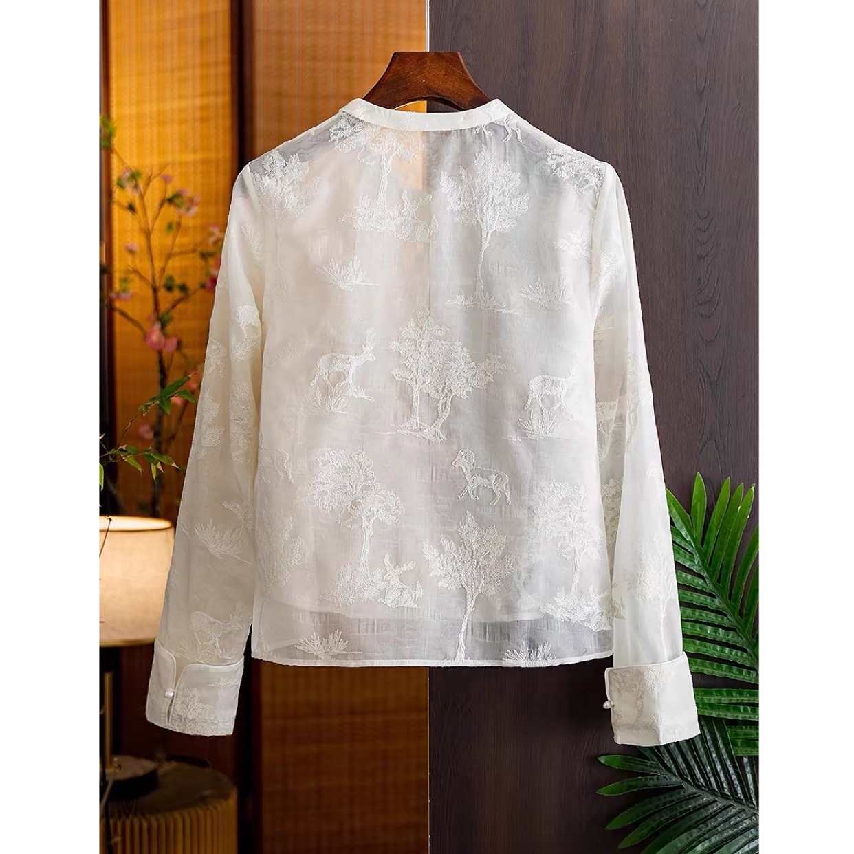 화이트 하이 엔드 실크 같은 오젠 새틴 새로운 중국 스타일 최고의 여성 긴팔 헤비 듀티 자수 국가 스타일 버클 셔츠스토어 가기