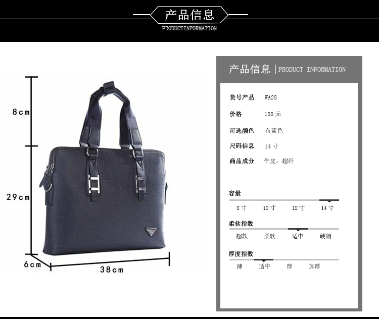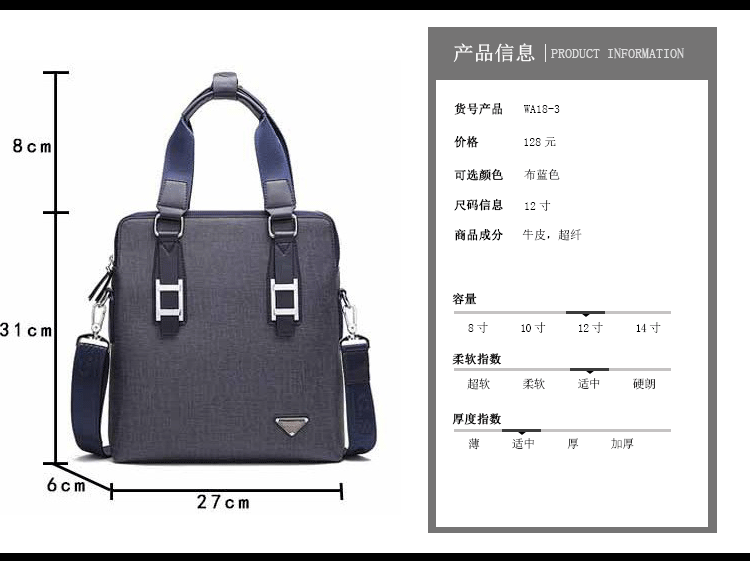 本组公文手提包型号WA18 有4个款式:分别是-5横款布蓝色. -3竖款布蓝色 -2竖款布蓝色 -1手拿款布蓝色. 。。这组是爆款。最多定制的了,一般开会 竞标工程 团购礼品首选。价格不贵。实用性强。