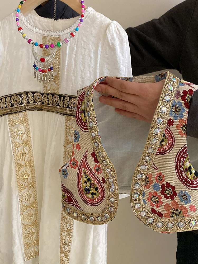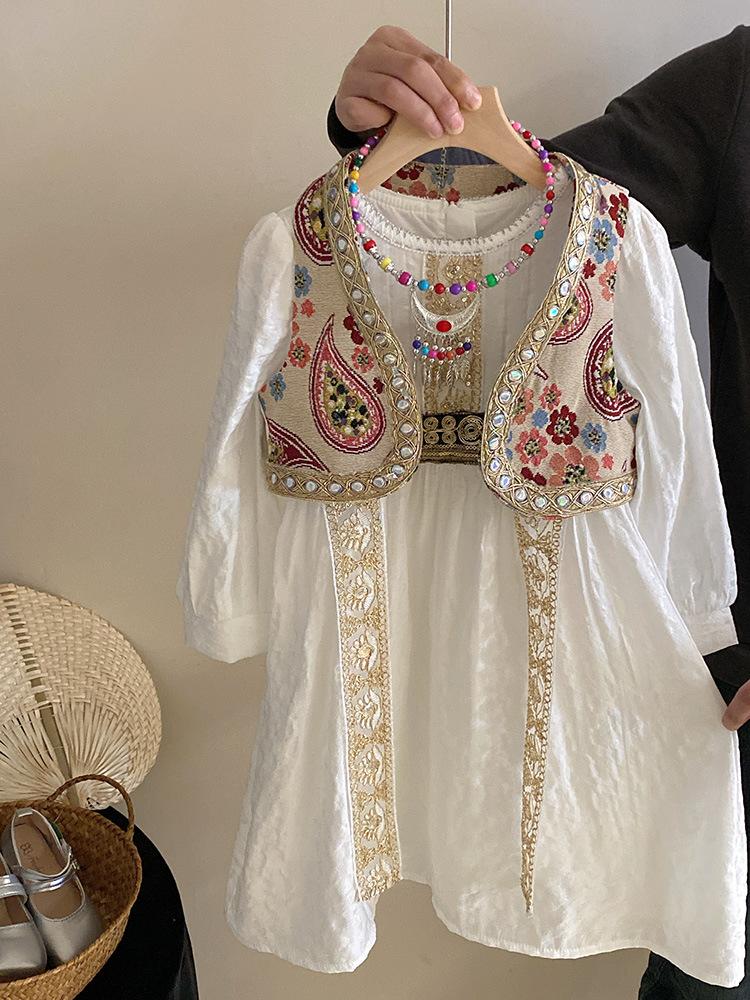 소녀 원피스 세트 2024 봄 새로운 소녀 민족 스타일 원피스 빈티지 프린트 조끼 아동복스토어 가기