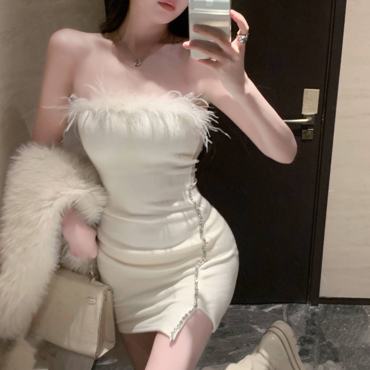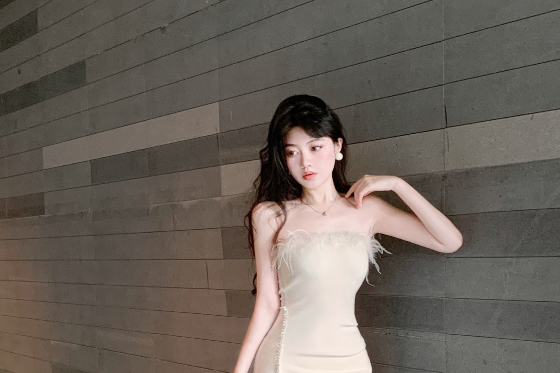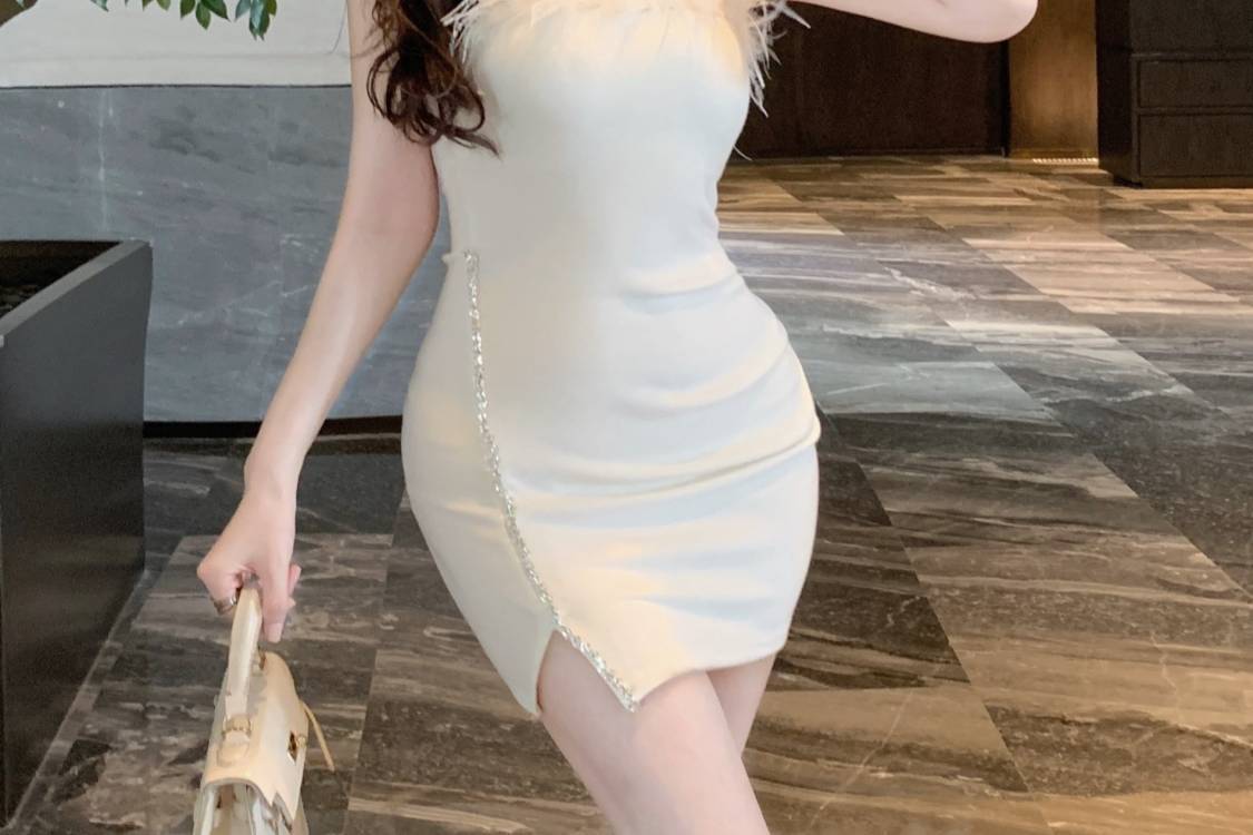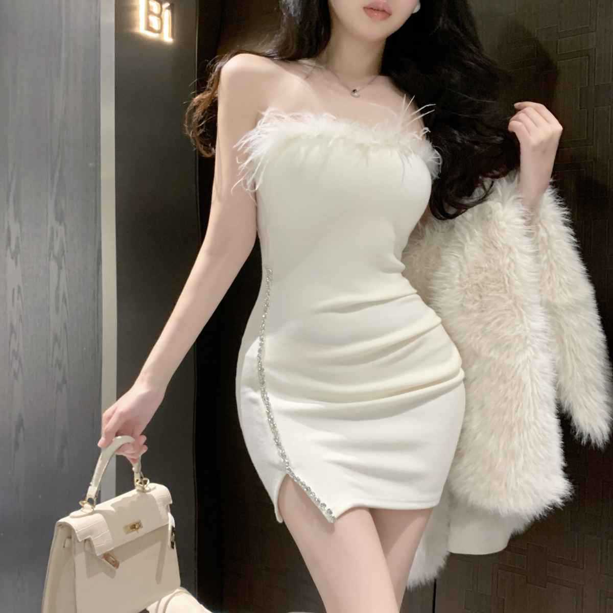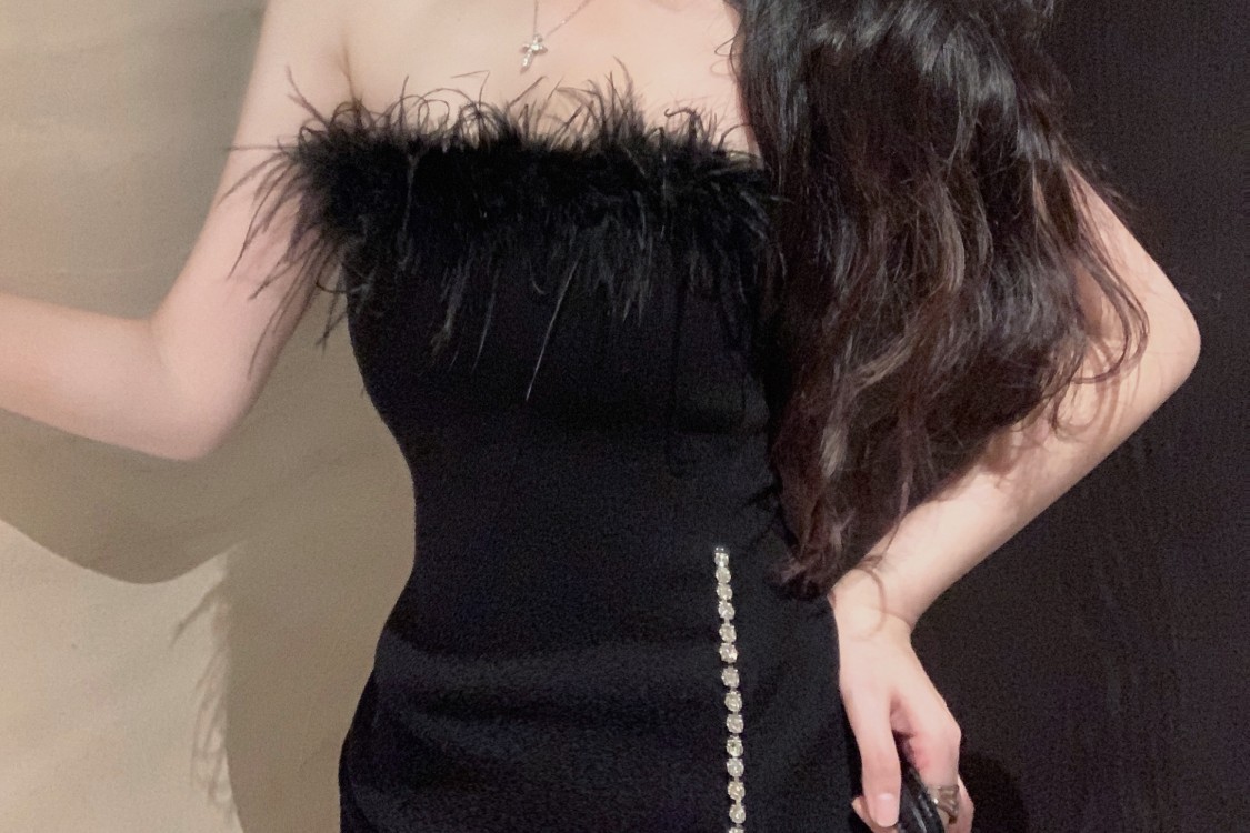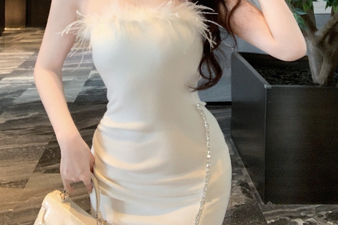 프랑스 스타일의 고급 생일 파티 원피스 작은 엄마 튜브 탑 원피스 여성의 타이트한 허리 달콤하고 매운 깃털 엉덩이 치마스토어 가기