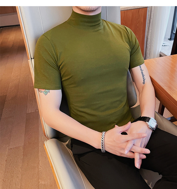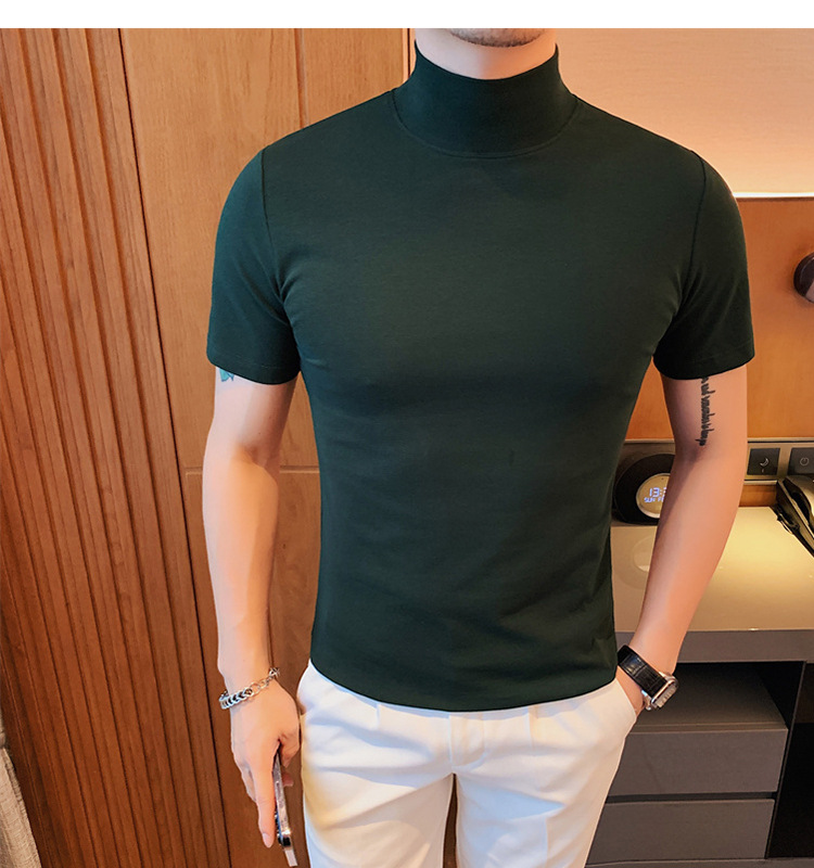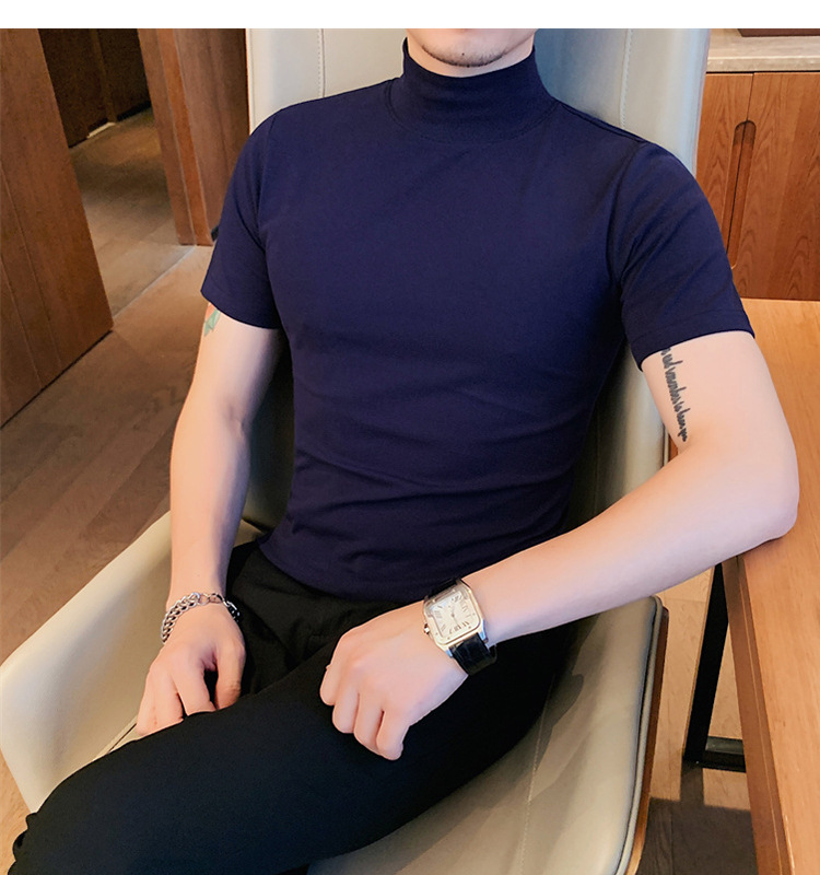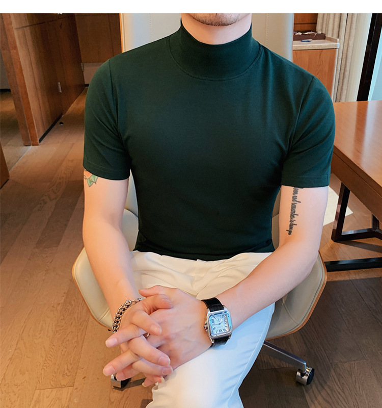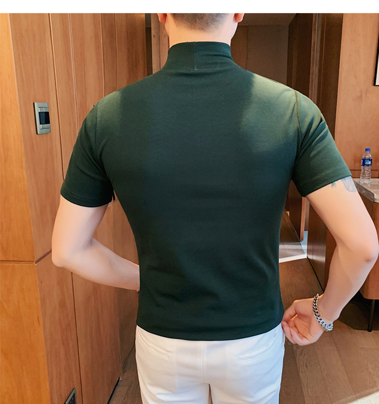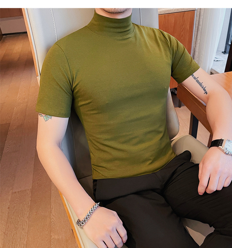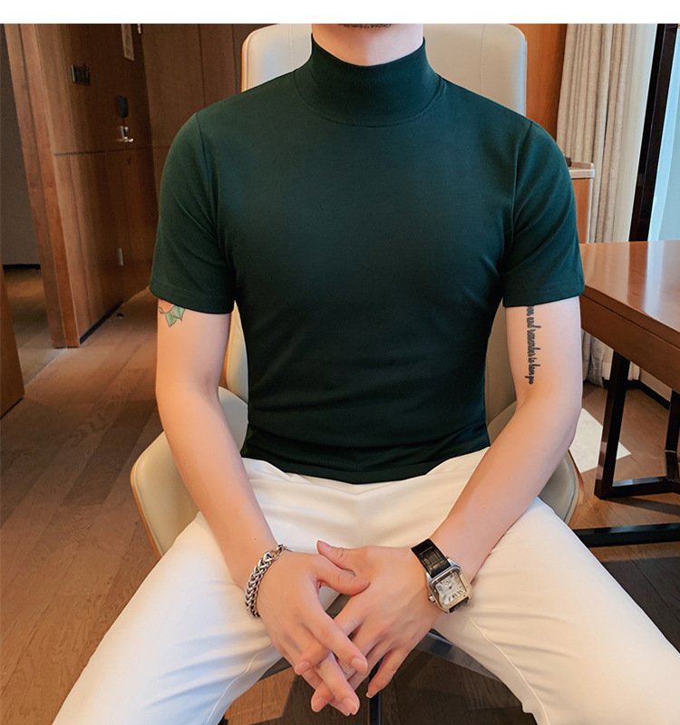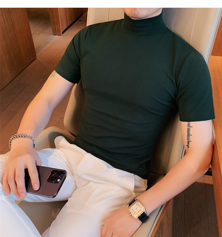 Tiktok 뜨거운 판매 인기있는 남성 반팔 티셔츠 하프 터틀넥 단색 슬림 바닥 셔츠 티셔츠 인터넷 유명인 남성 티셔츠