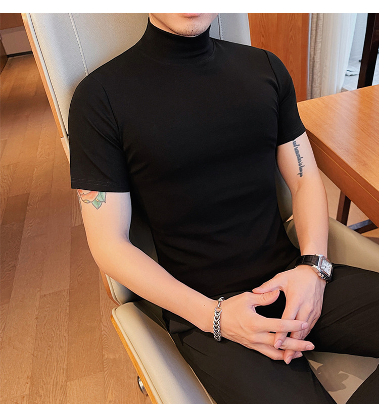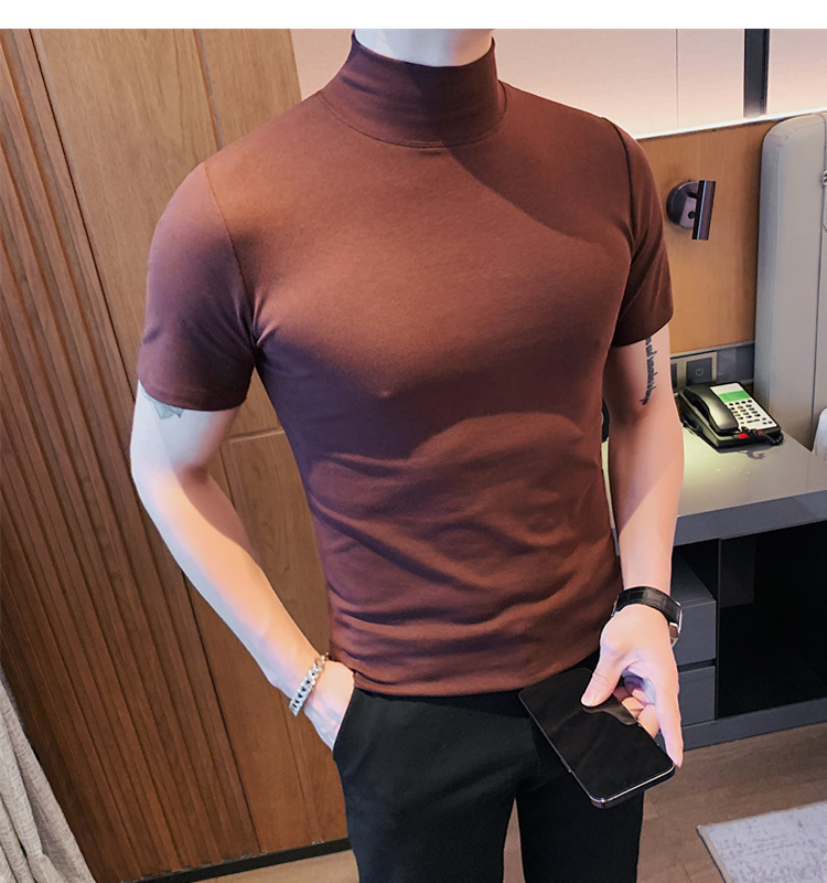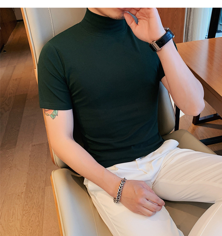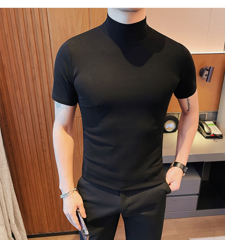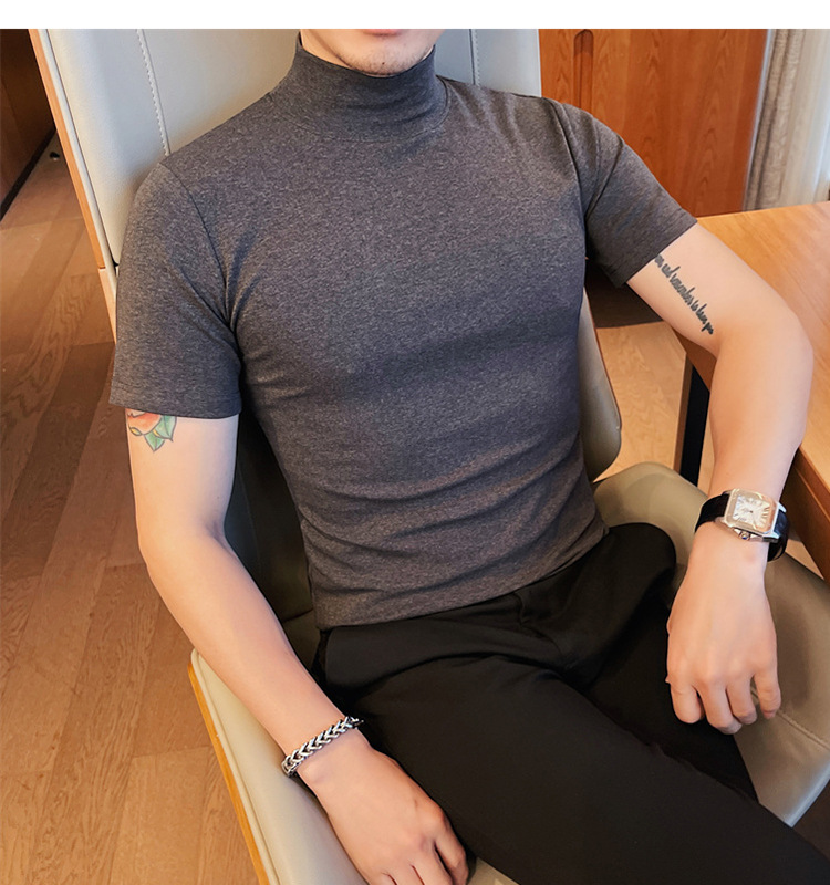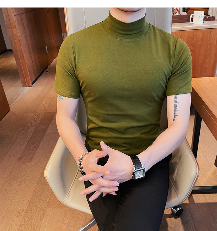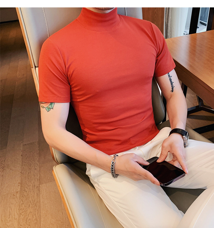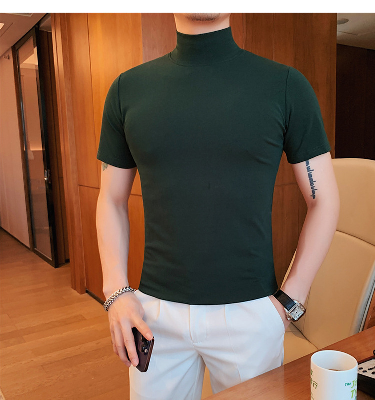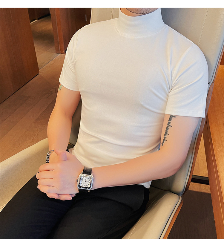 Tiktok 뜨거운 판매 인기있는 남성 반팔 티셔츠 하프 터틀넥 단색 슬림 바닥 셔츠 티셔츠 인터넷 유명인 남성 티셔츠
