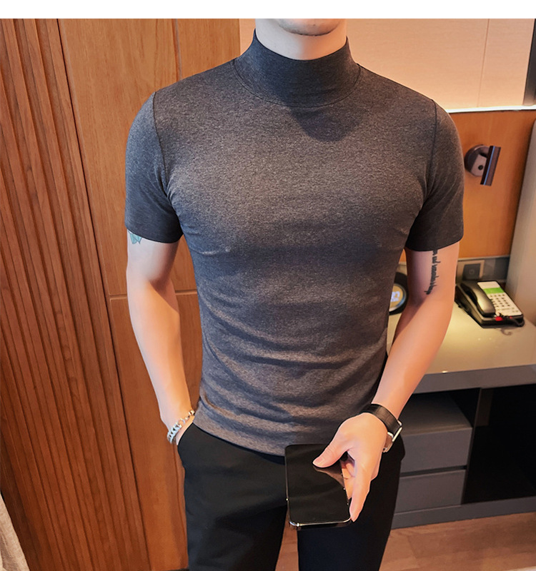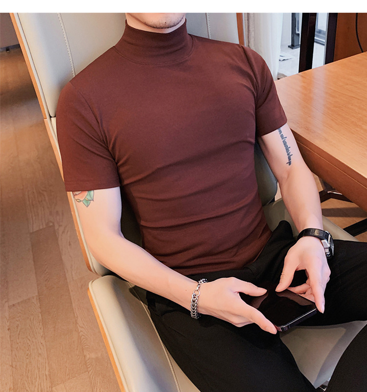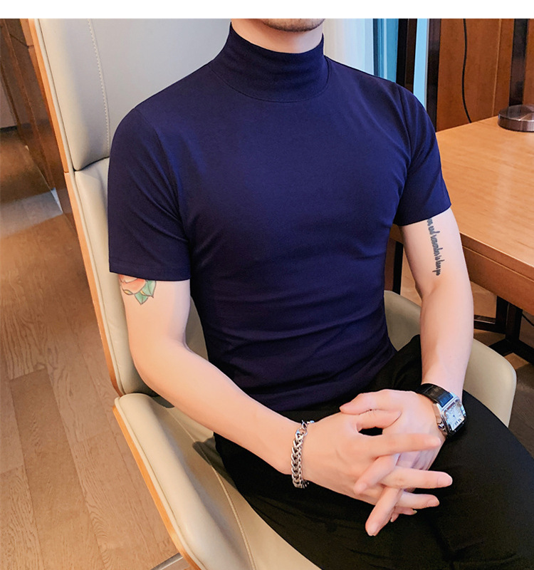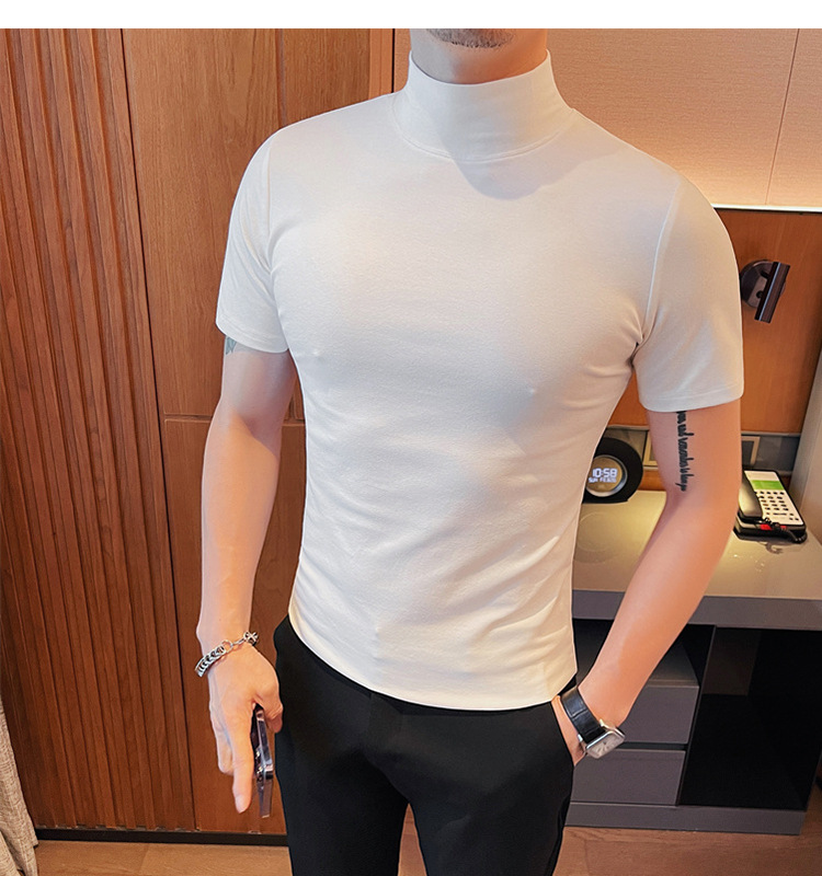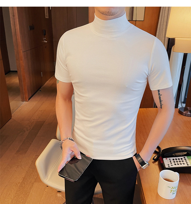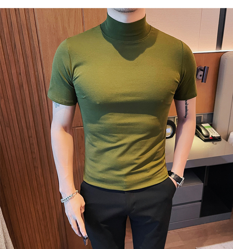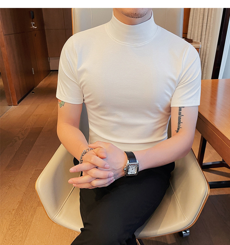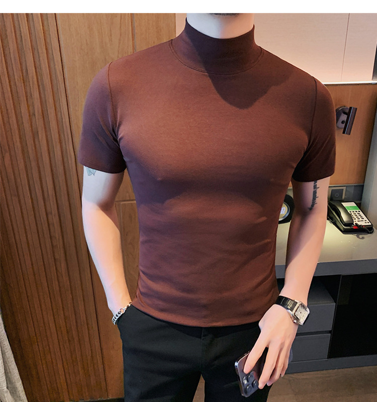 Tiktok 뜨거운 판매 인기있는 남성 반팔 티셔츠 하프 터틀넥 단색 슬림 바닥 셔츠 티셔츠 인터넷 유명인 남성 티셔츠