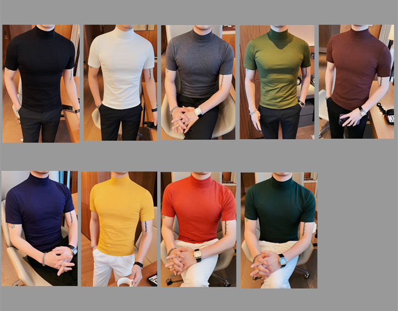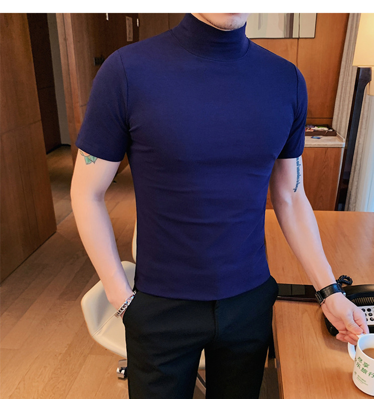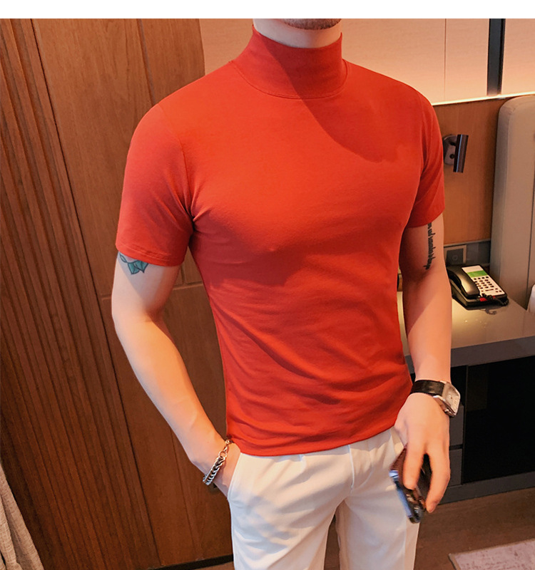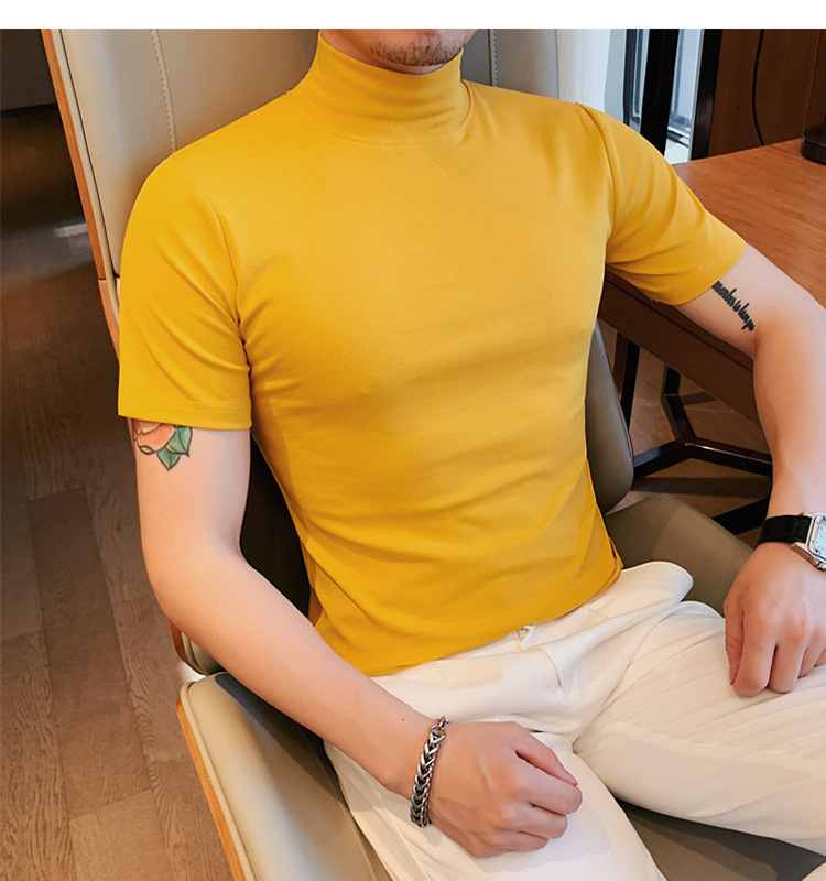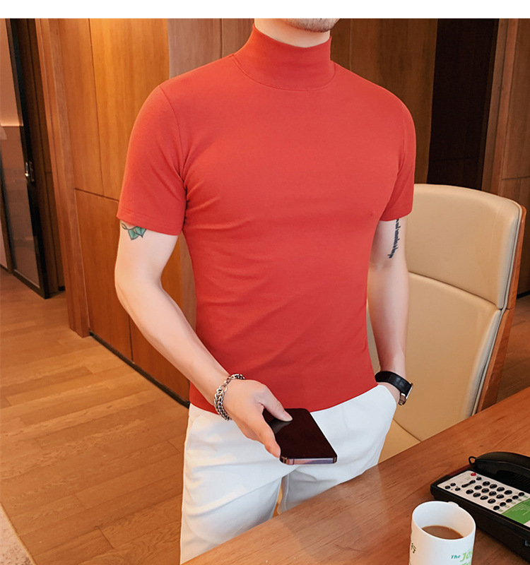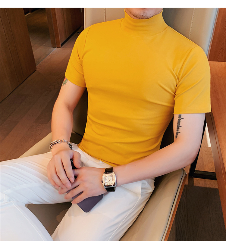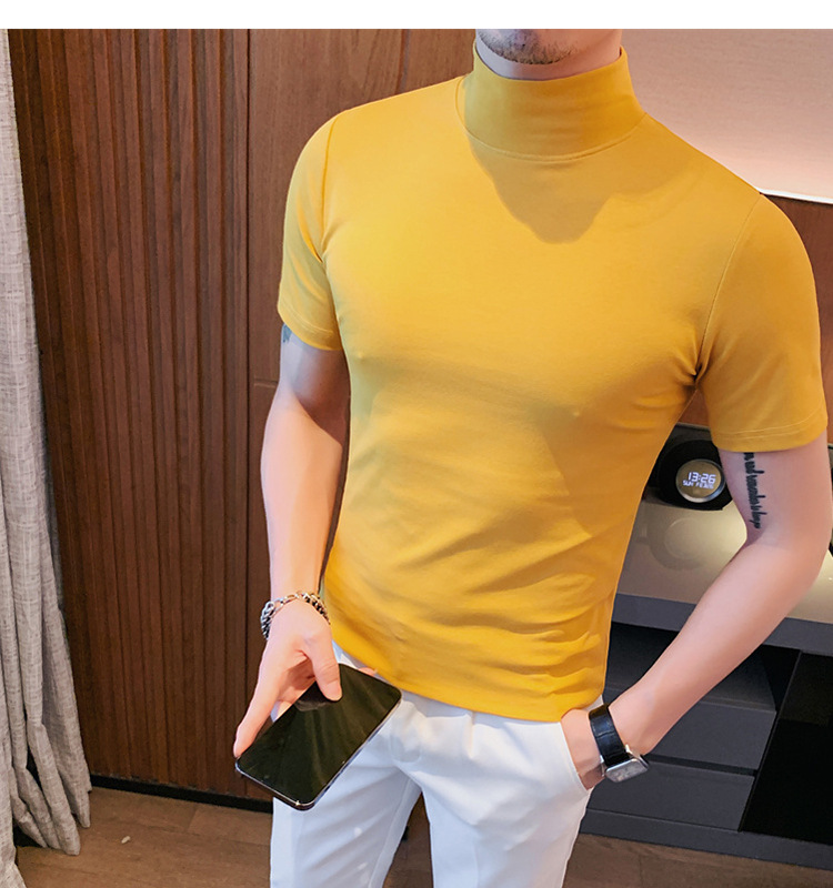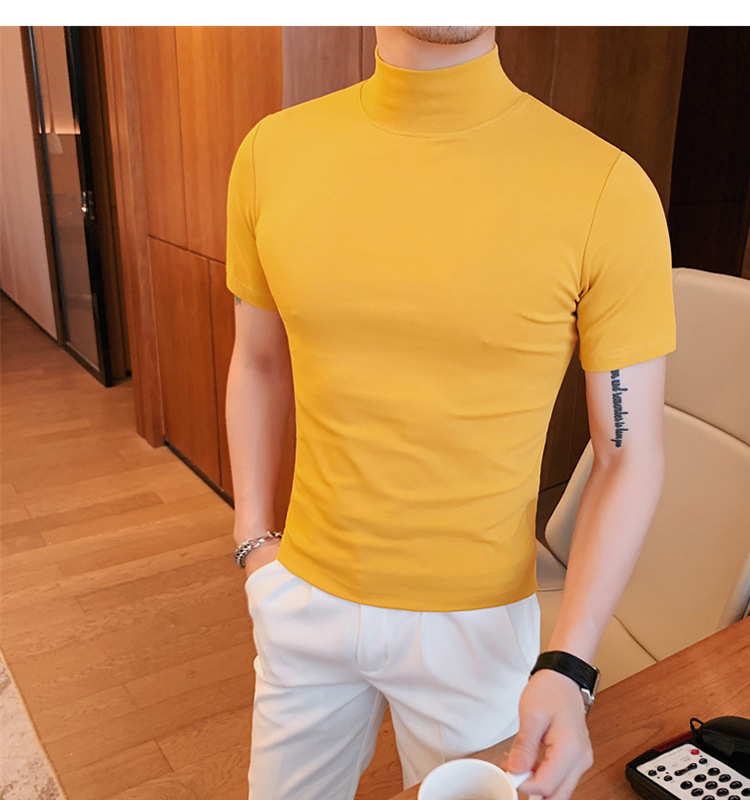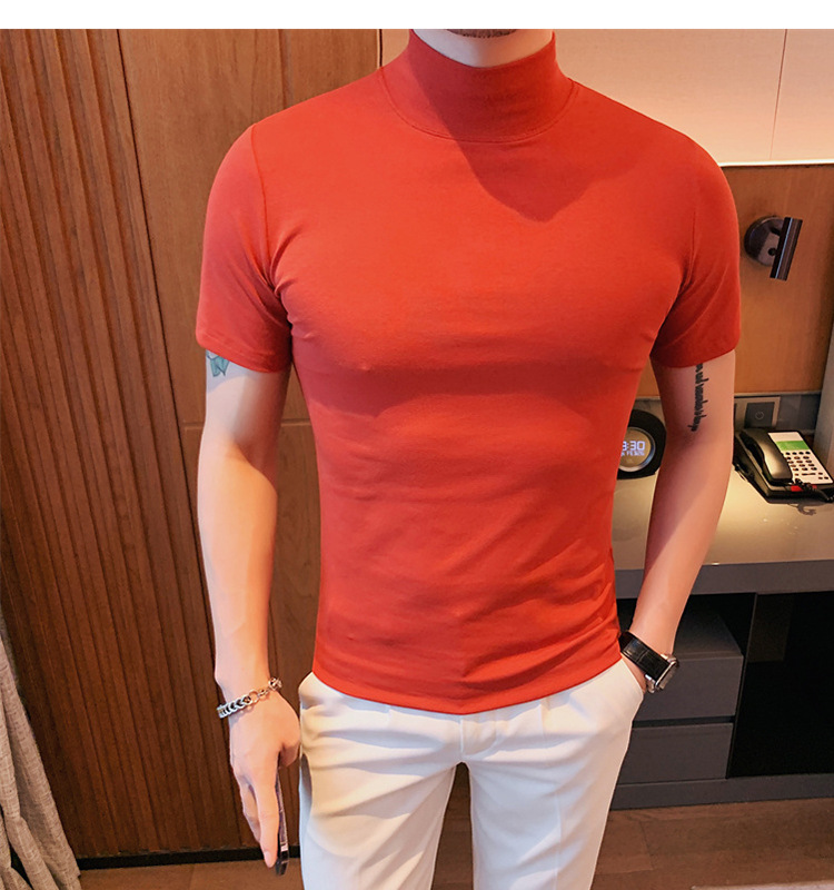 Tiktok 뜨거운 판매 인기있는 남성 반팔 티셔츠 하프 터틀넥 단색 슬림 바닥 셔츠 티셔츠 인터넷 유명인 남성 티셔츠