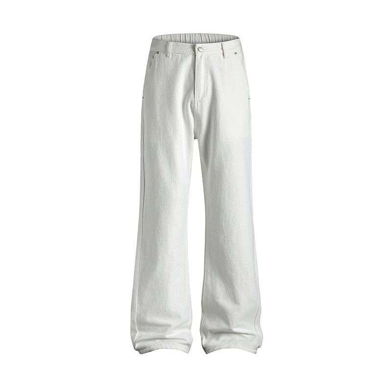 Mu Yuan 남자 한국 스타일 화이트 미드 웨이스트 슬리밍 데님 바지 남성 및 여성의 간단한 스트레이트 플레어 바지