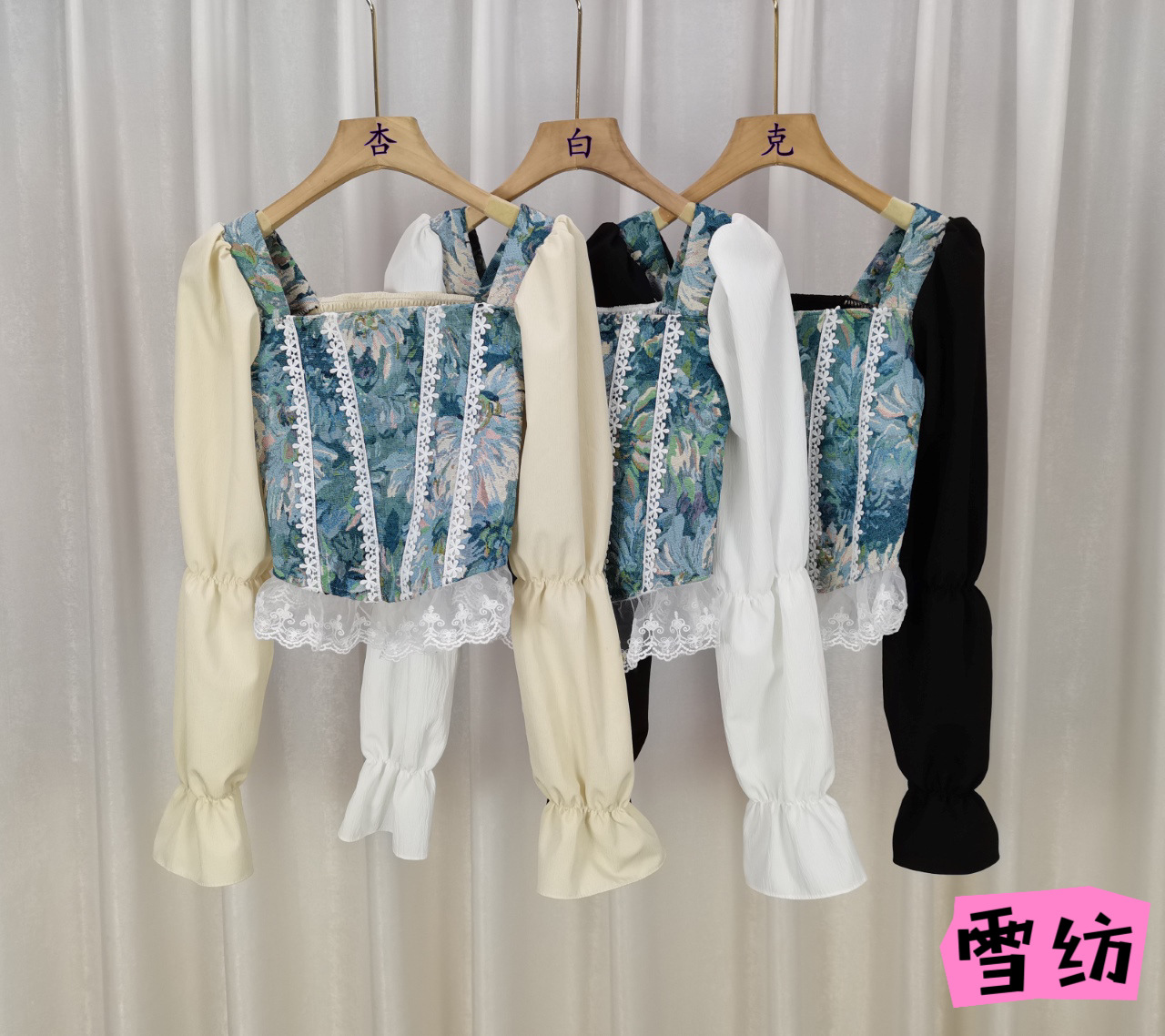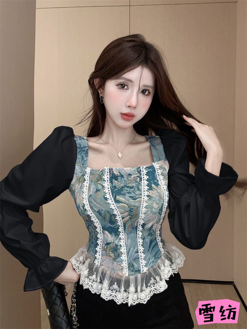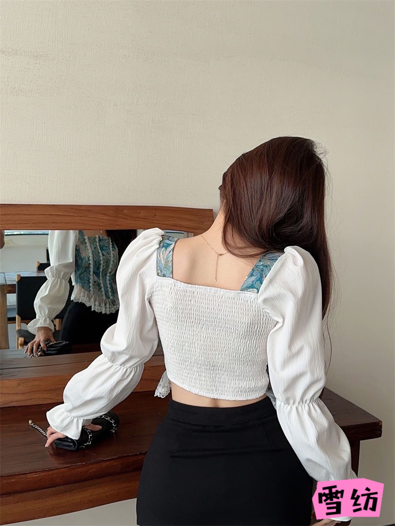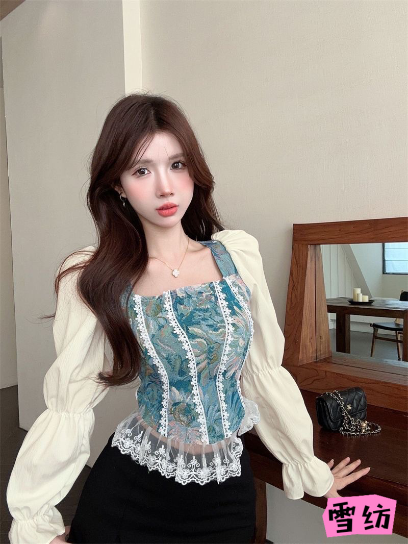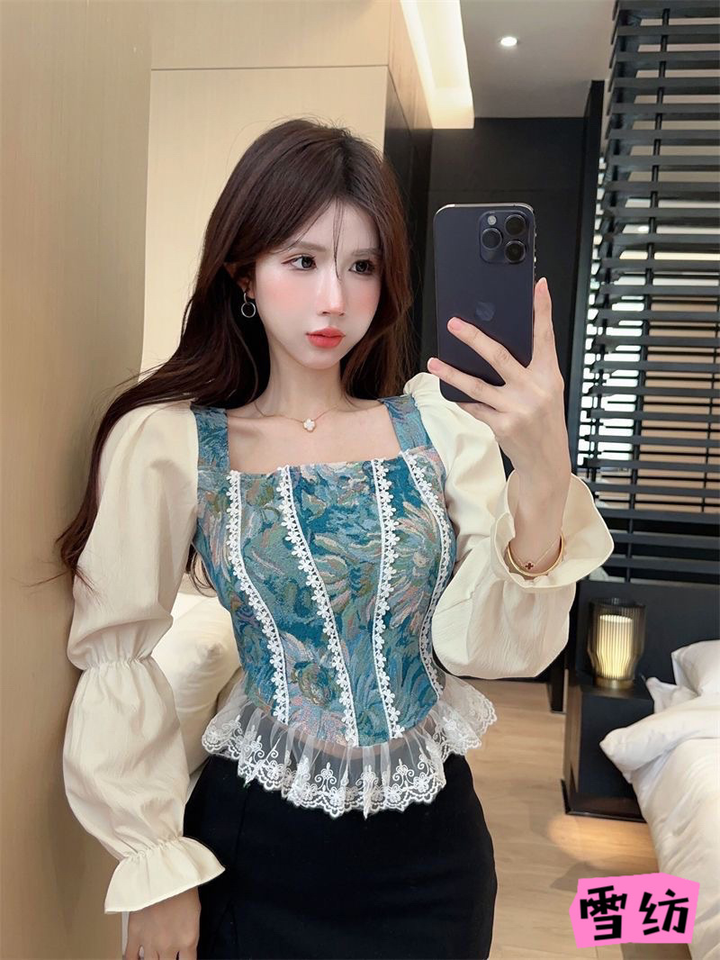 미국식 2024 새로운 스퀘어 칼라 셔츠 프랑스 복고풍 자카드 달콤하고 매운 꽃 스티칭 여성용 서양식 탑스토어 가기