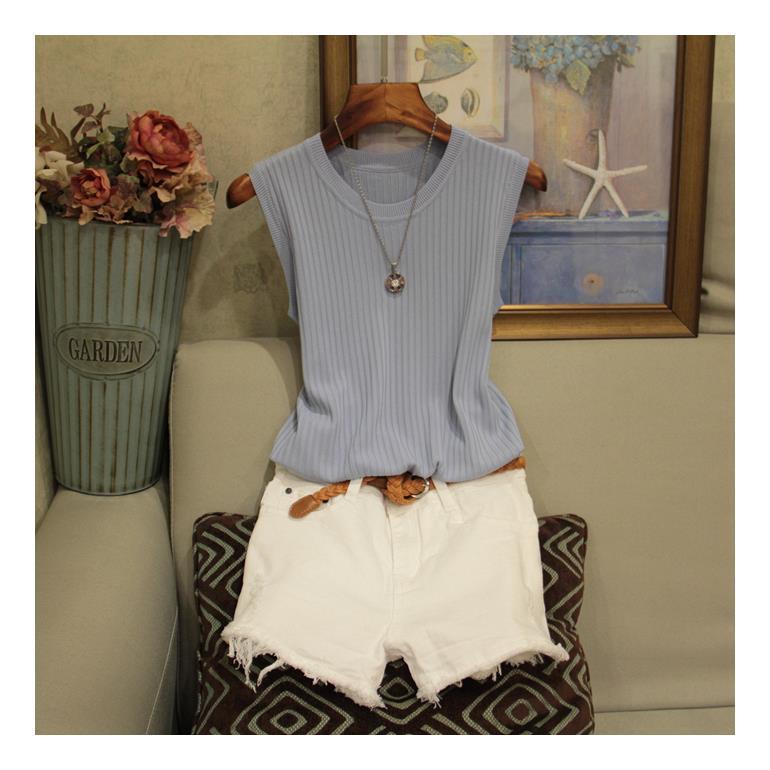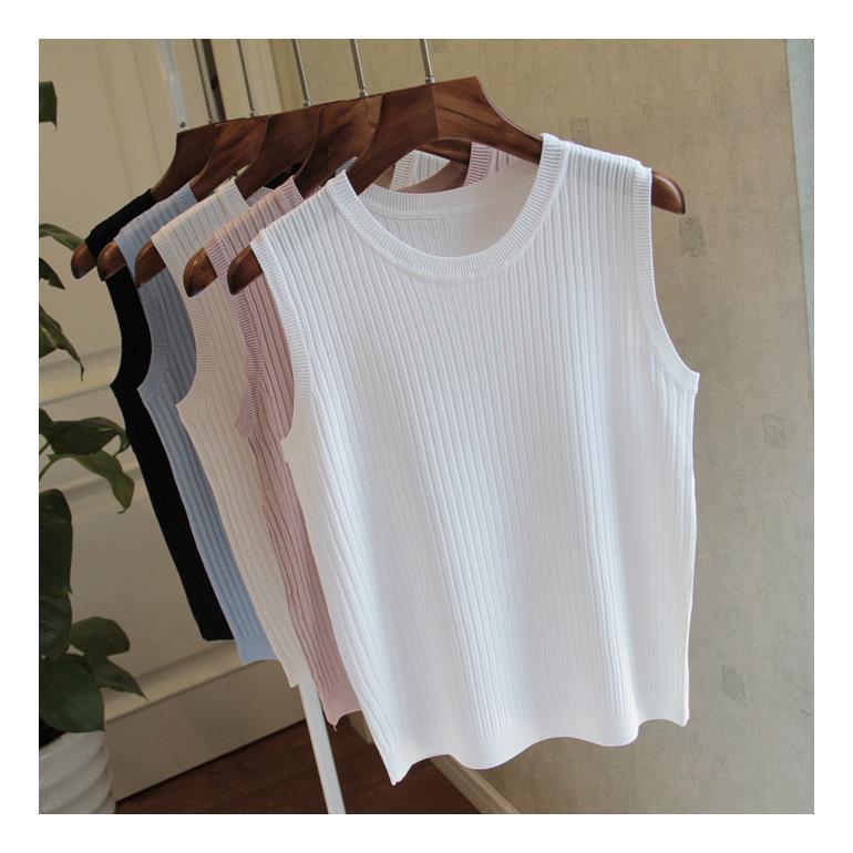 여름 새로운 라운드 넥 조끼 여성의 넓은 어깨 끈 다재다능한 아이스 실크 얇은 내부 민소매 니트 단색 외부 탑스토어 가기