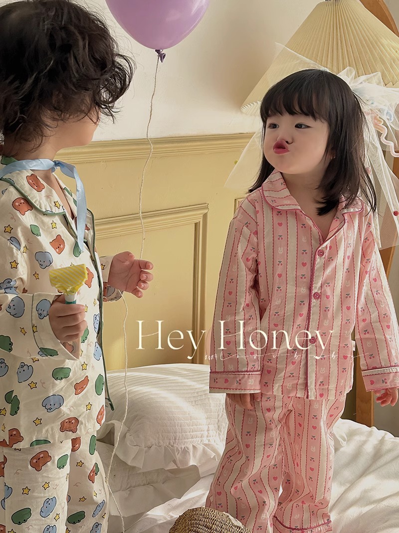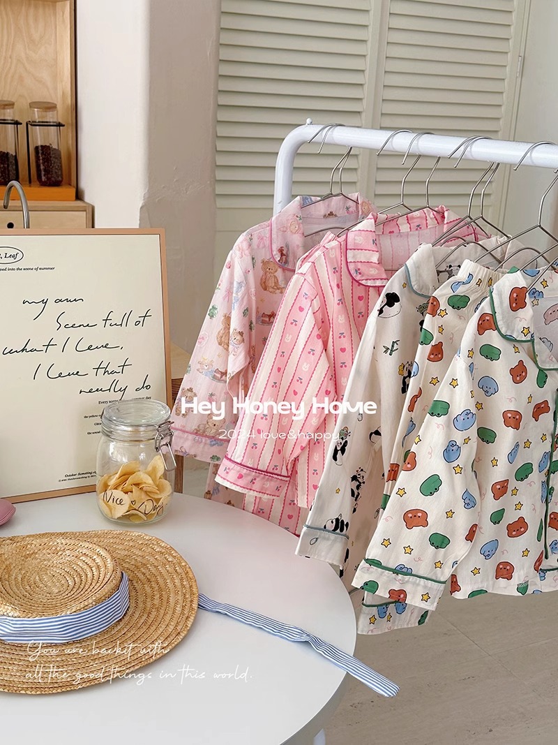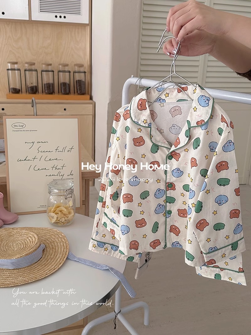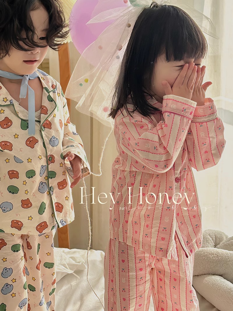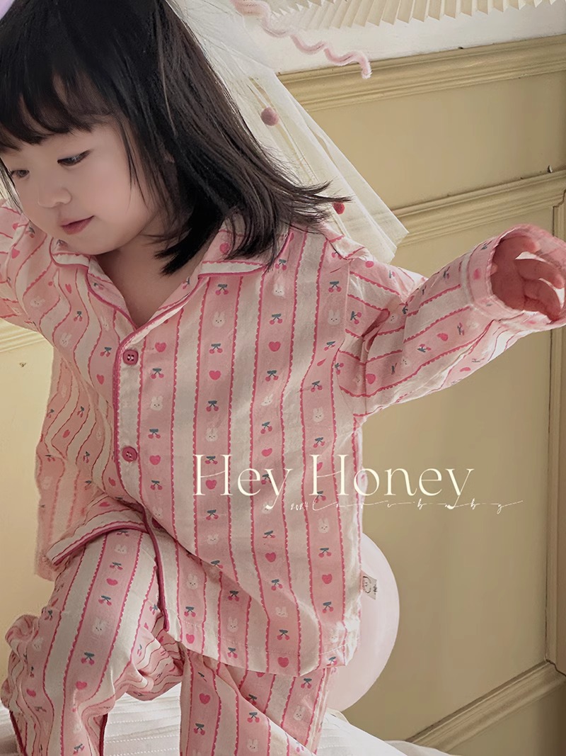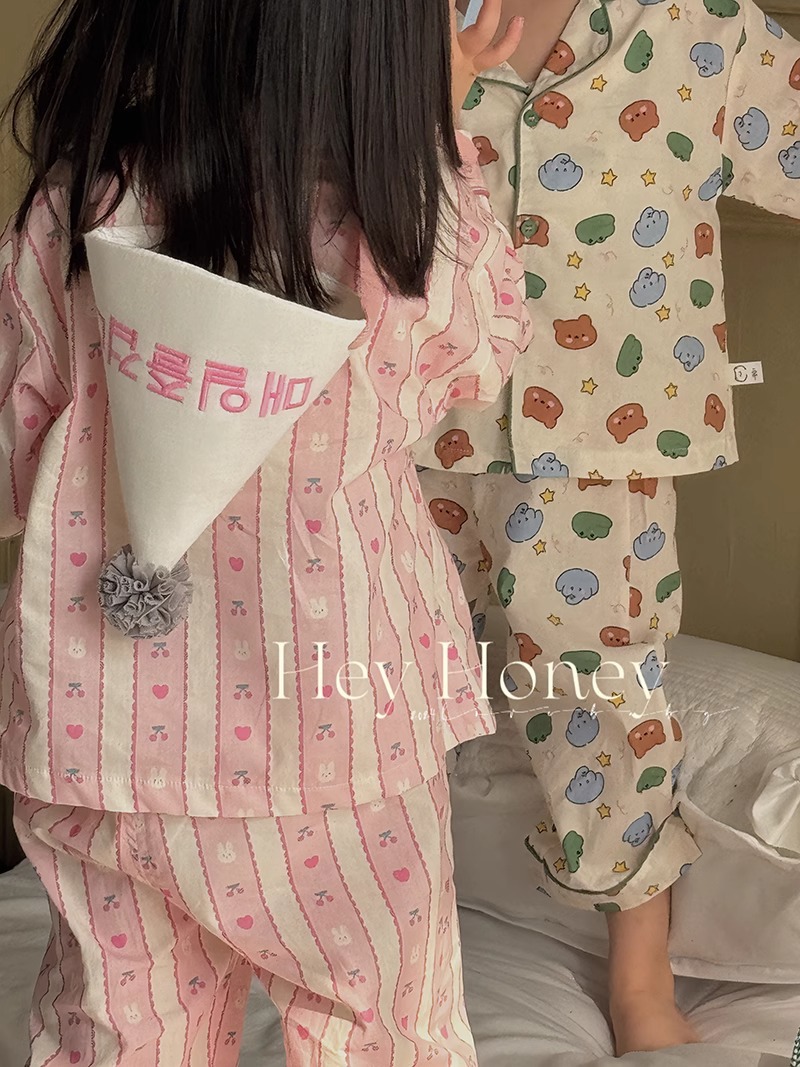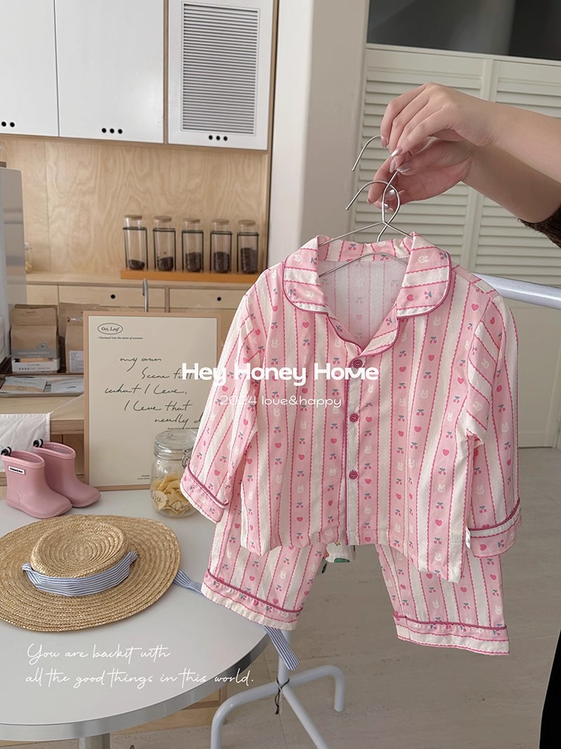 어린이 잠옷 봄과 가을 아기 홈 웨어 토끼 얇은 세트 소년 소녀 새 긴 소매 두 조각 세트