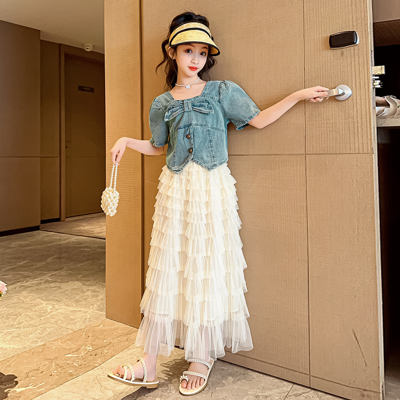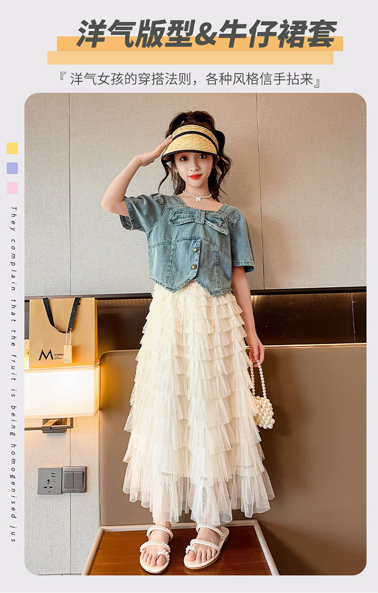 소녀 여름 원피스 세트 2024 새로운 중형 및 대형 어린이 서양식 인터넷 유명 인사 스커트 긴 스커트 데님 옷 투피스 세트