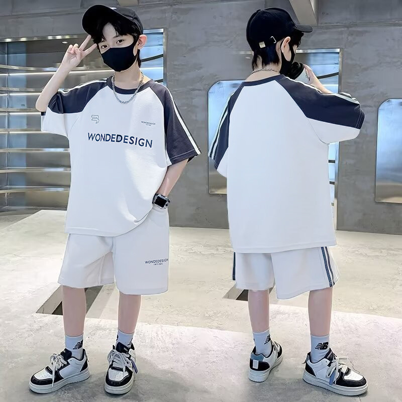 24 여름 어린이 유행 유행 편지 느슨한 캐주얼 세트 소년의 잘 생긴 반팔 반바지 스포츠 투피스 세트