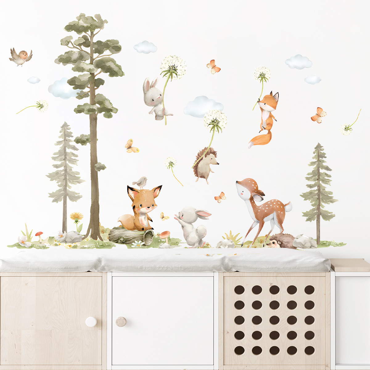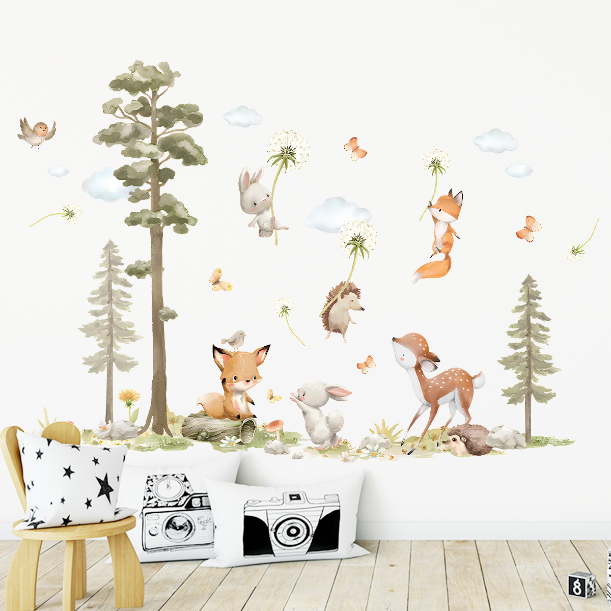 만화 숲 큰 나무 귀여운 동물 민들레 자가 접착 벽 스티커 어린이 방 장식 스티커 BR64683