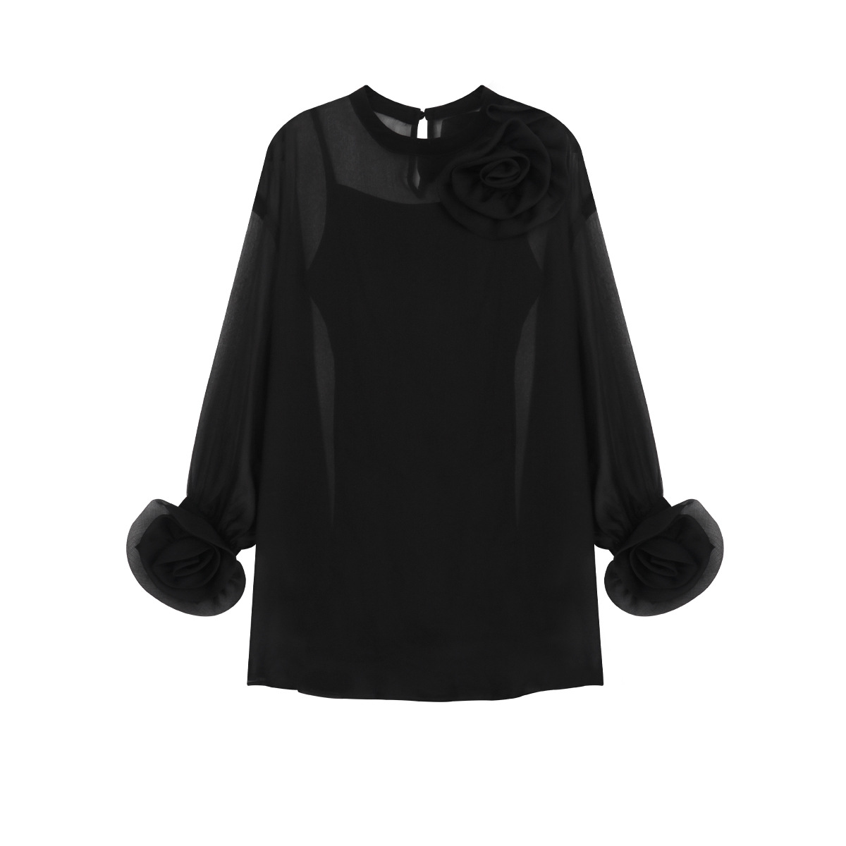 나이팅게일 로즈 입체 로즈 조젯 루즈 탑 기질 얇은 루즈 라운드 넥 긴팔 레이스 셔츠
