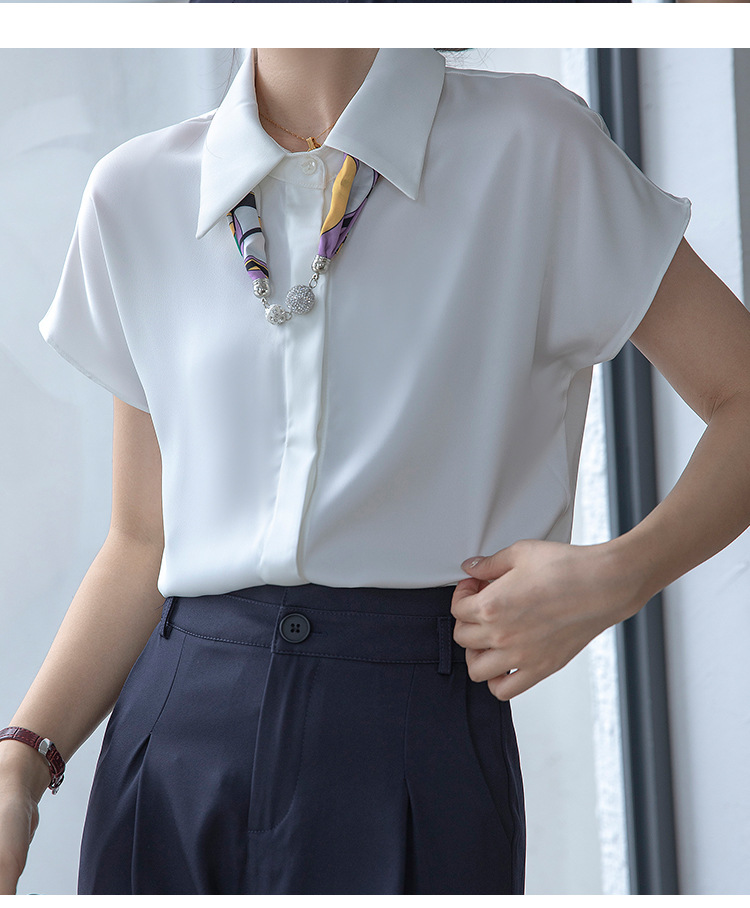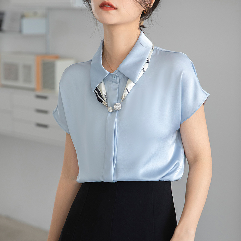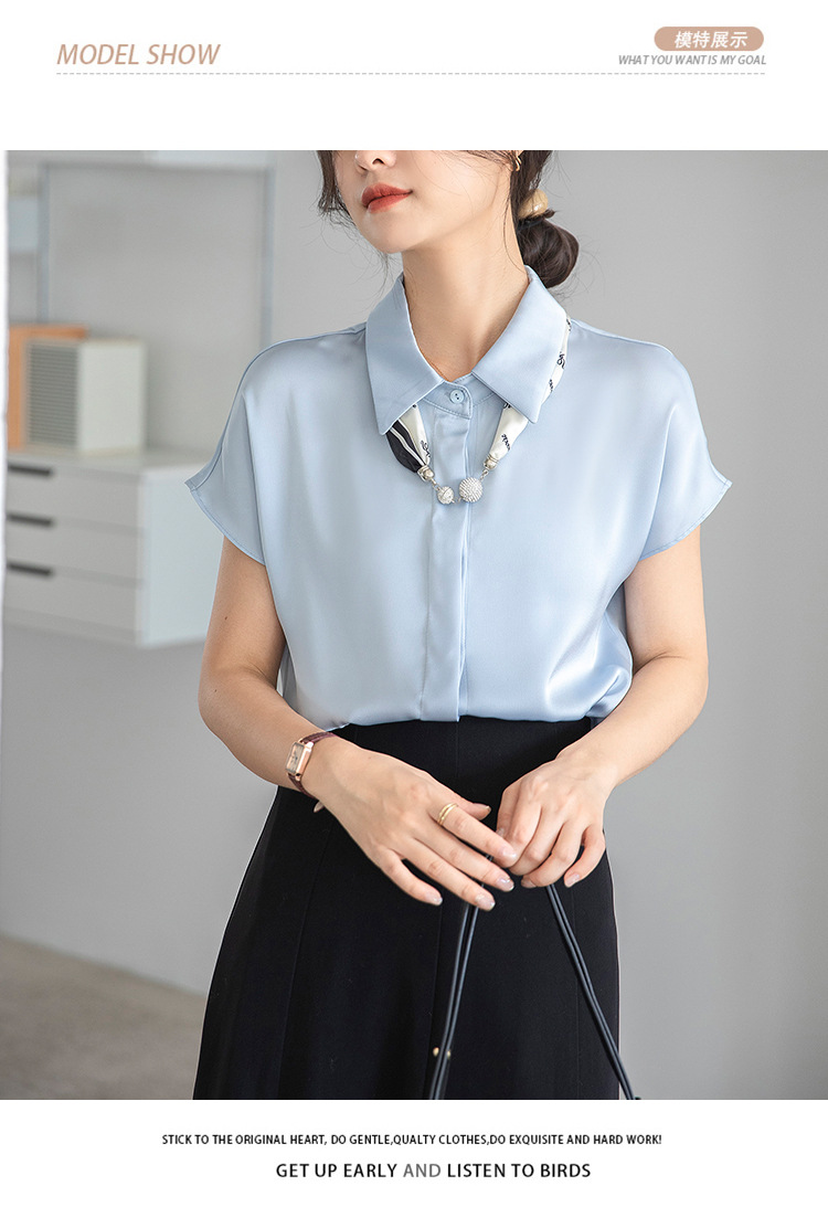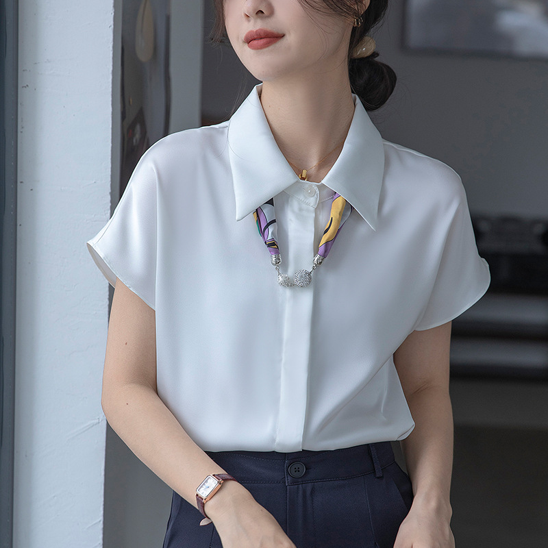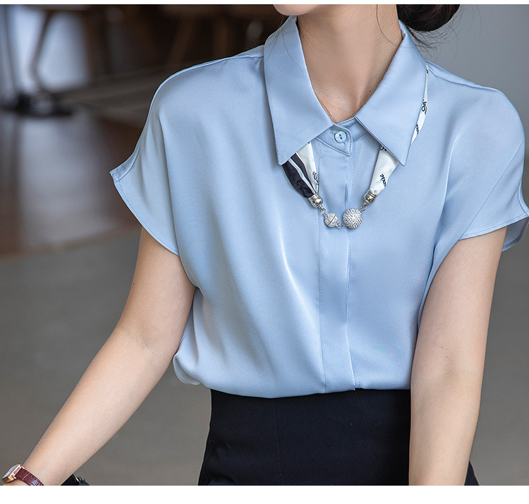 2023 진짜 새로운 한국 우아한 옷깃 실크 스카프 장식 탈착식 짧은 소매 쉬폰 셔츠 여름 얇은 탑스토어 가기