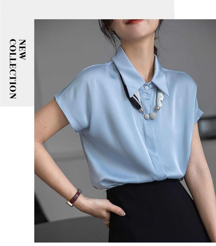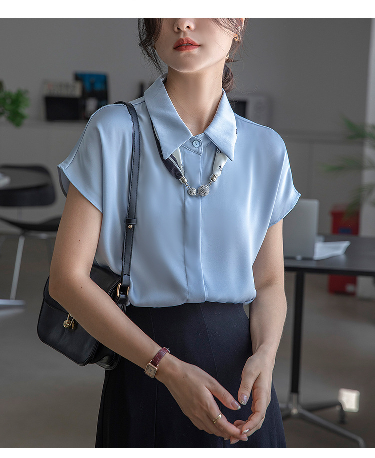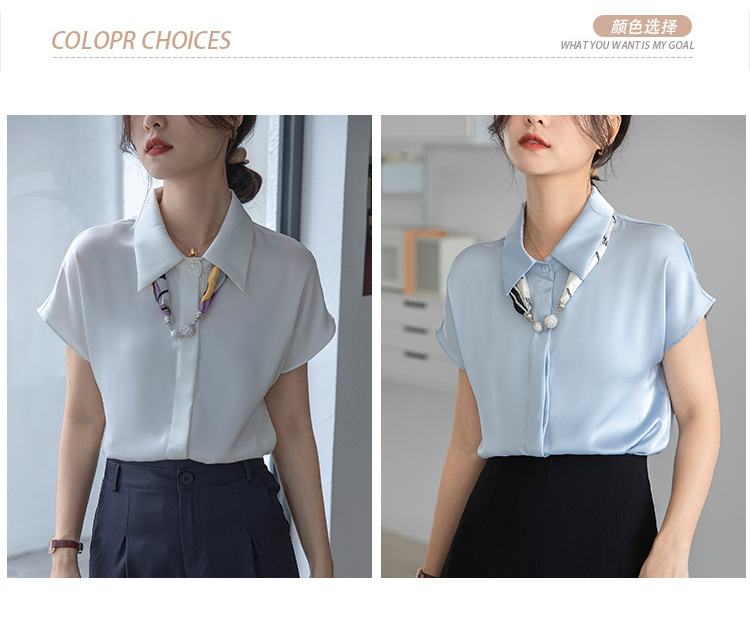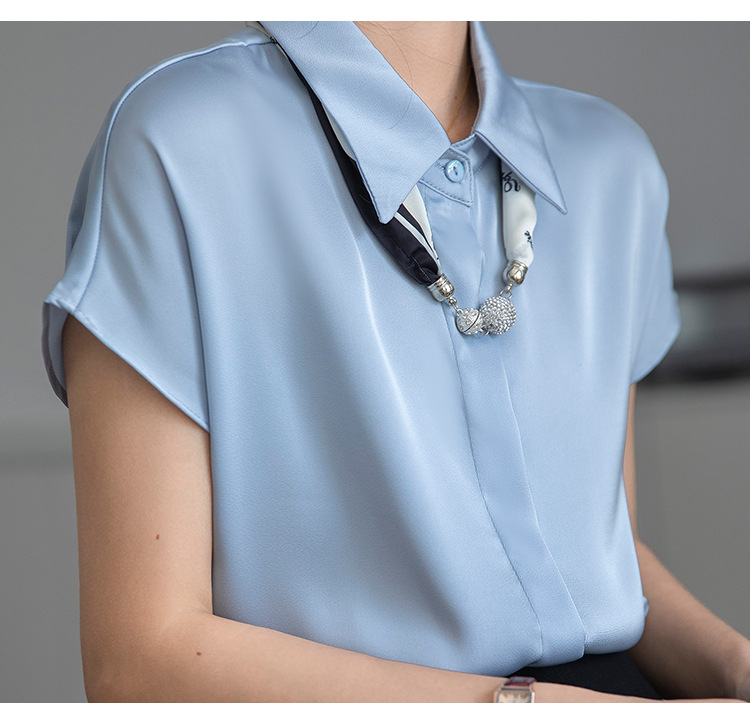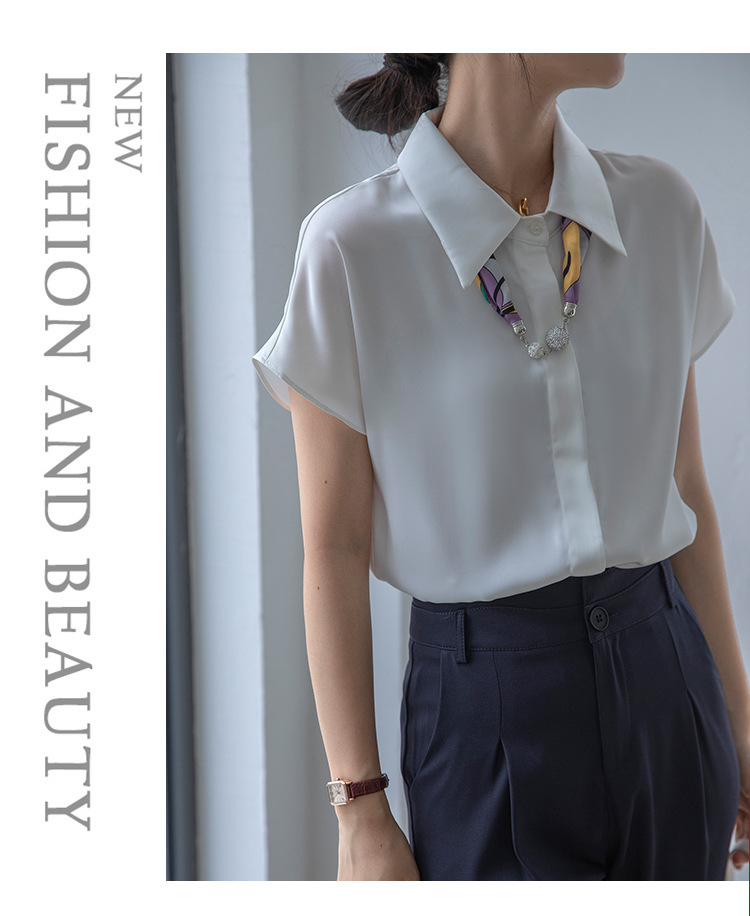 2023 진짜 새로운 한국 우아한 옷깃 실크 스카프 장식 탈착식 짧은 소매 쉬폰 셔츠 여름 얇은 탑스토어 가기