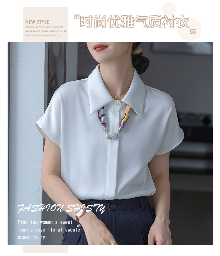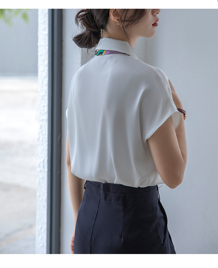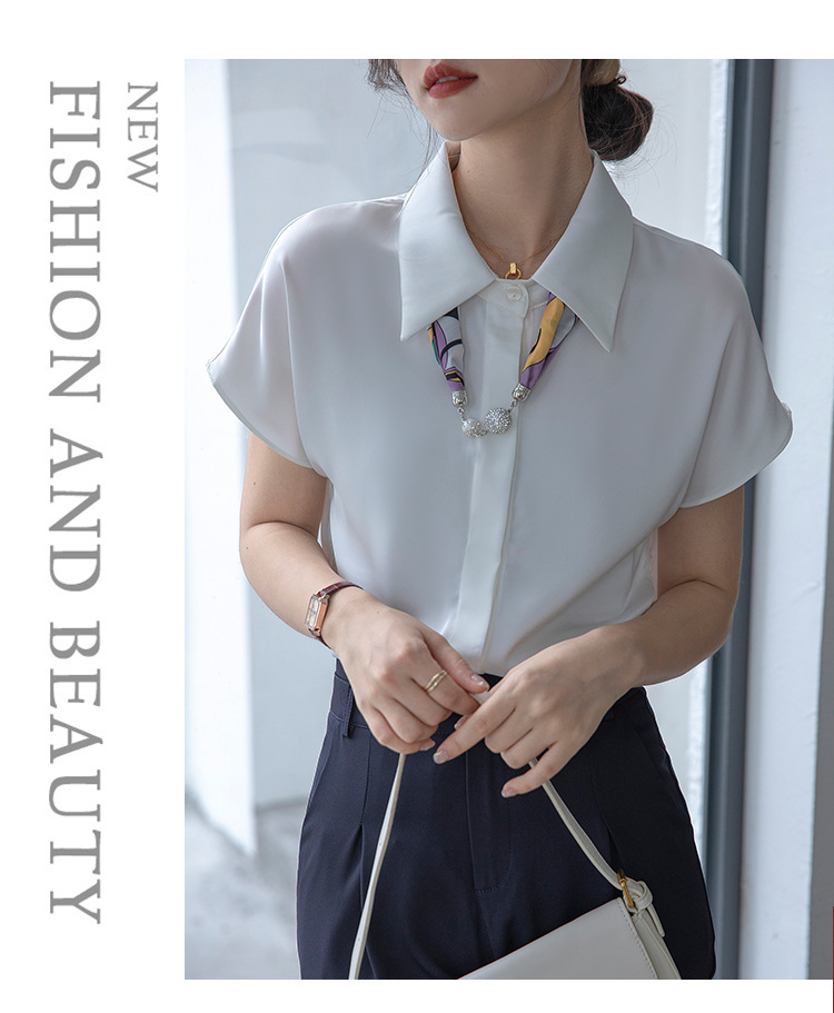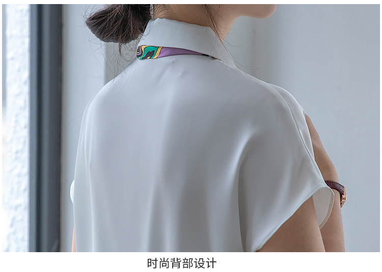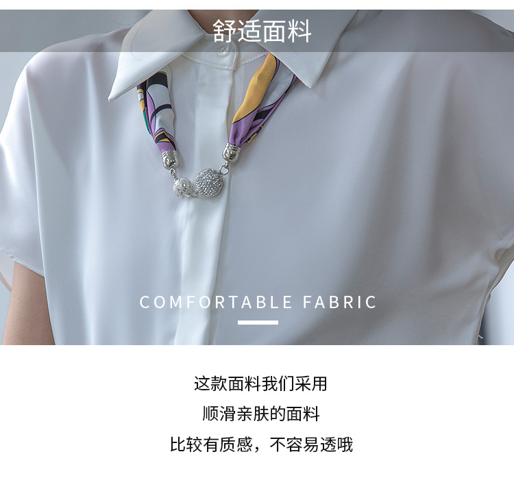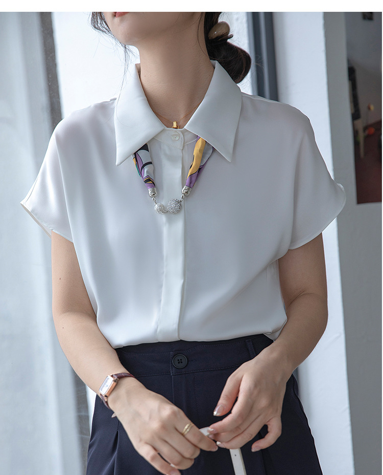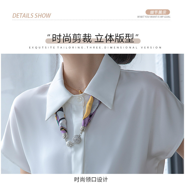 2023 진짜 새로운 한국 우아한 옷깃 실크 스카프 장식 탈착식 짧은 소매 쉬폰 셔츠 여름 얇은 탑
