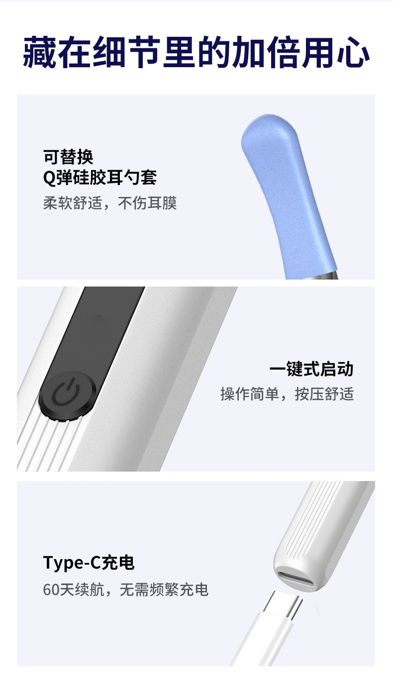 常规配置:一体机*1,硅胶耳勺*4,TYPE-C充电线*1,说明书*1