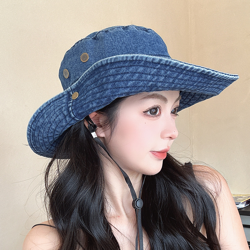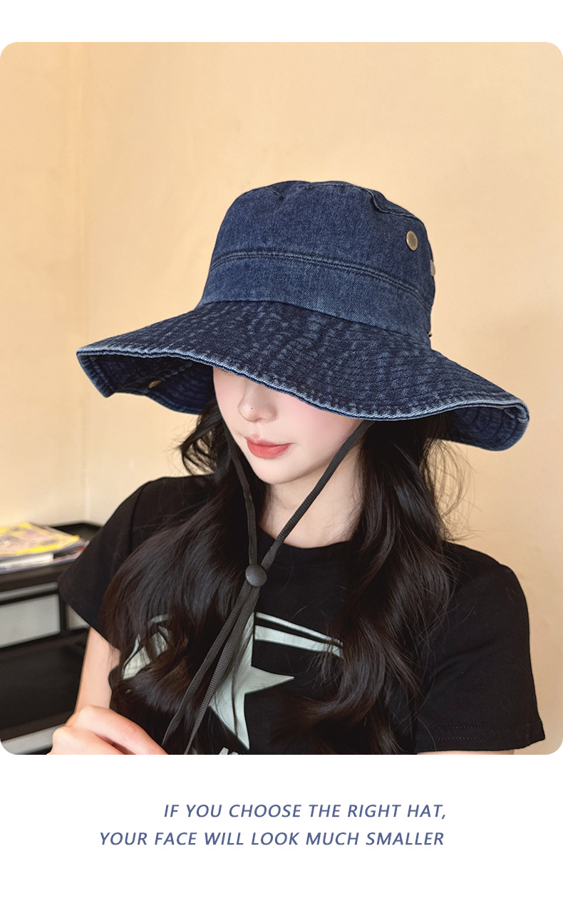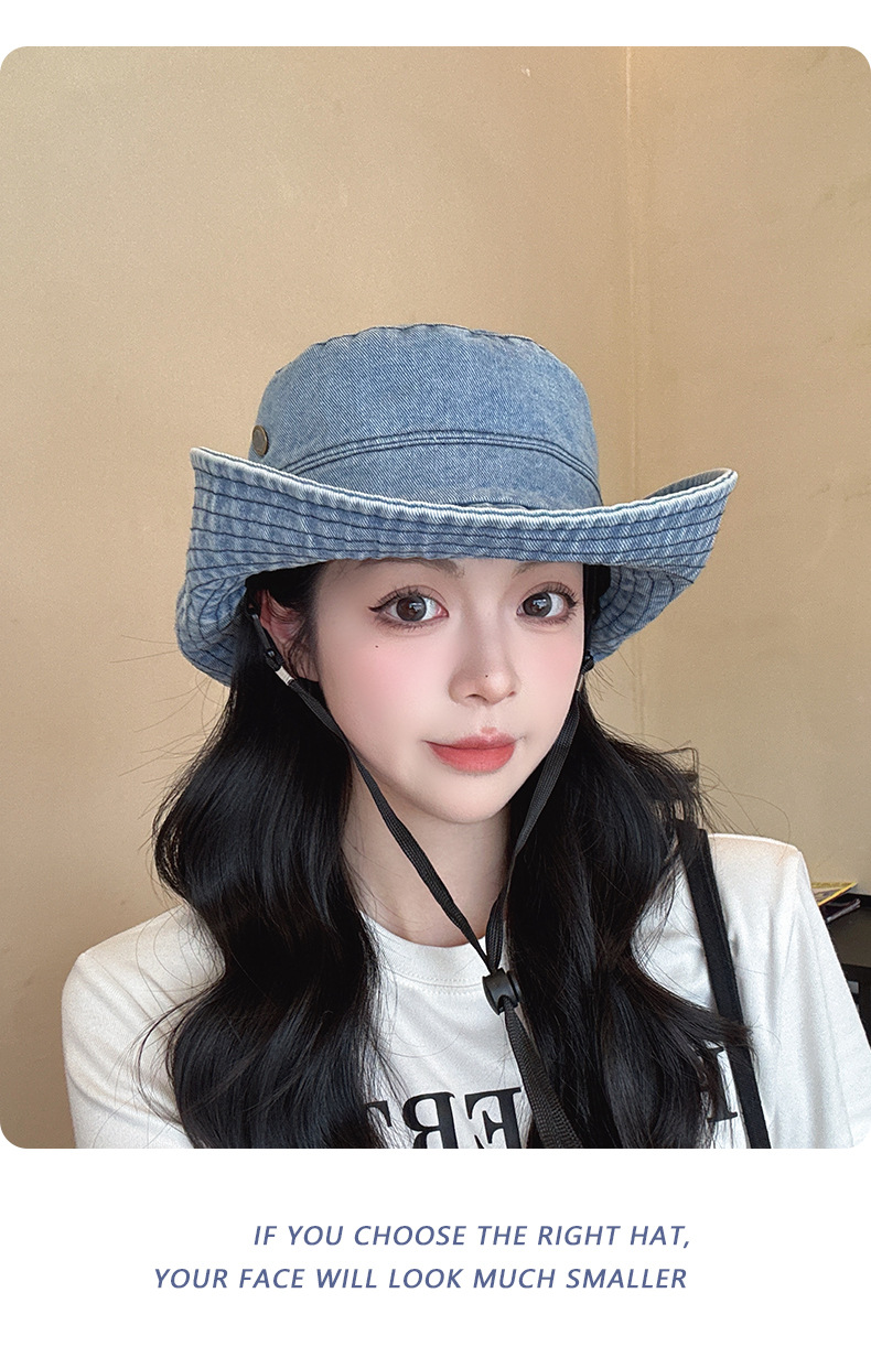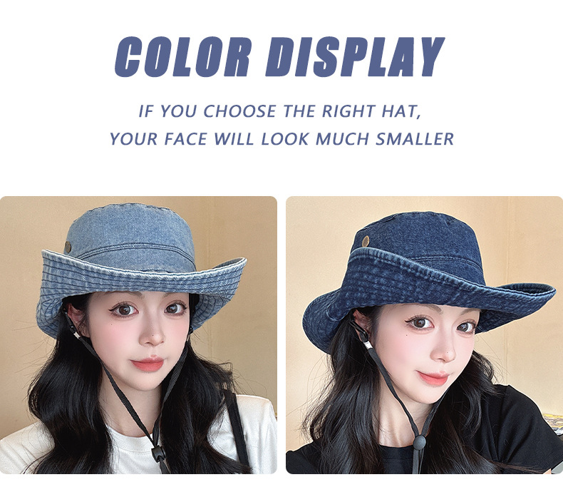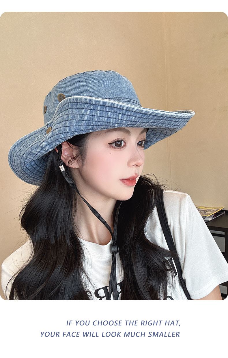 단색 데님 어부 모자 모든 경기 얼굴 모양의 작은 모자 여성 여름 큰 테두리 태양 보호 모자 복고풍 등산 모자 여성스토어 가기