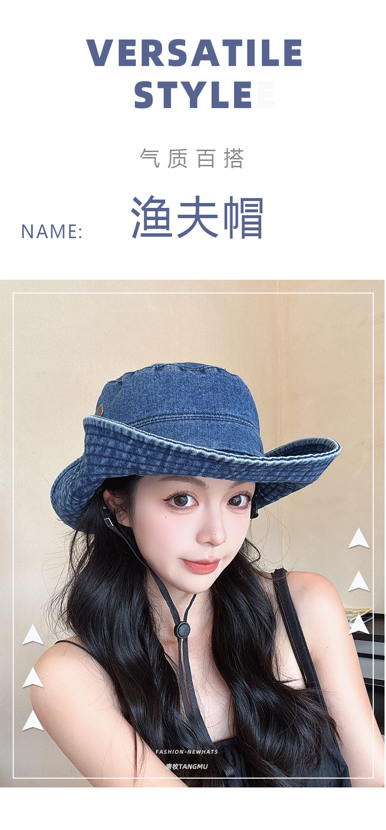 • C3738 데님 사이드 탑 버클 어부 모자 중간 파란색