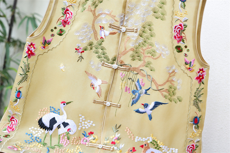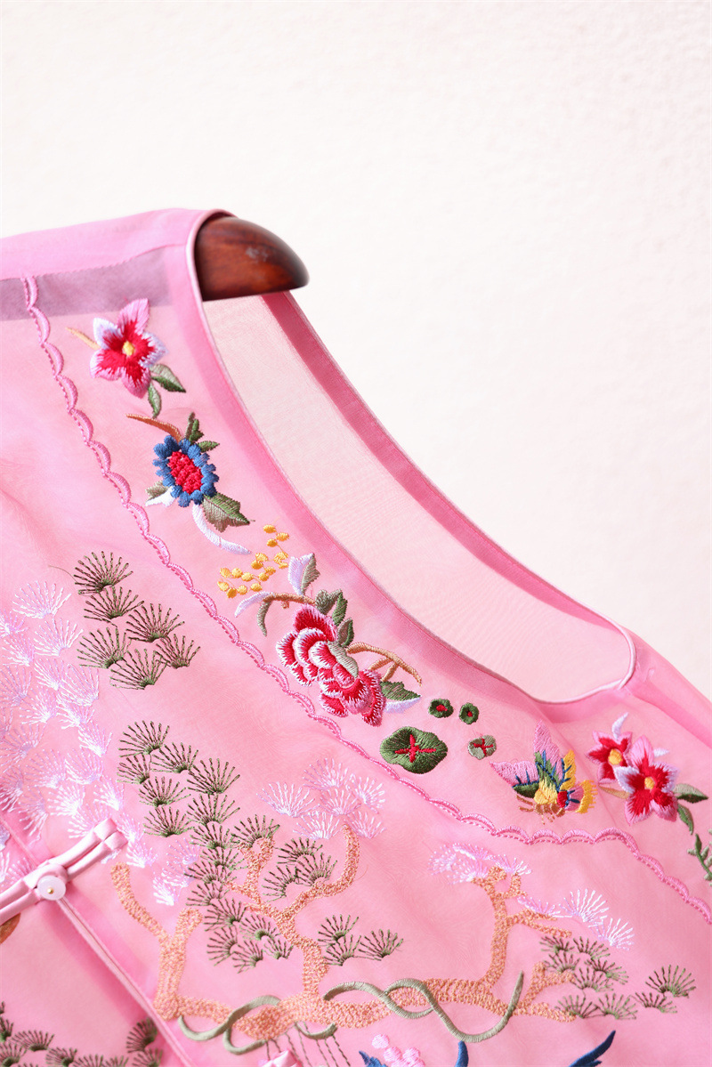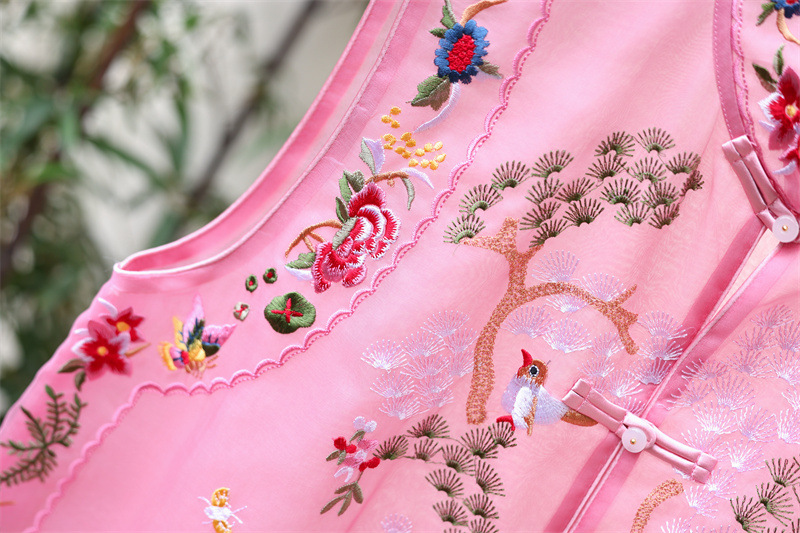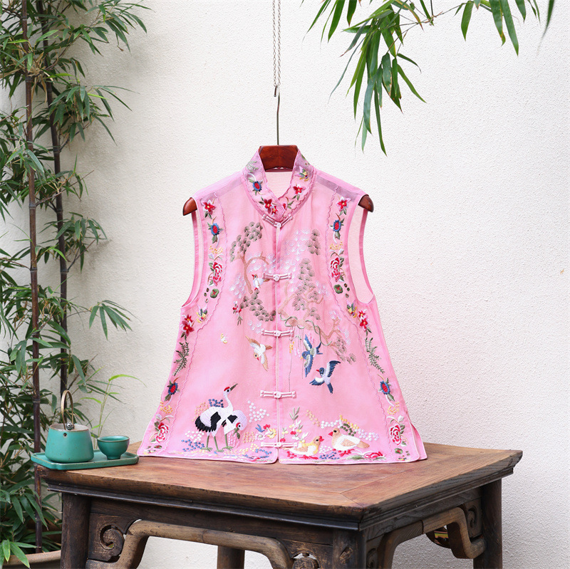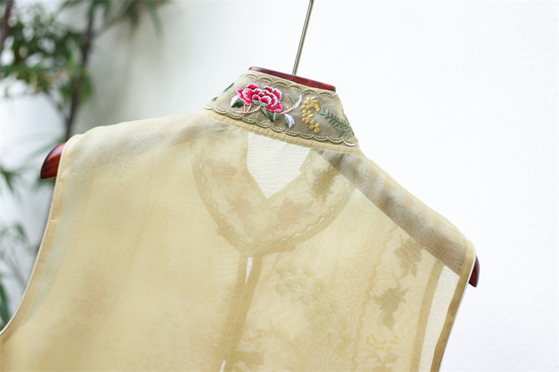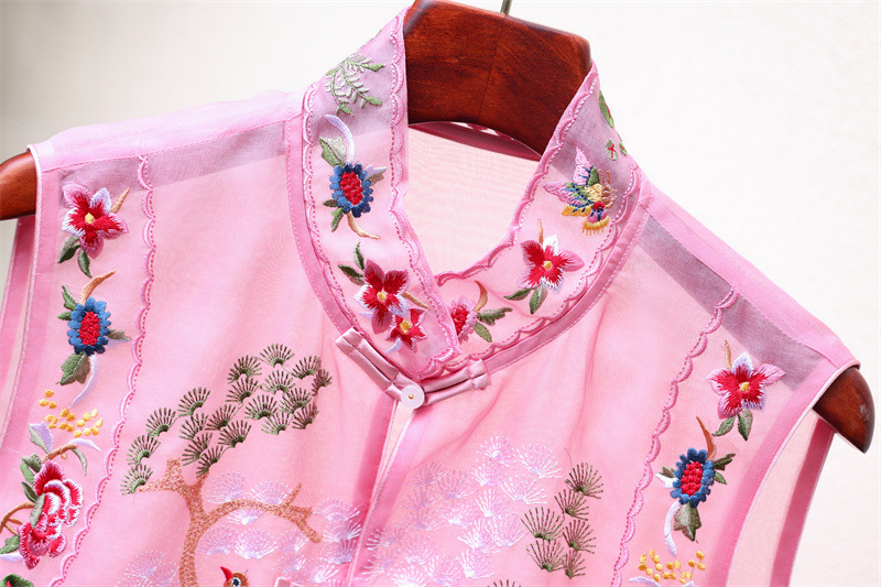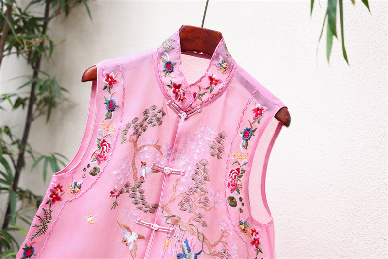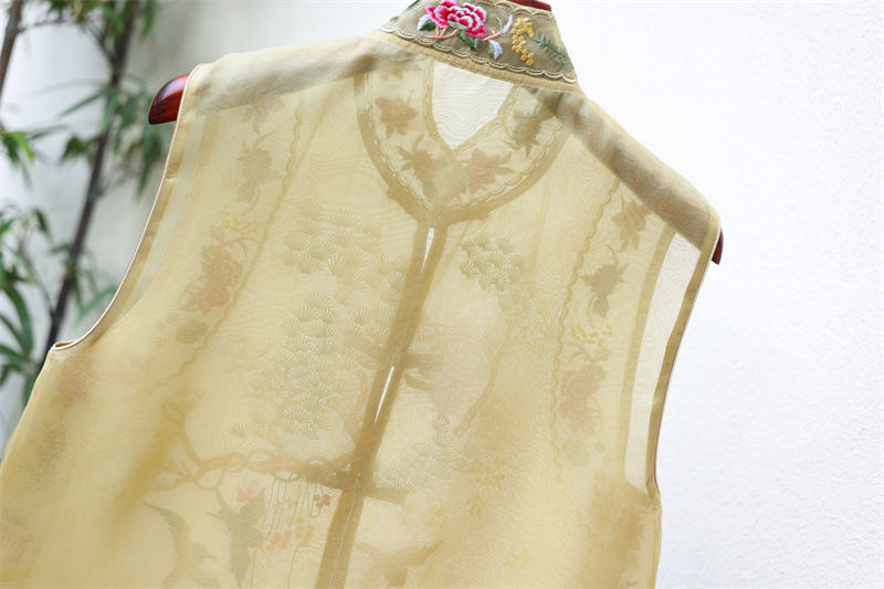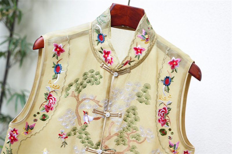 2024 봄과 여름 국가 패션 무거운 자수 더블 레이어 실크 오간자 중국 조끼 여성 버클 민소매 탑스토어 가기