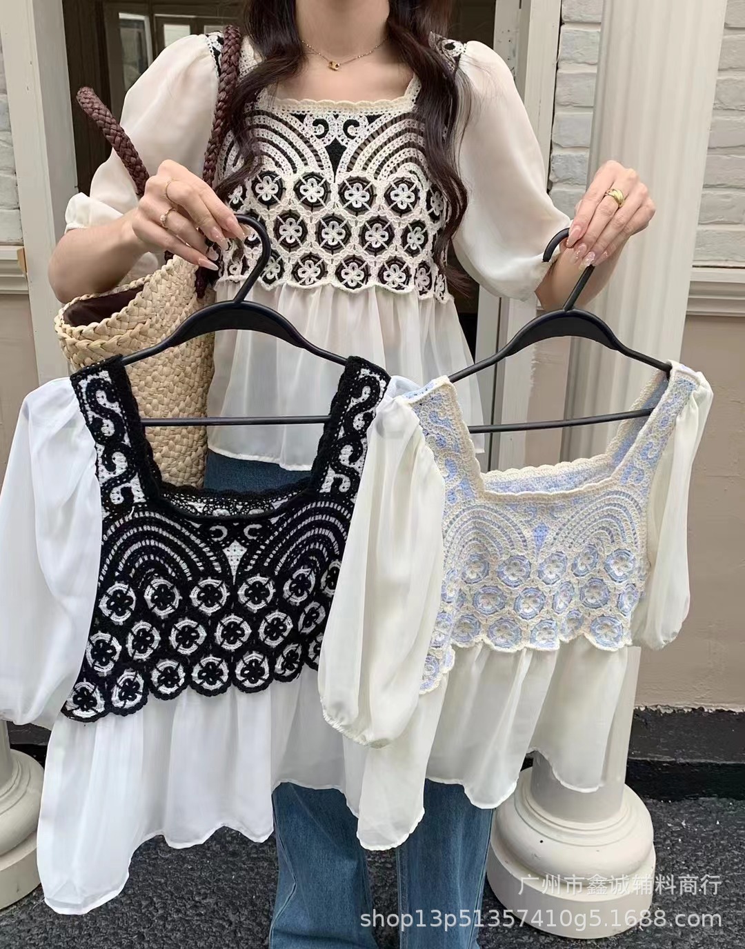 여름 새로운 한국 스타일 스퀘어 칼라 수 놓은 쉬폰 셔츠 여성 디자인 감각 틈새 느슨한 슬리밍 달콤한 셔츠 탑 패션