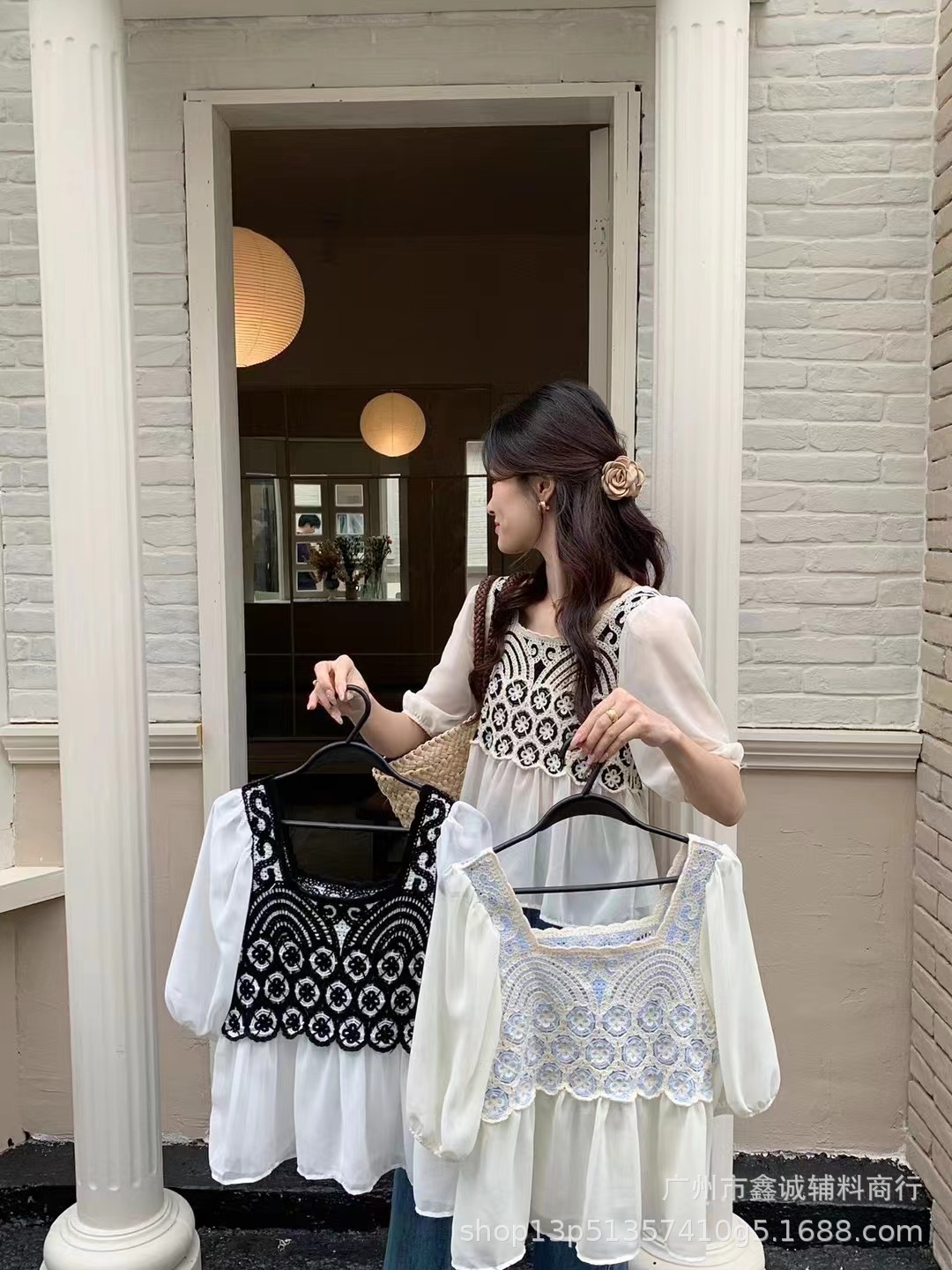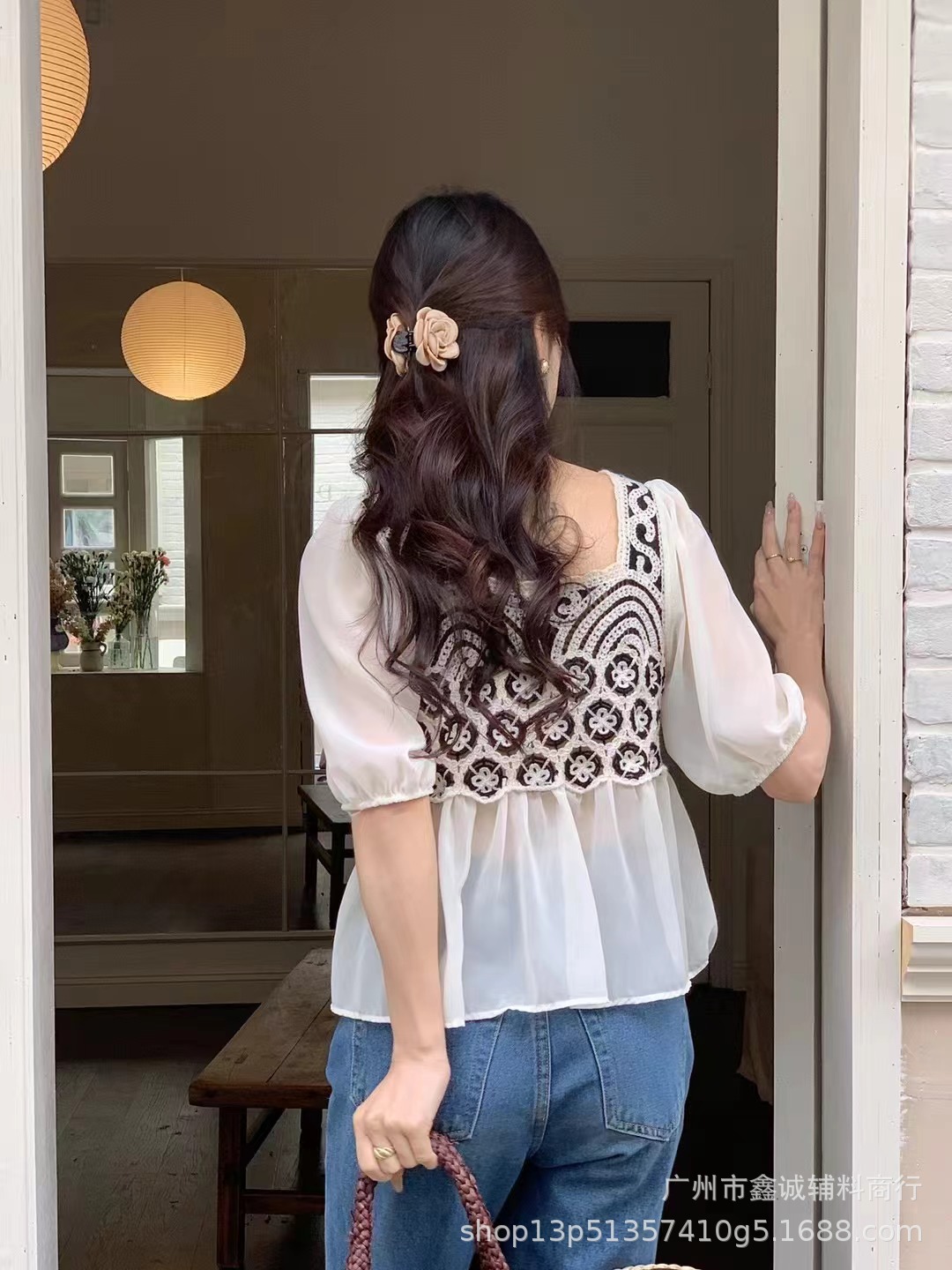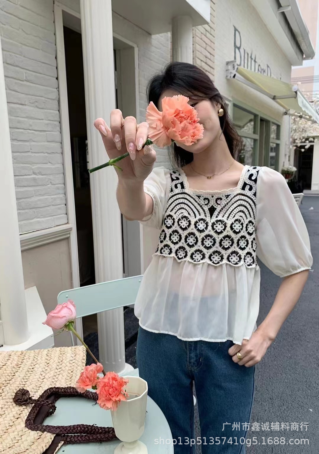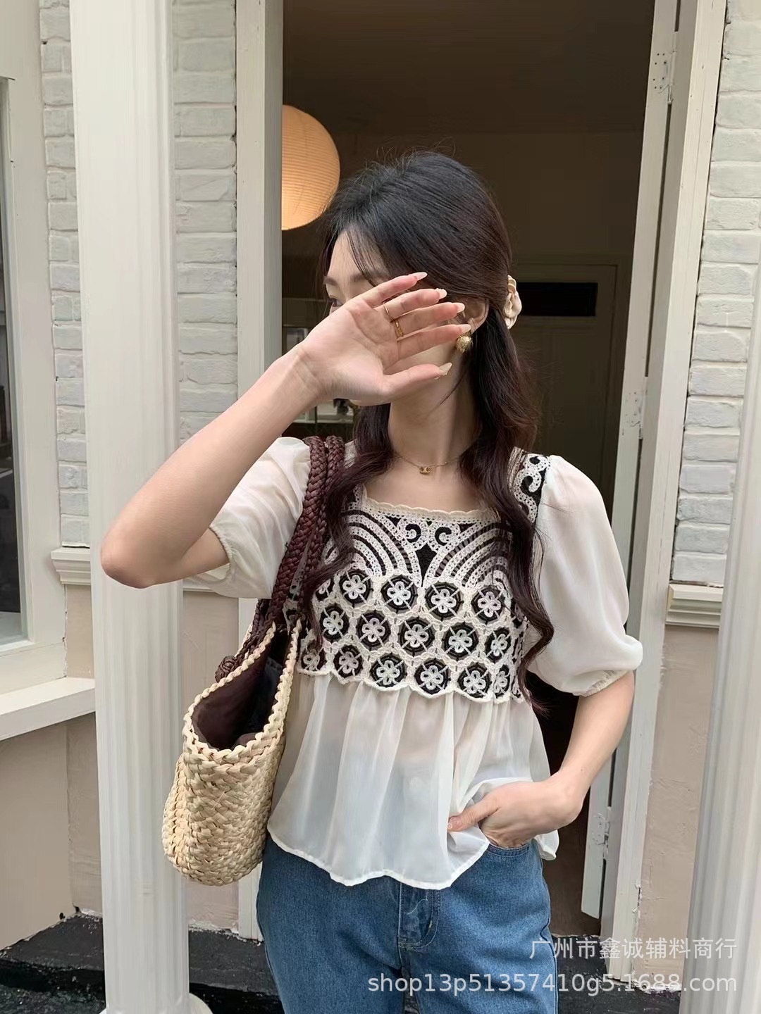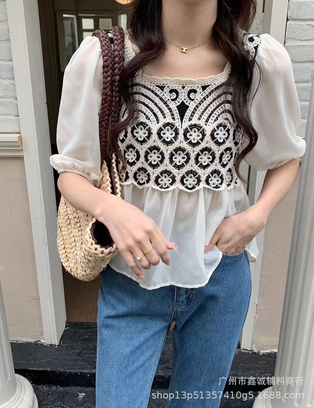 여름 새로운 한국 스타일 스퀘어 칼라 수 놓은 쉬폰 셔츠 여성 디자인 감각 틈새 느슨한 슬리밍 달콤한 셔츠 탑 패션스토어 가기
