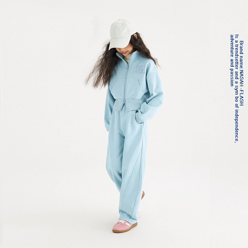 봄 새로운 어린이 스탠드 칼라 지퍼 스웨터 스웨터 세트 중형 및 대형 소녀 캔디 컬러 편지 인쇄 캐주얼 웨어스토어 가기