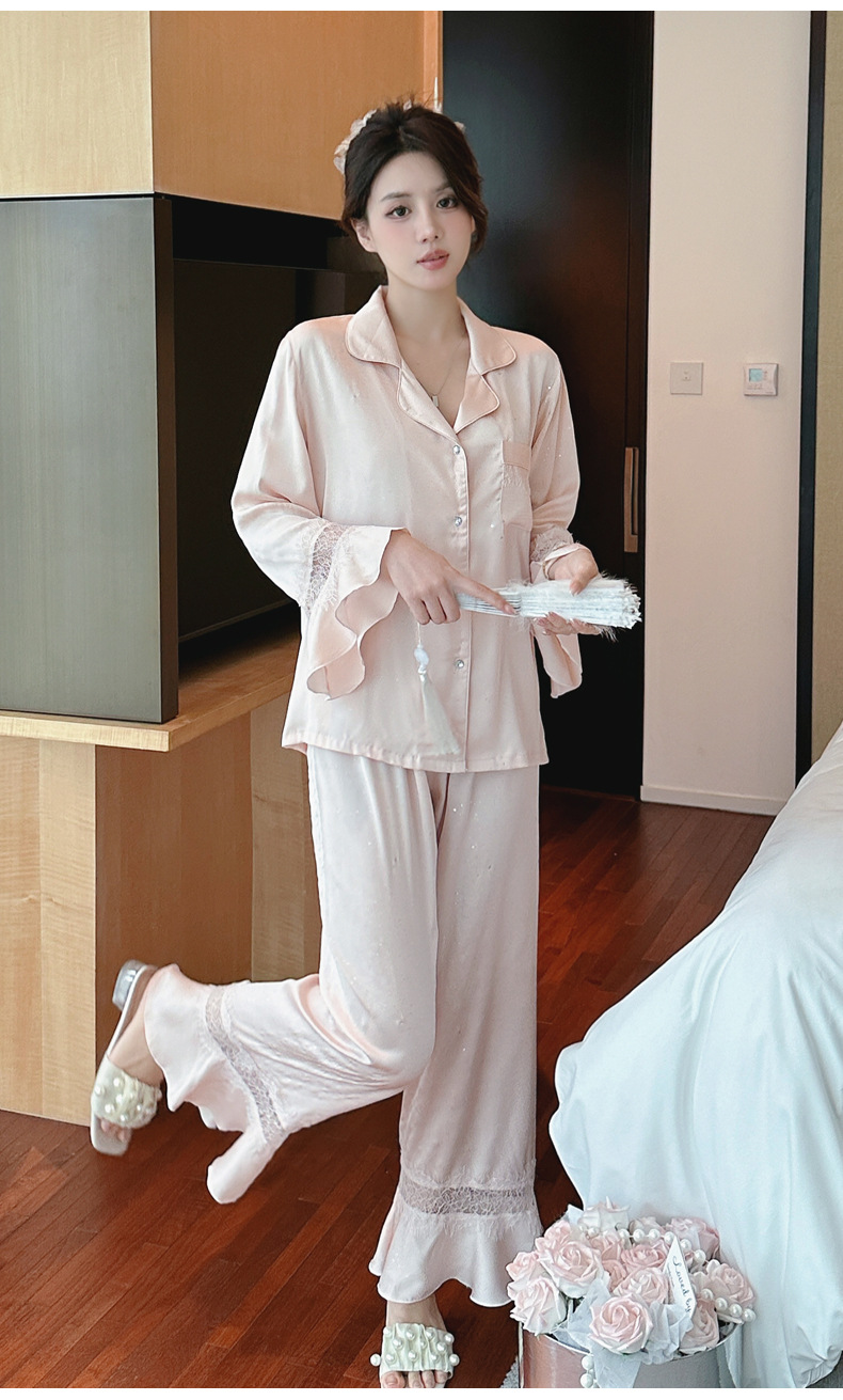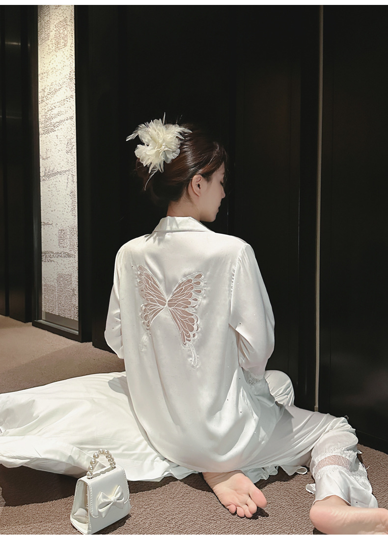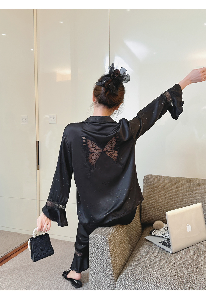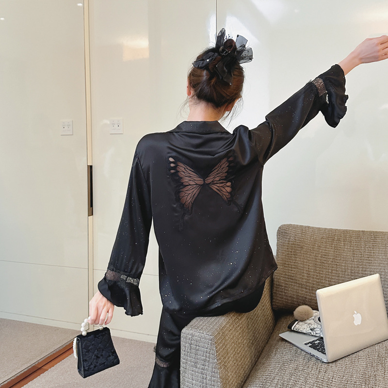 2025 봄 신상품 아이스 실크 잠옷 여성용 나비 모양 빈티지 스타일 프렌치 요정 스타일 홈웨어 단색 세트