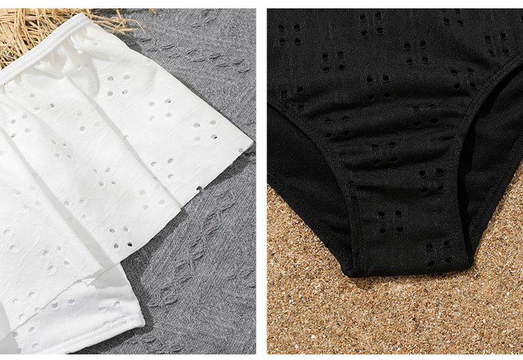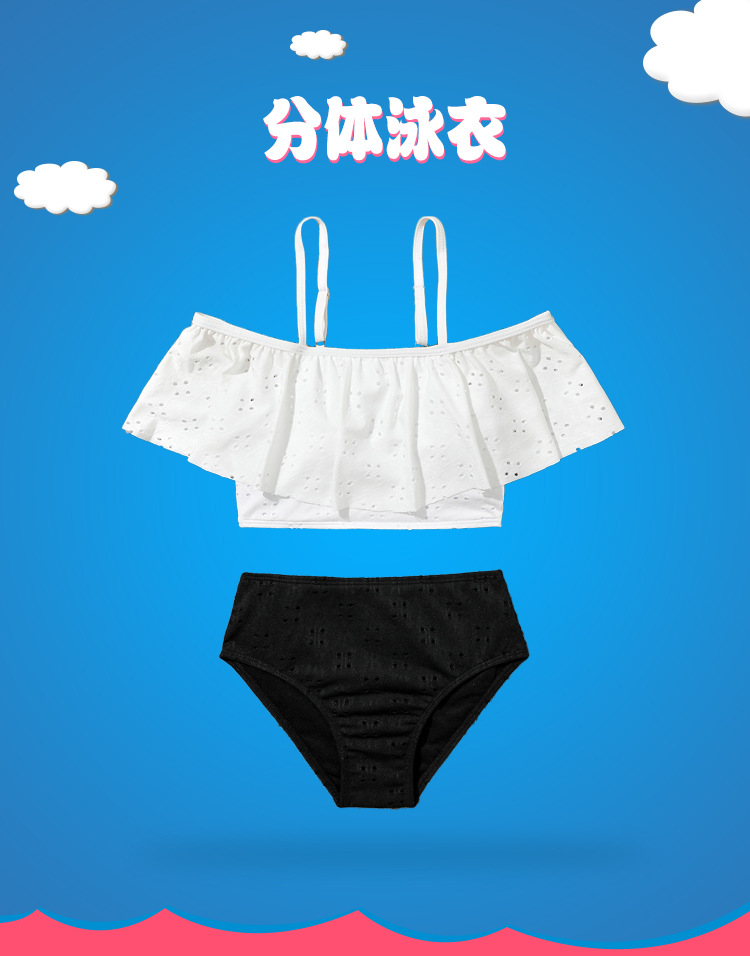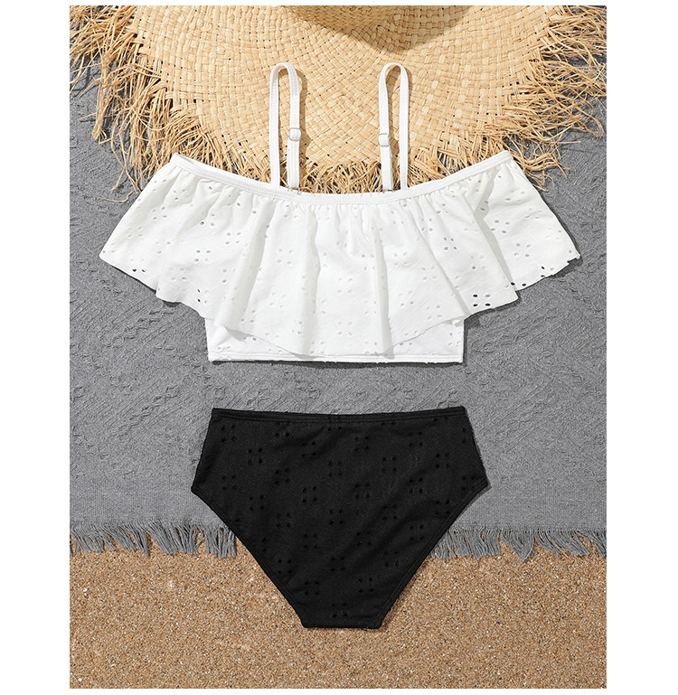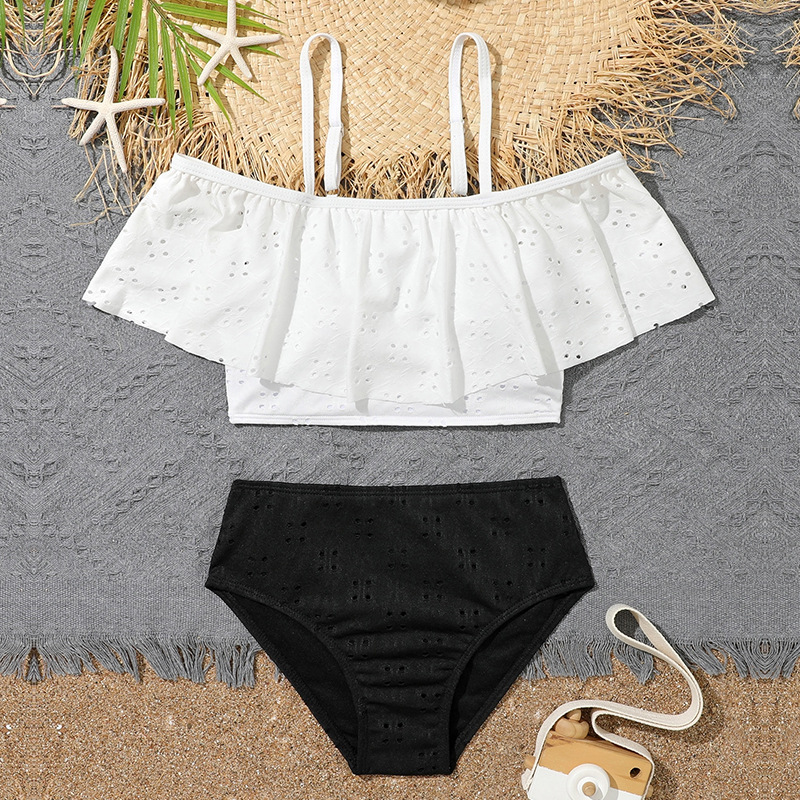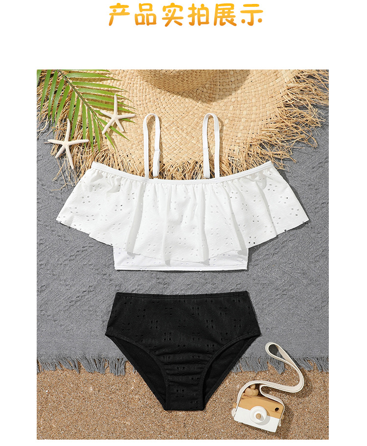 유럽과 미국의 새로운 2024년 아동 수영복, 청소년 소녀용 흑백 배색 수영복, 해외 전용 끈이 달린 러플 디자인