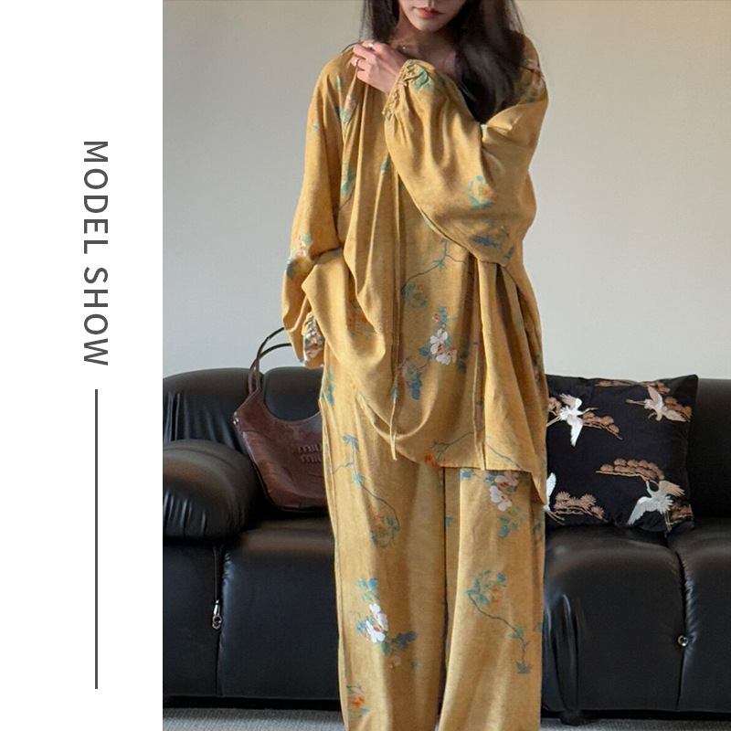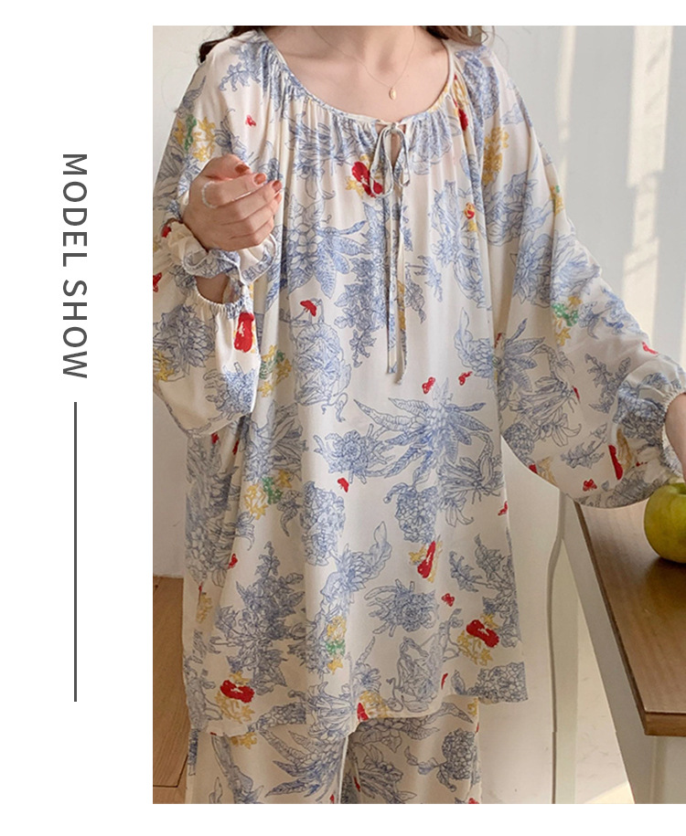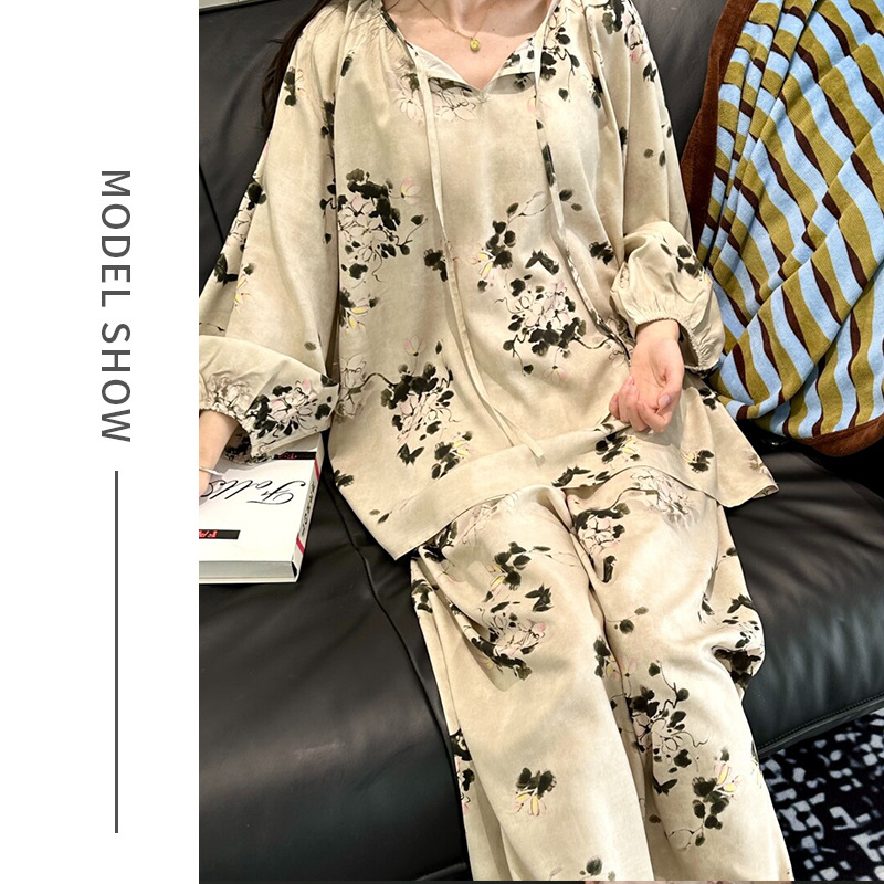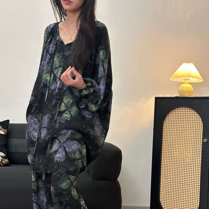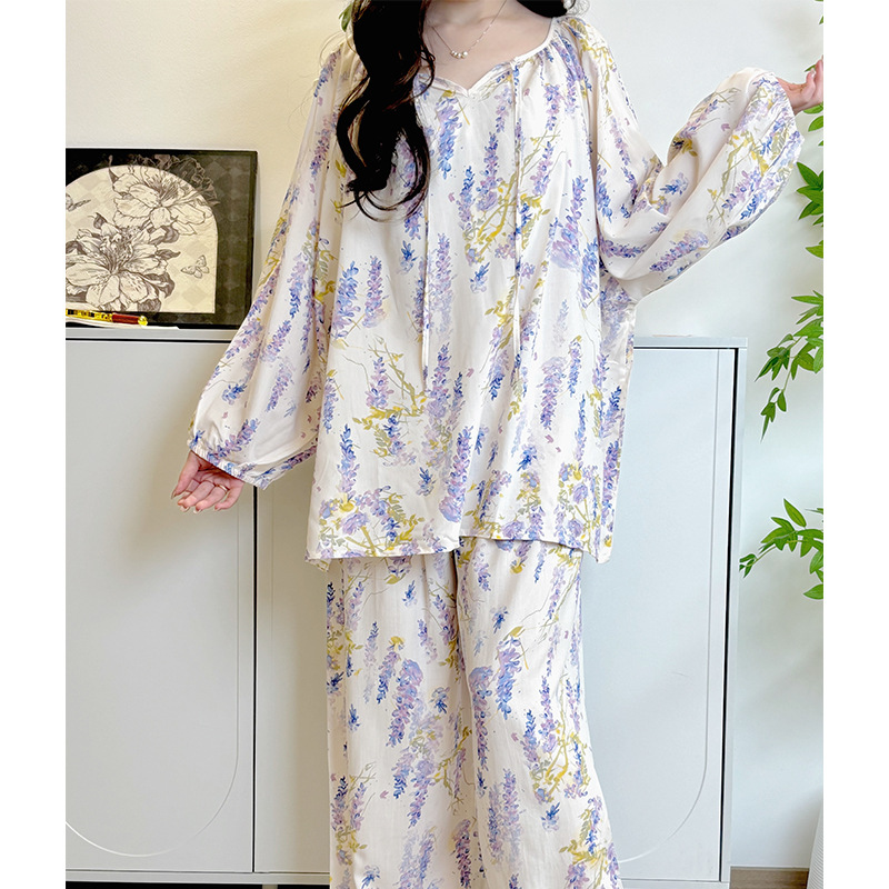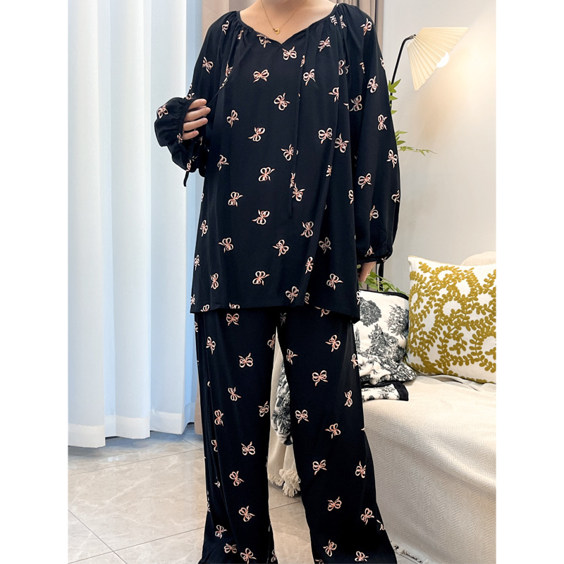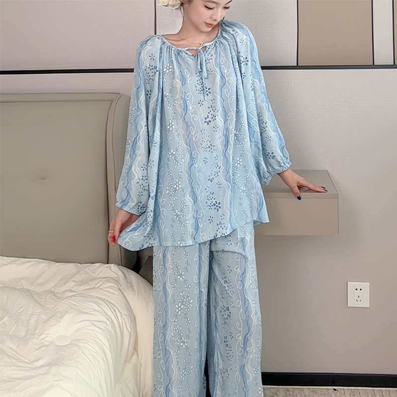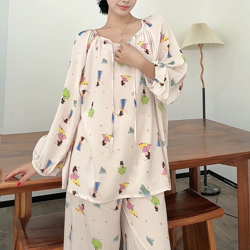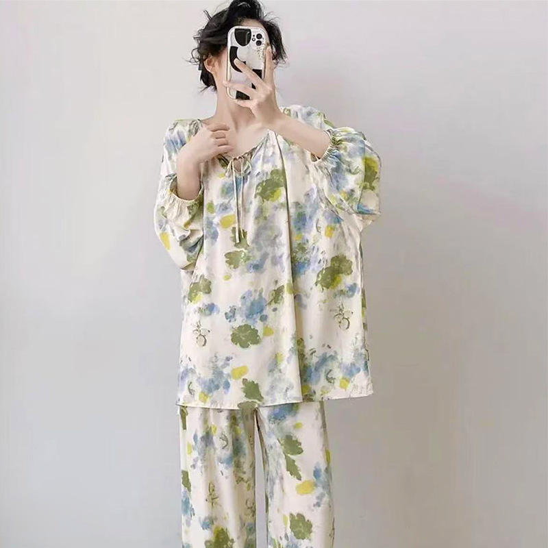 봄과 가을면 실크 파자마 여성의 여름 얇은 프린트 바지 느슨한 플러스 사이즈 통통녀 착용 가능한 가정복 200kg스토어 가기