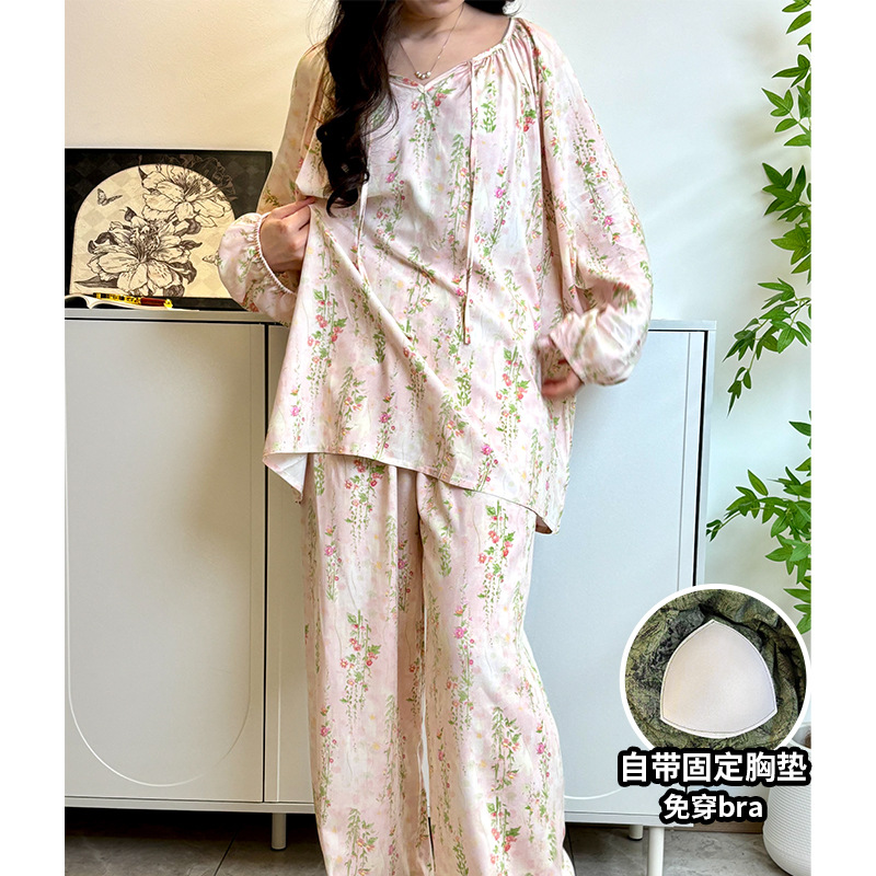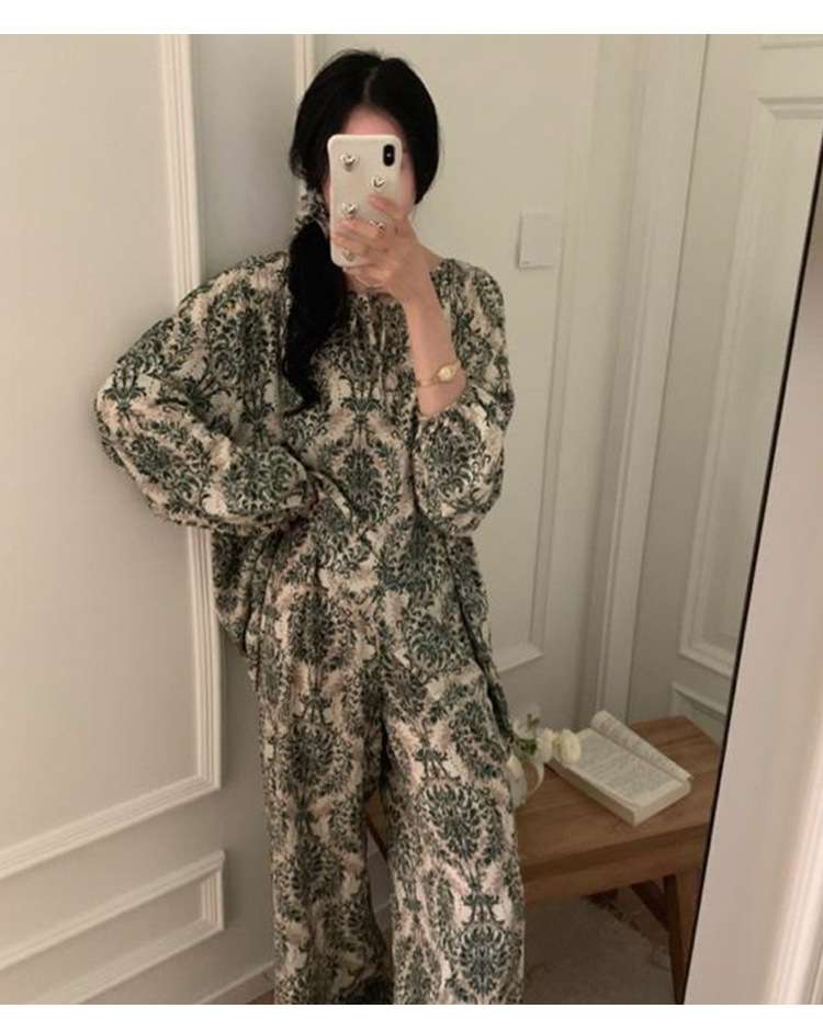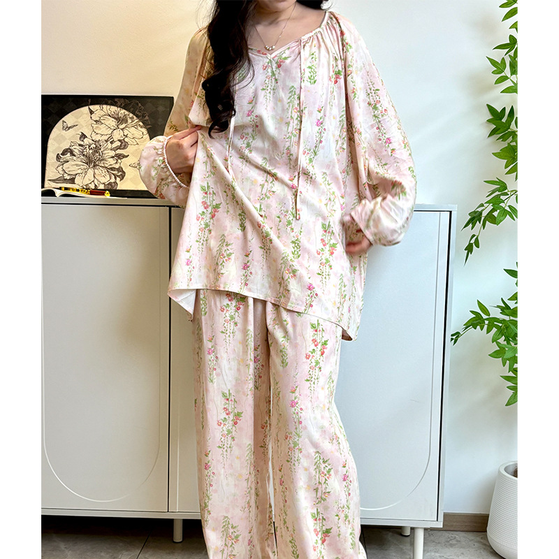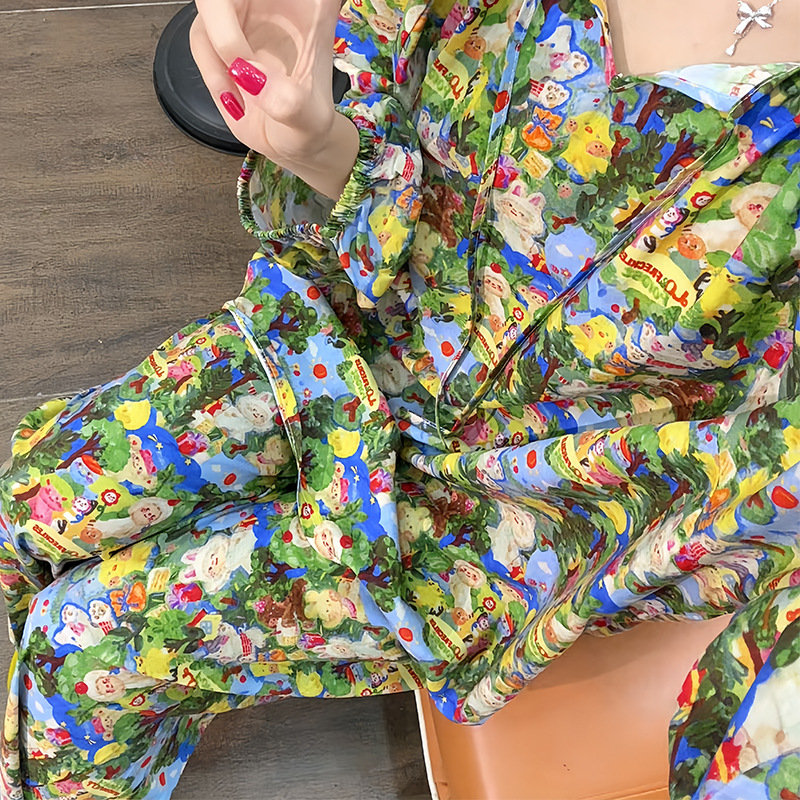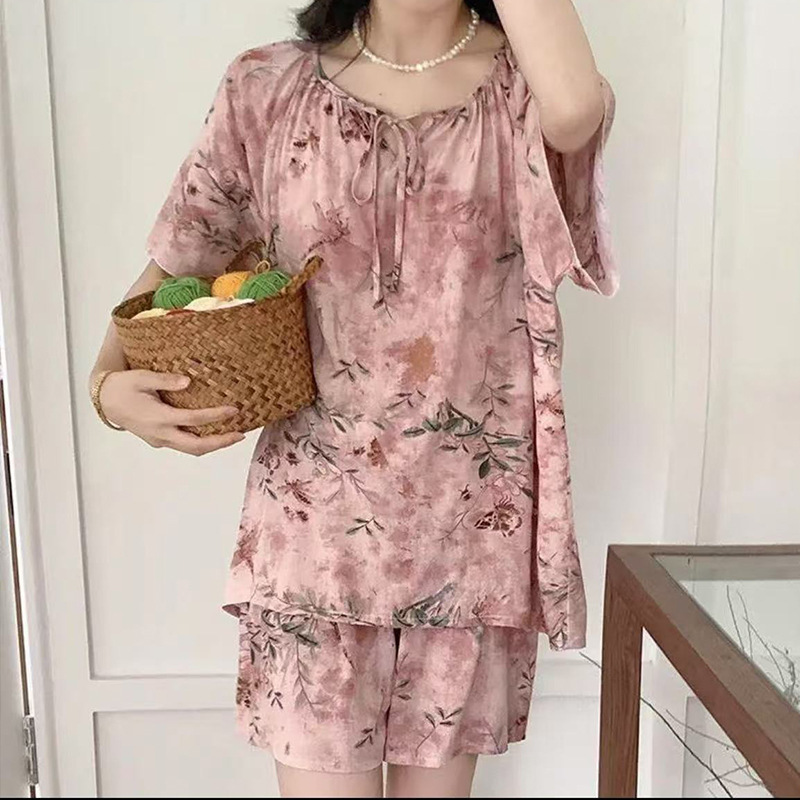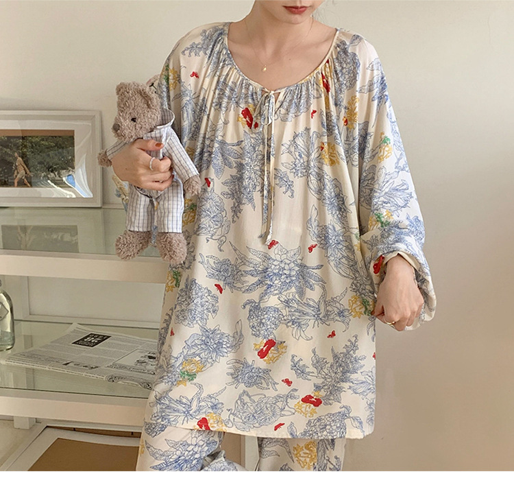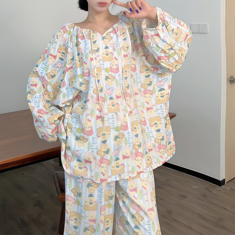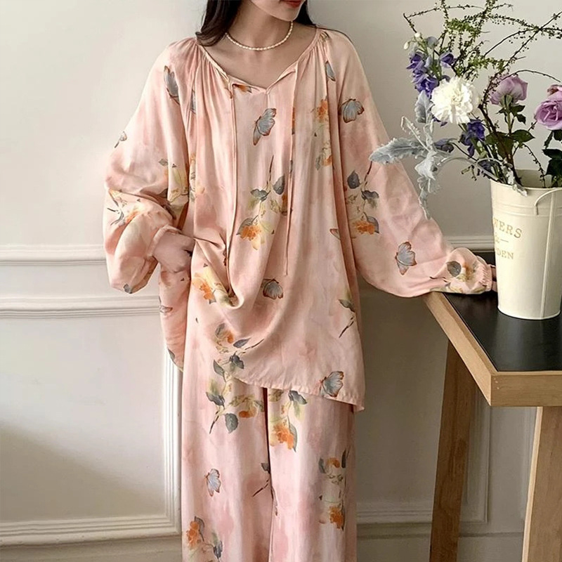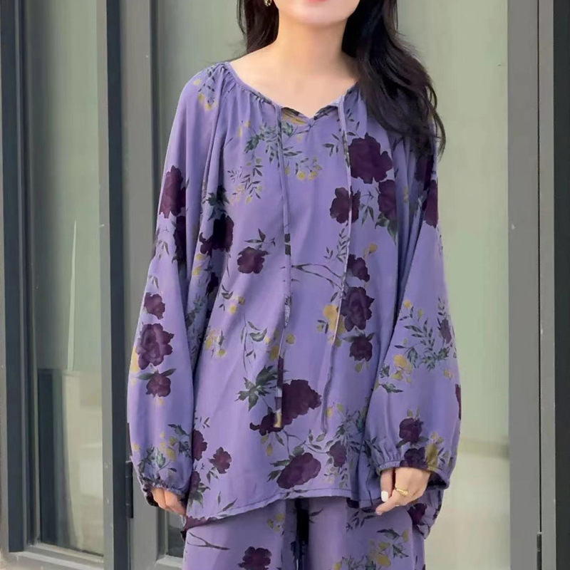 봄과 가을면 실크 파자마 여성의 여름 얇은 프린트 바지 느슨한 플러스 사이즈 통통녀 착용 가능한 가정복 200kg스토어 가기