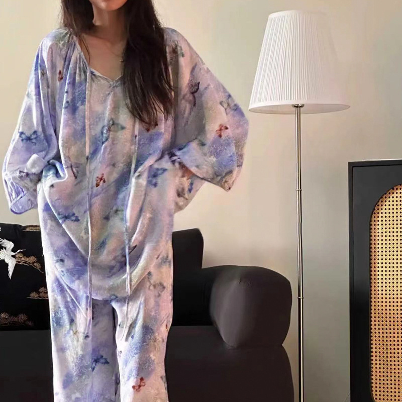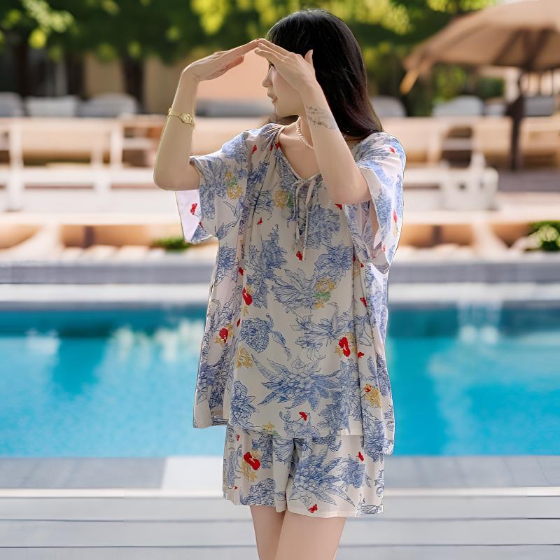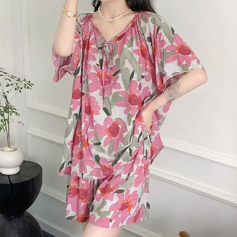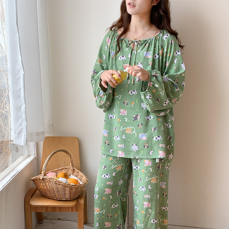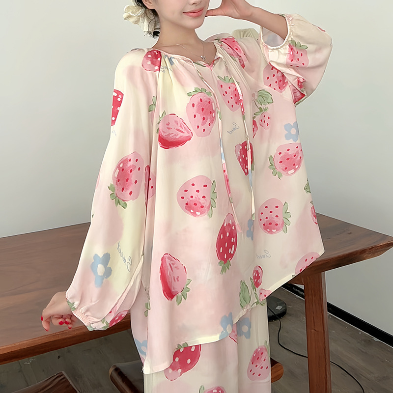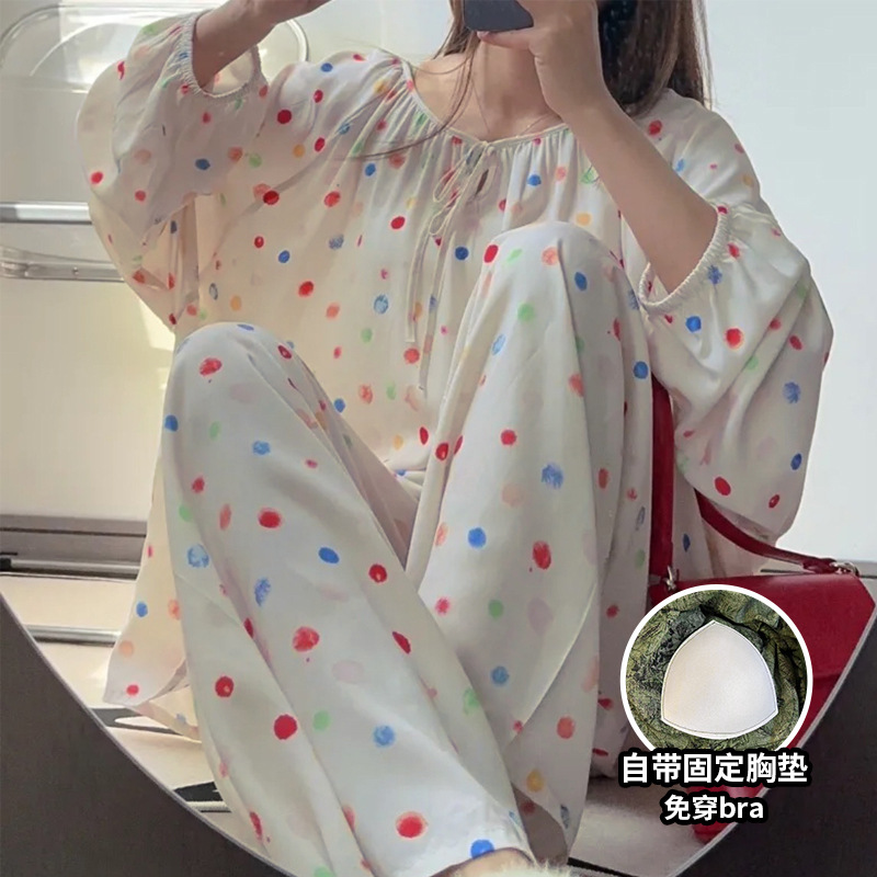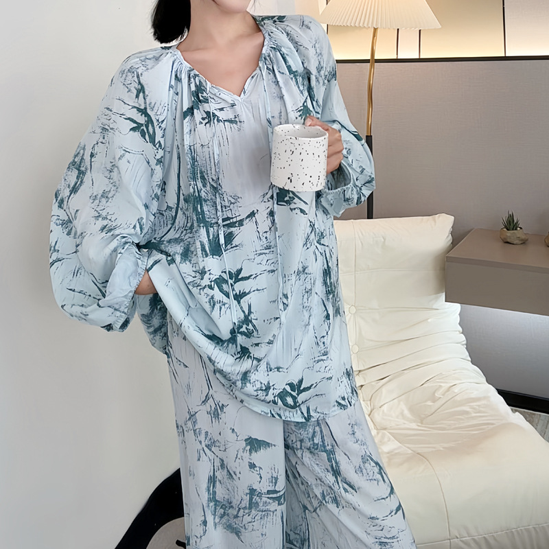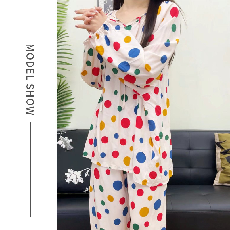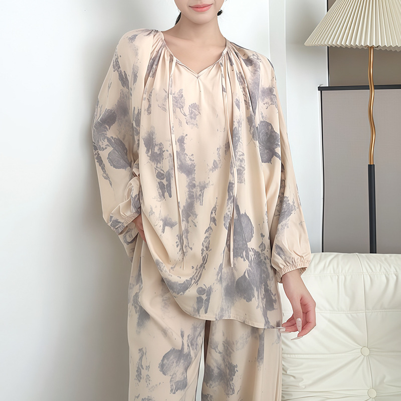 봄과 가을면 실크 파자마 여성의 여름 얇은 프린트 바지 느슨한 플러스 사이즈 통통녀 착용 가능한 가정복 200kg스토어 가기