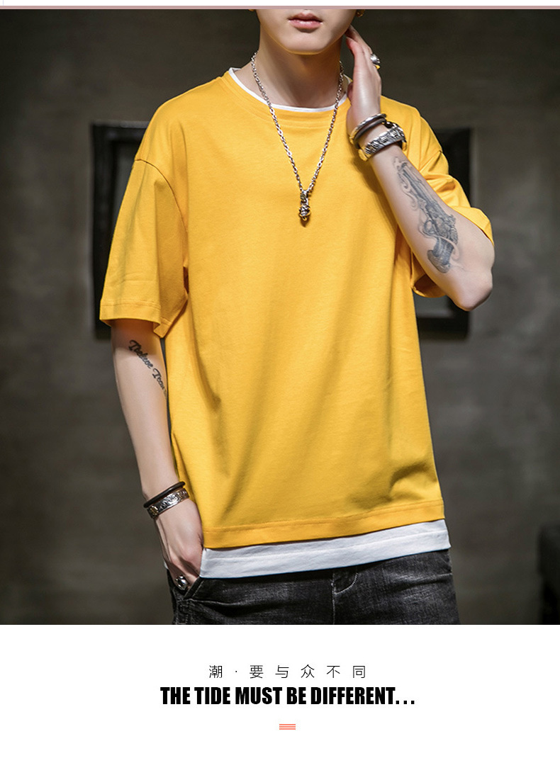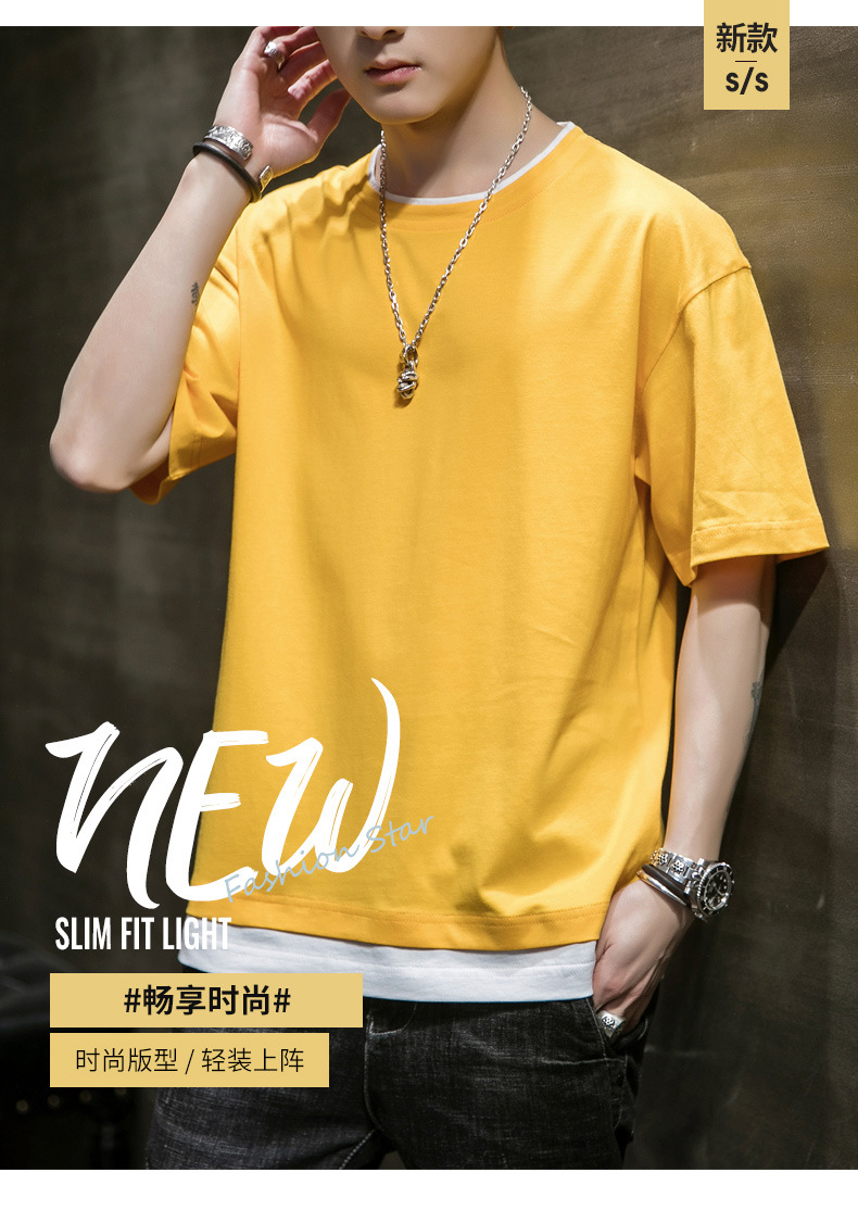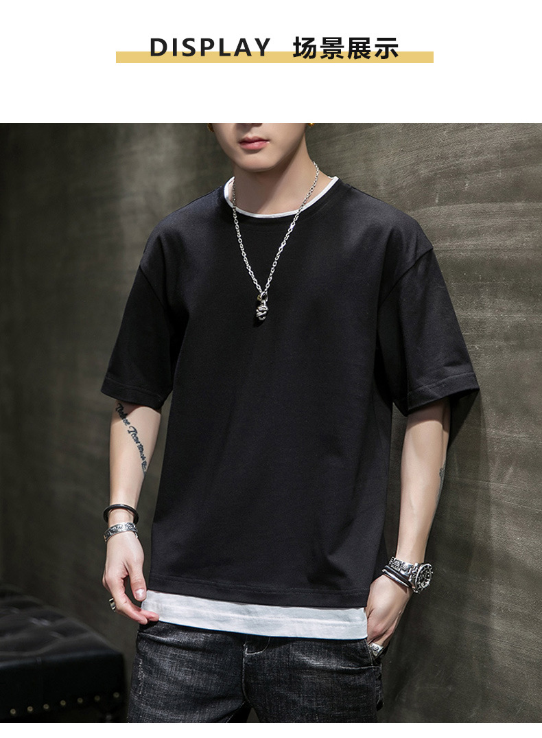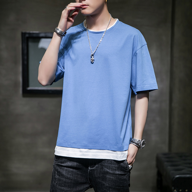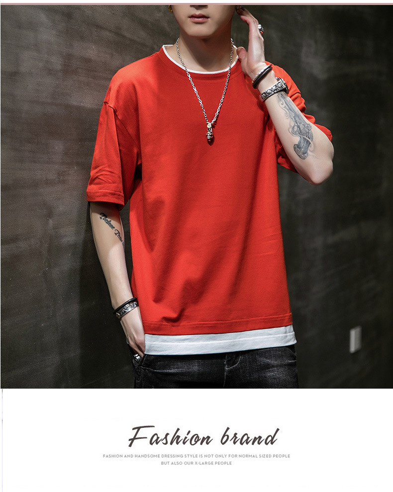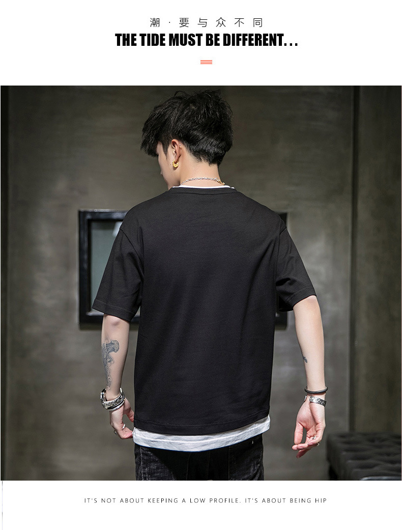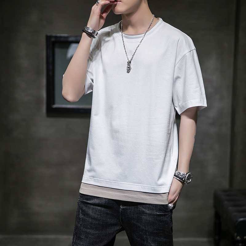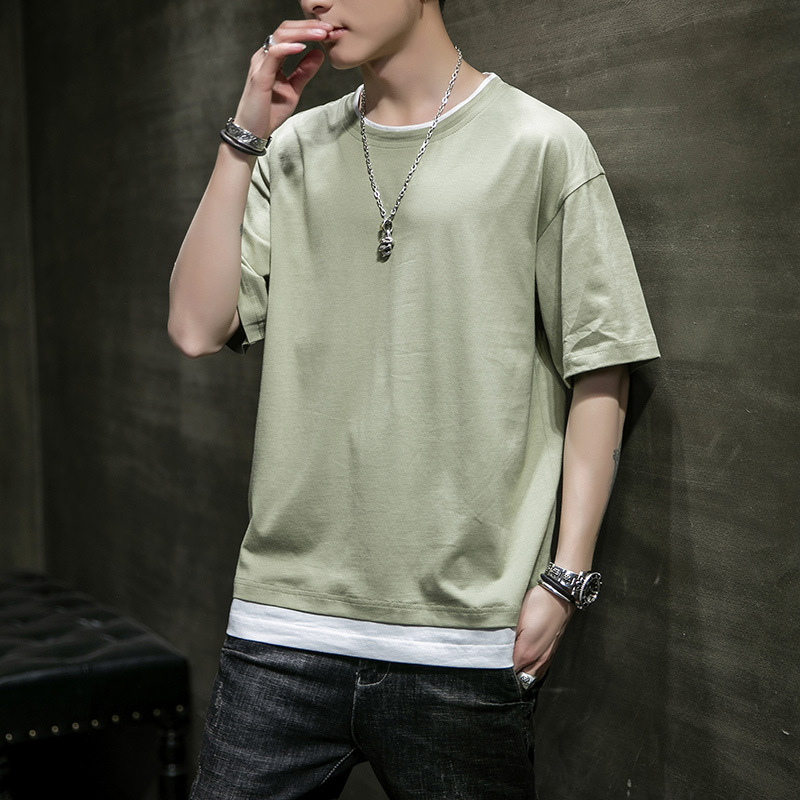 청소년 반소매 티셔츠 남성 여름 일본 패션 브랜드 코튼 스티칭 반팔 티셔츠 새로운 라운드 넥 느슨한 스포츠 T