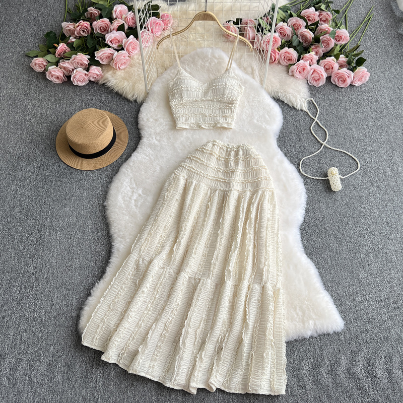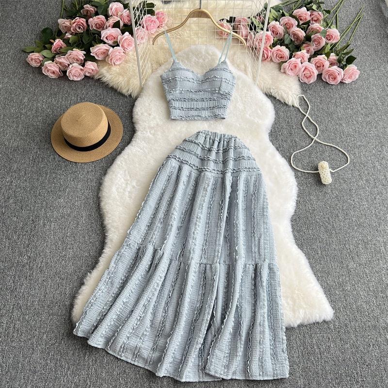 나이를 줄이는 세트 여성 여름 착용 2023 새로운 스트랩 탑 짧은 다용도 대형 스윙 스커트 달콤한 투피스 세트 패션스토어 가기