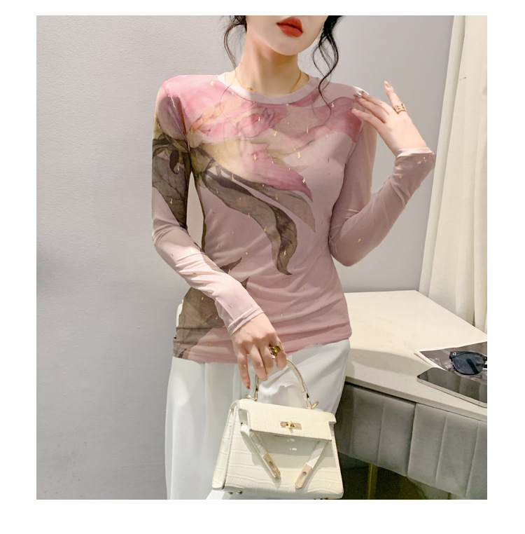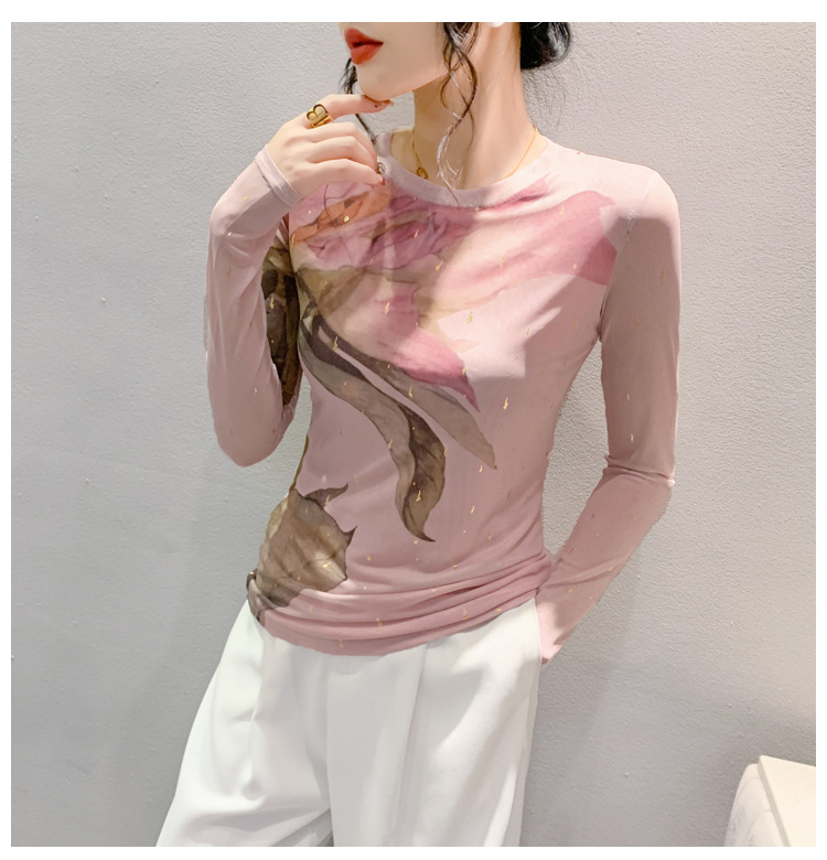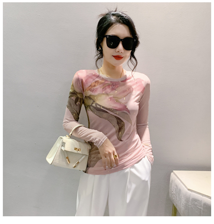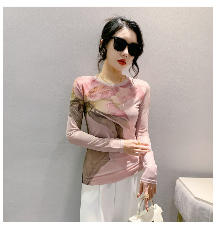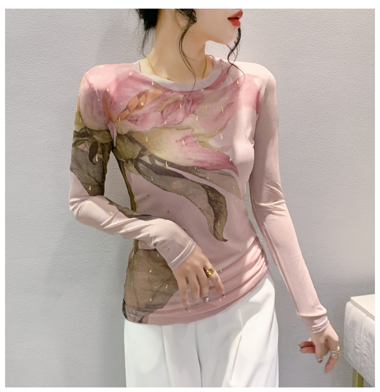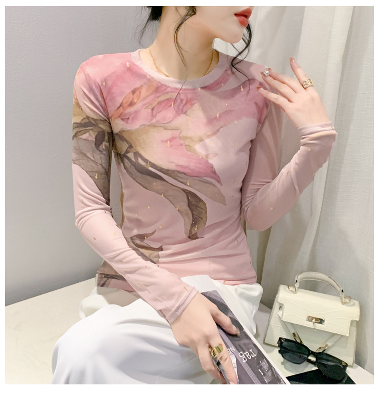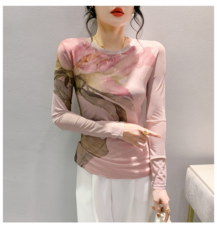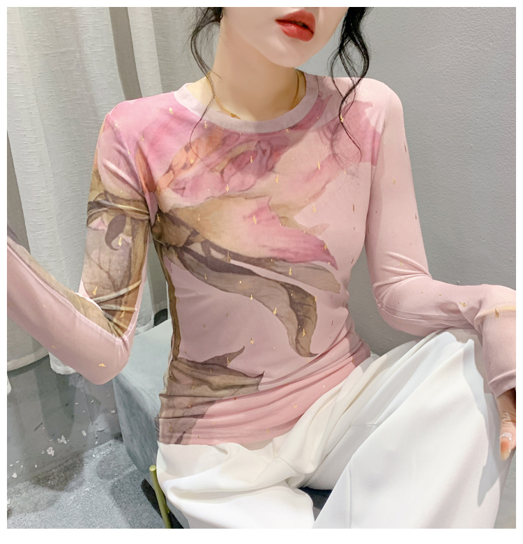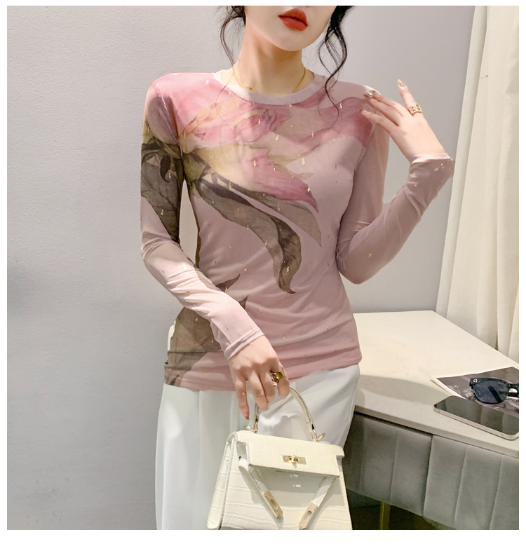 유럽 여성 의류 2024 봄과 여름 패션 서양식 긴 소매 라운드 넥 메쉬 티셔츠 여성용 브론징 포지셔닝 플라워 티셔츠 탑스토어 가기