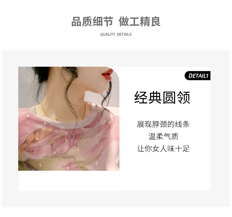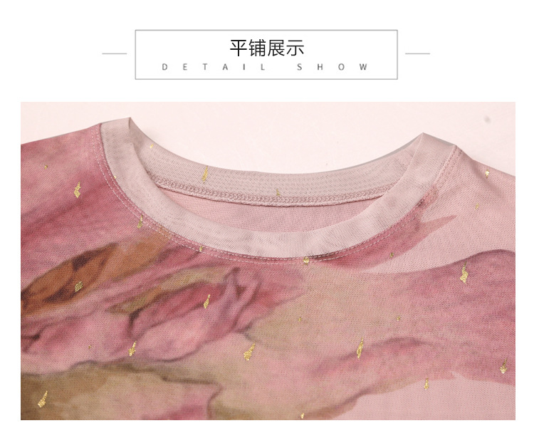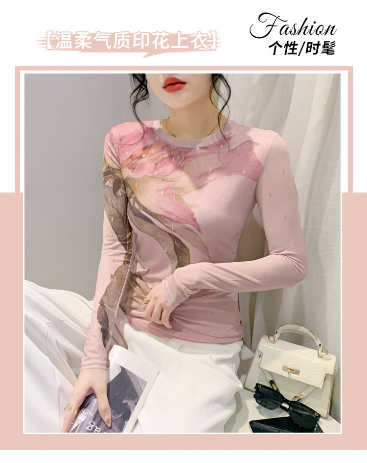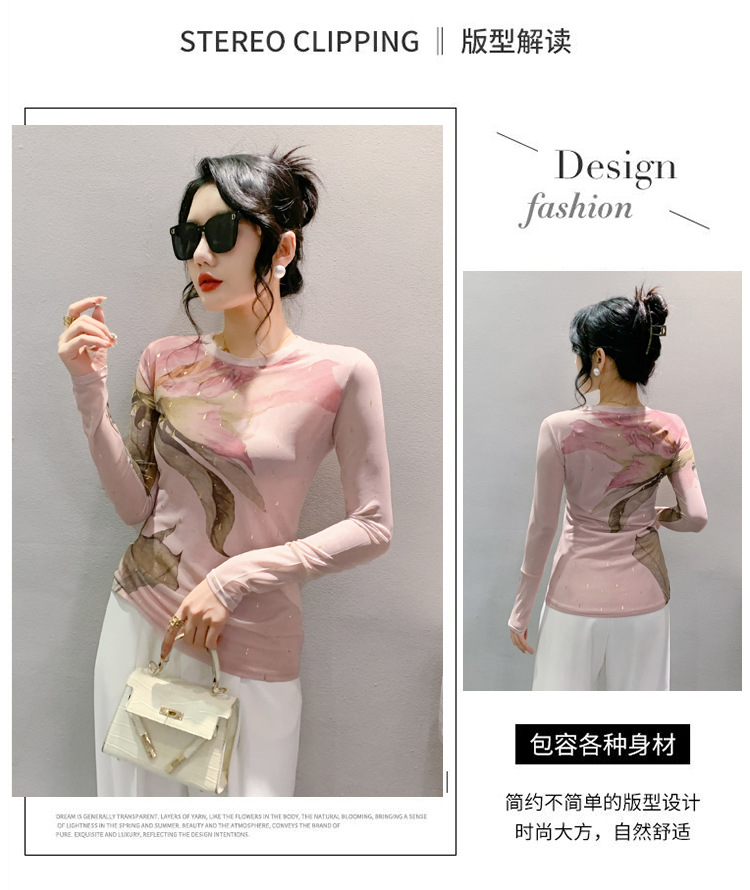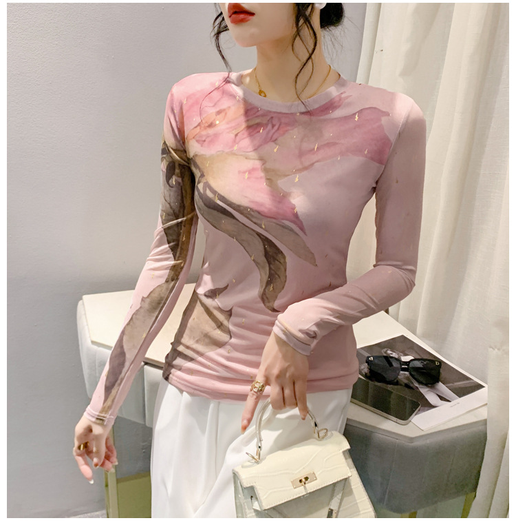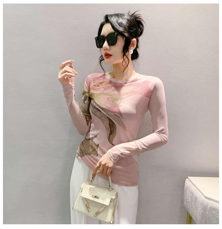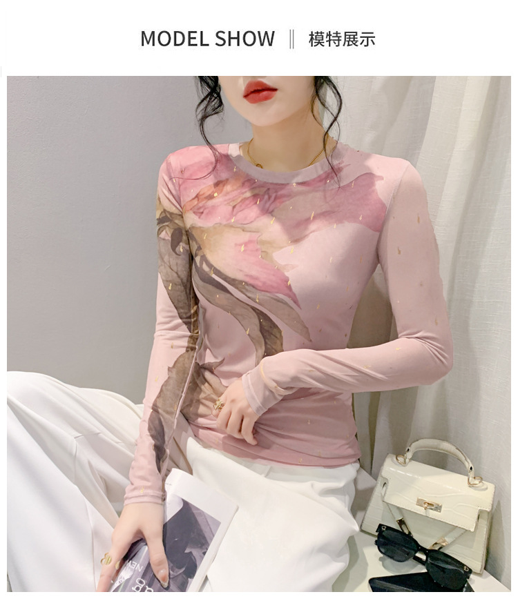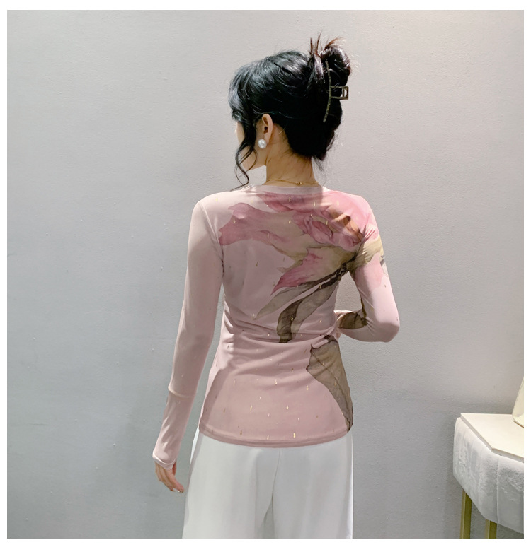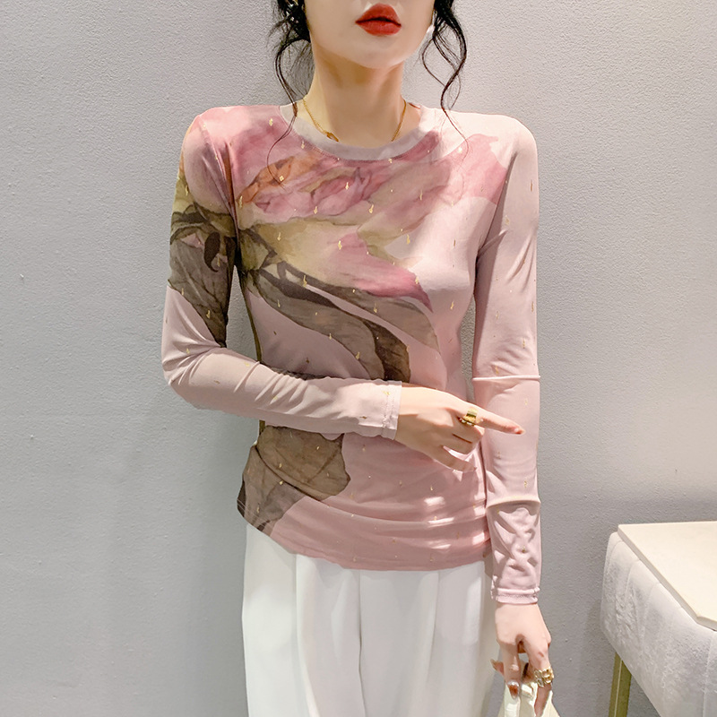 유럽 여성 의류 2024 봄과 여름 패션 서양식 긴 소매 라운드 넥 메쉬 티셔츠 여성용 브론징 포지셔닝 플라워 티셔츠 탑스토어 가기