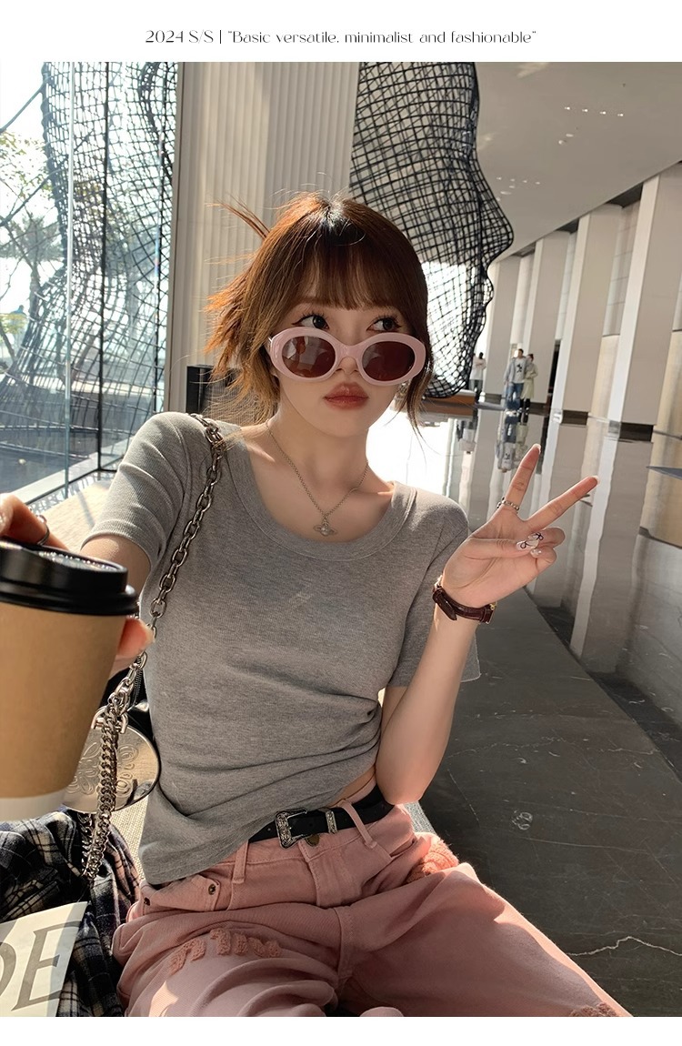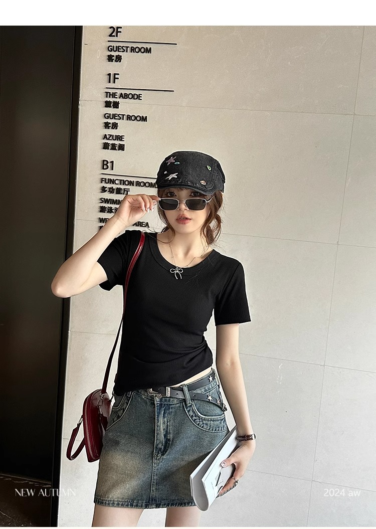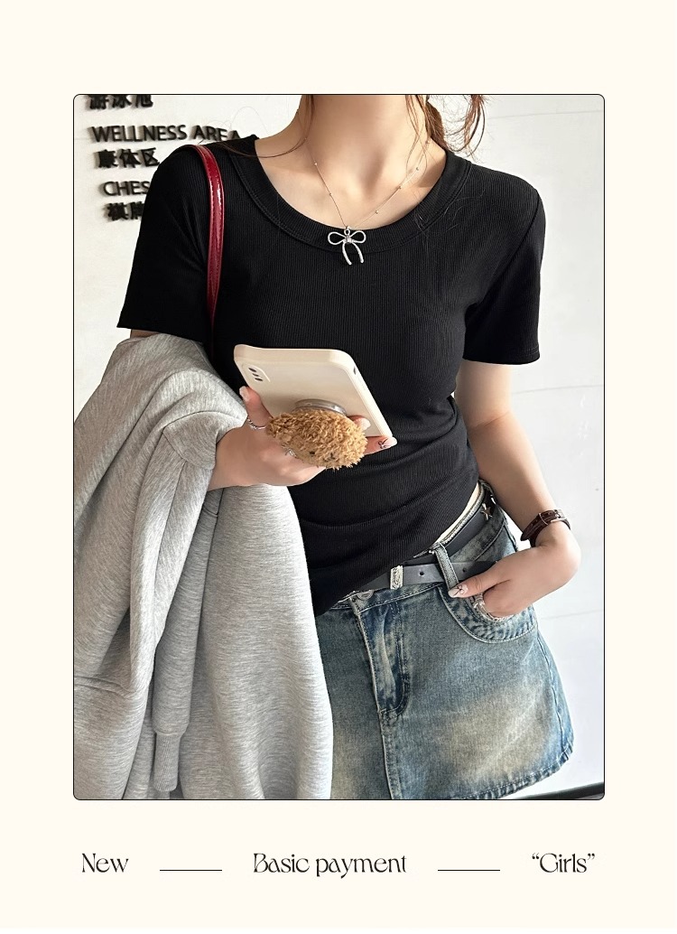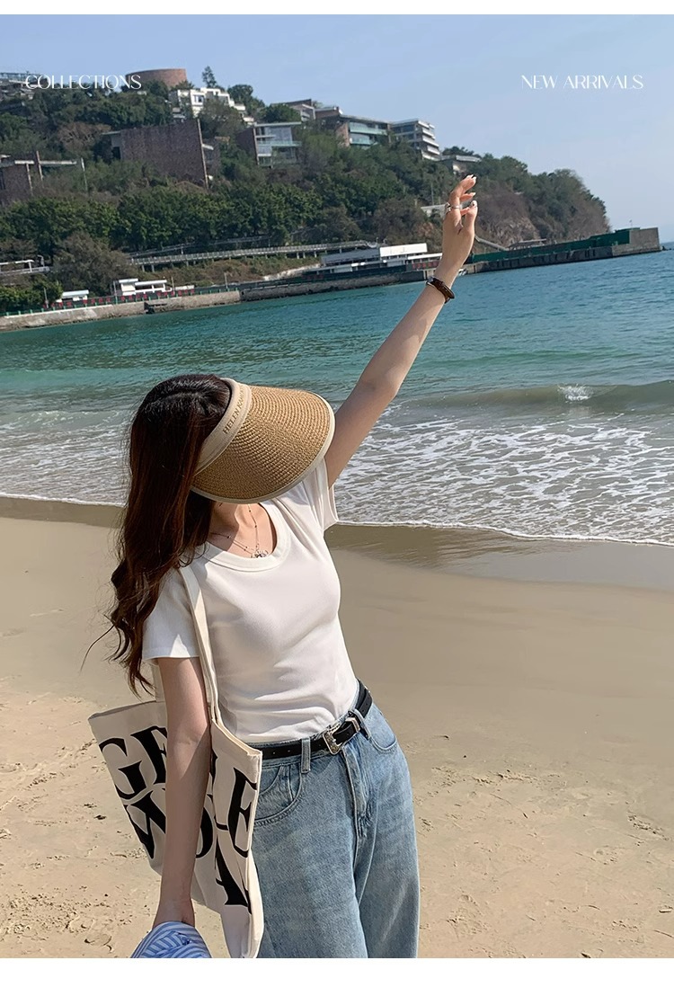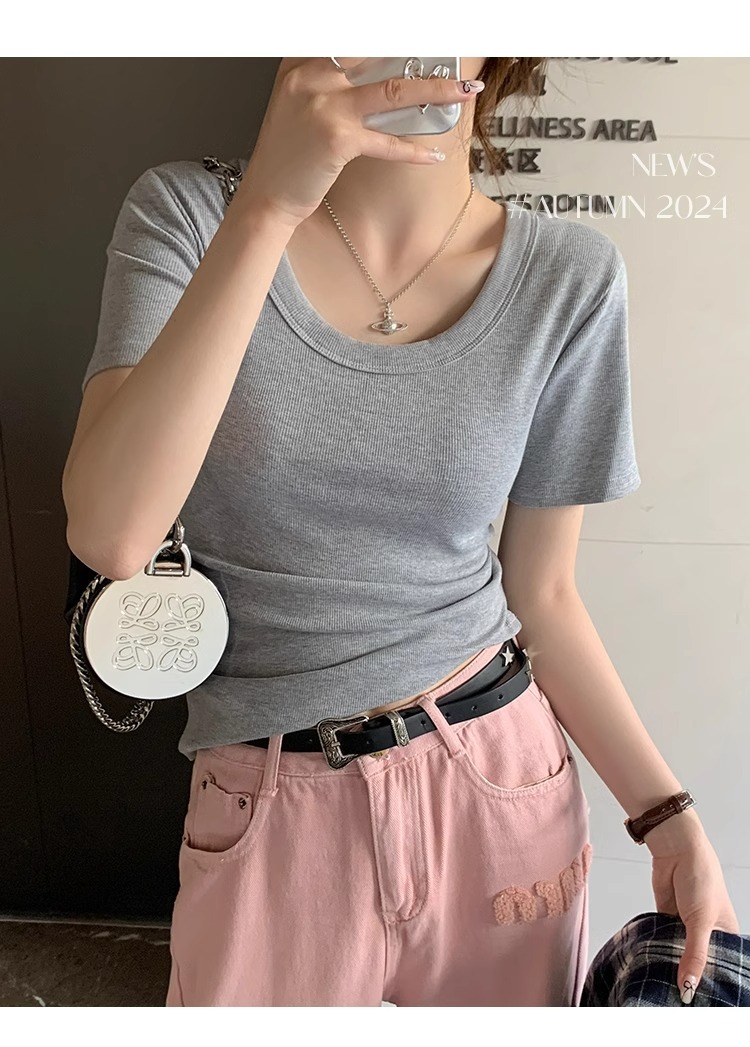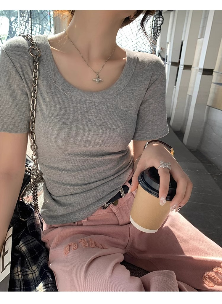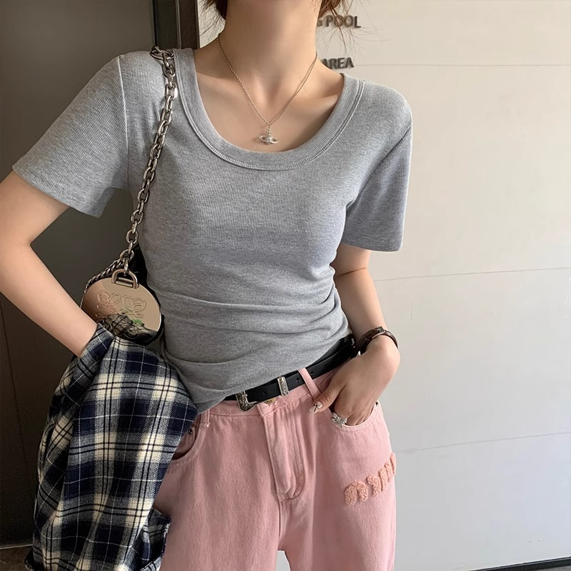 흰색 반팔 티셔츠 여성용 2024 새로운 큰 목 어깨 스레드 크루 넥 코튼 티셔츠 베이스 탑스토어 가기