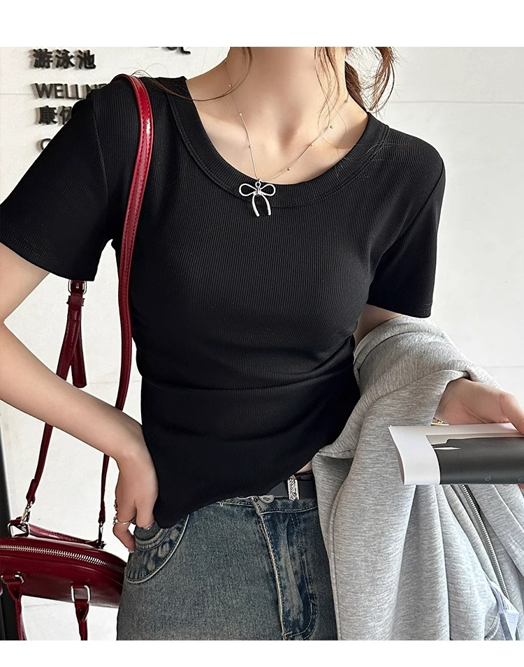 흰색 반팔 티셔츠 여성용 2024 새로운 큰 목 어깨 스레드 크루 넥 코튼 티셔츠 베이스 탑