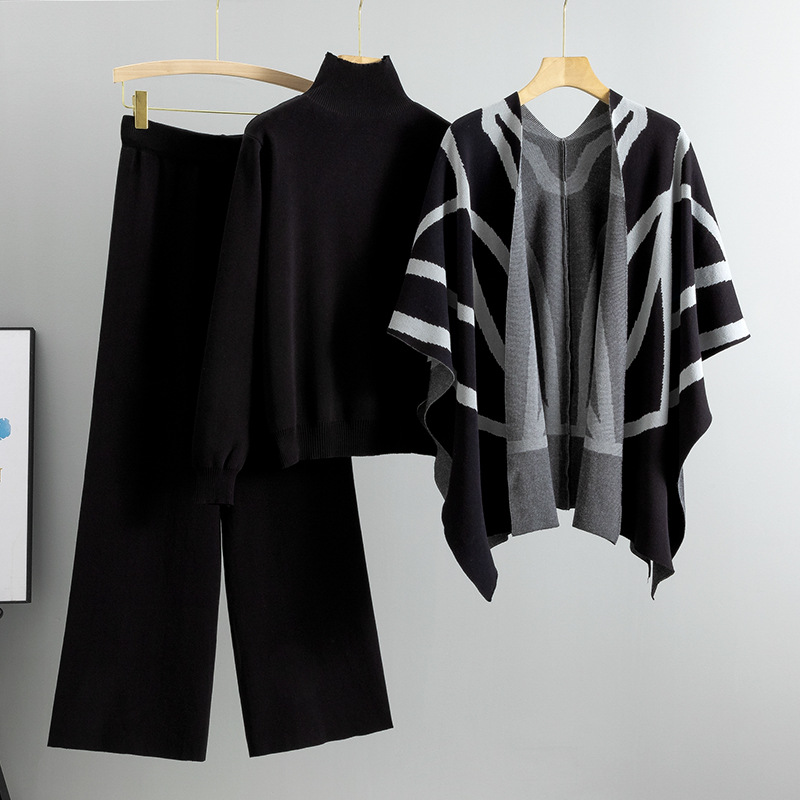 여성용 가을 겨울 신상품, 캐주얼 세트, 레이지 스타일 니트 스웨터, 숄, 망토, 와이드 팬츠 3종 세트